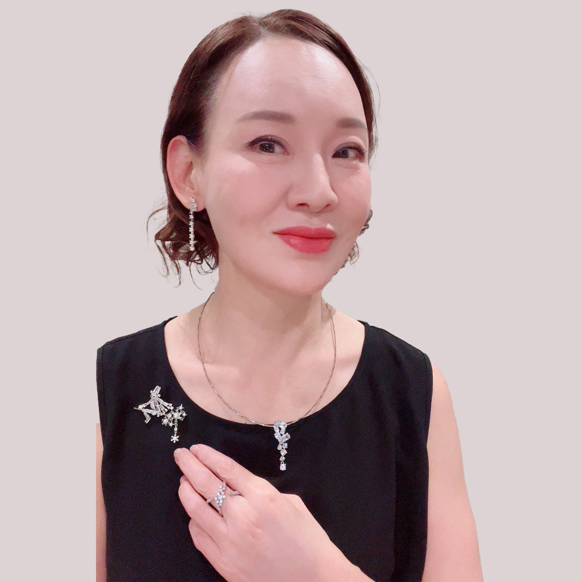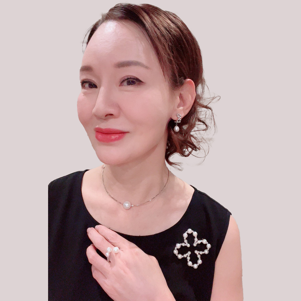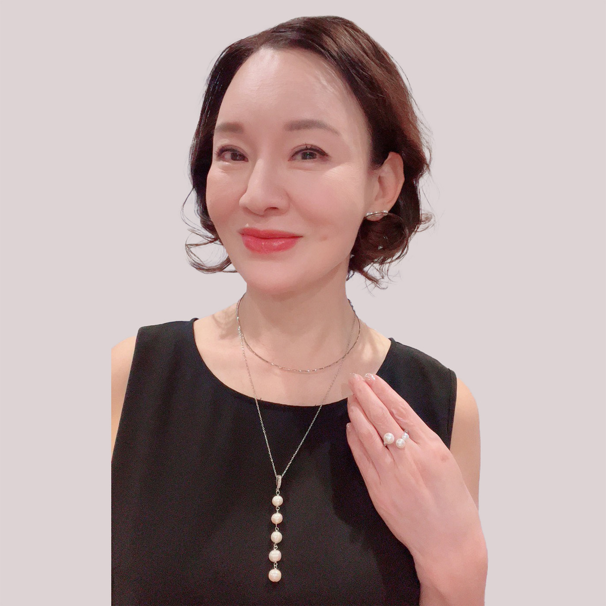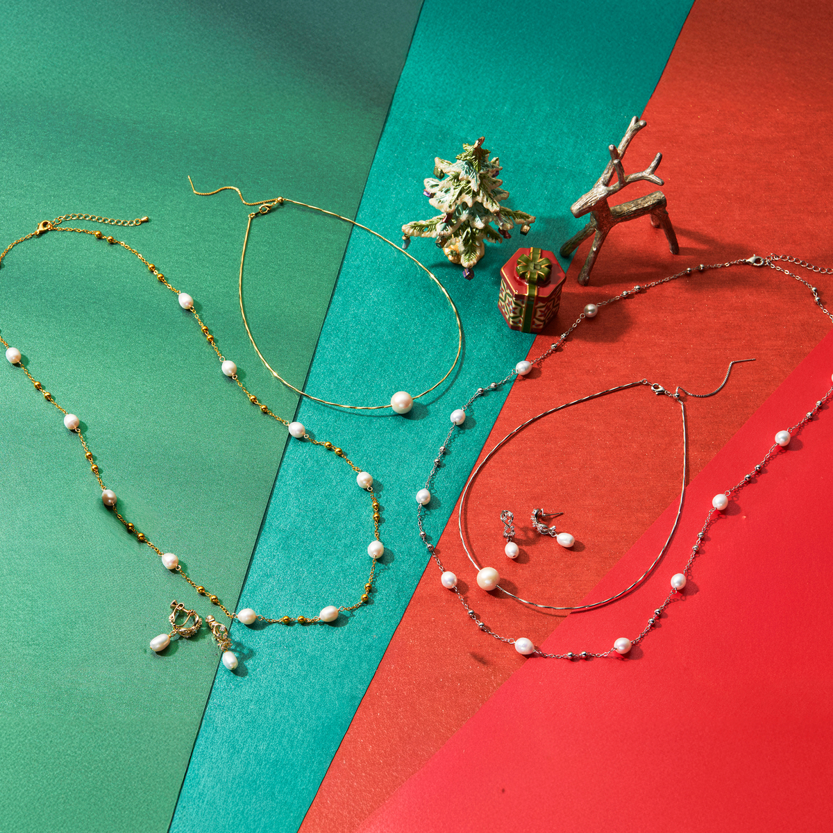 オメガネックレス、ロングステーションネックレス、イヤリングまたはピアスの3点セット。淡水パールの上品な輝きが装いに華やかさを添え、普段使いから特別なシーンまで幅広く活躍します
