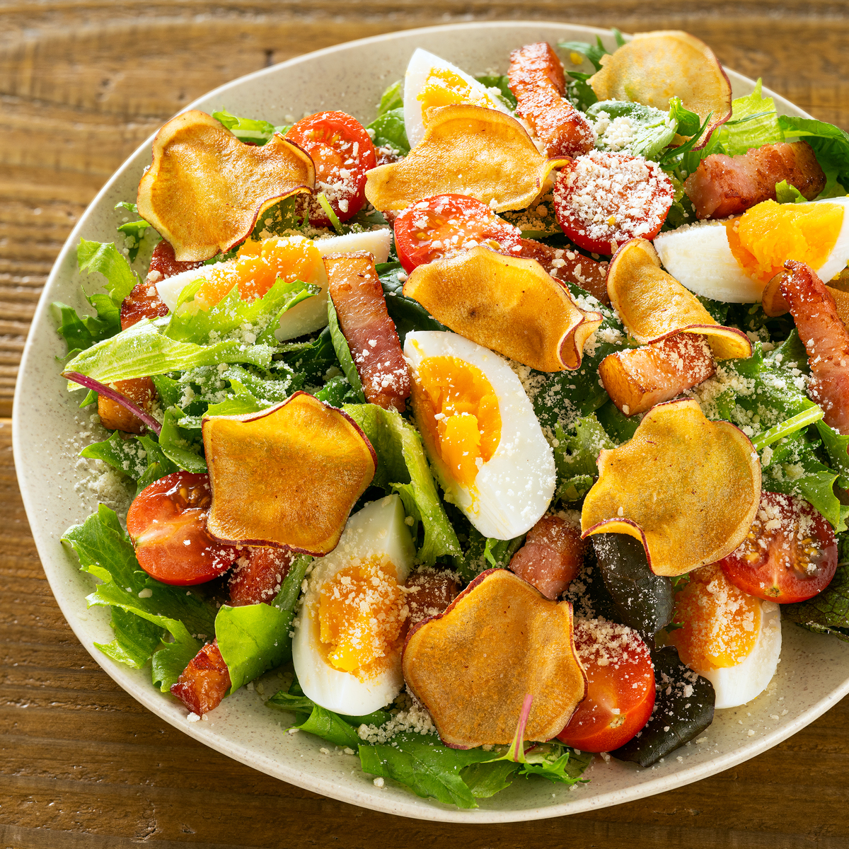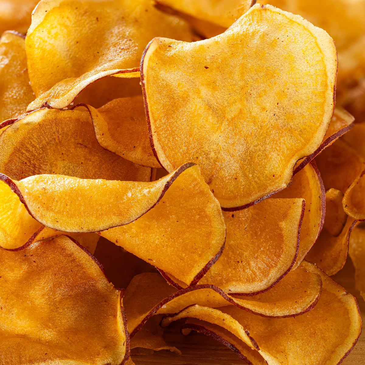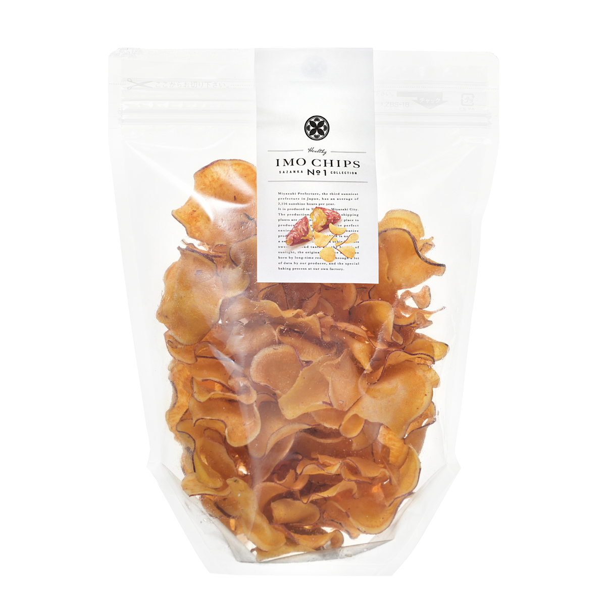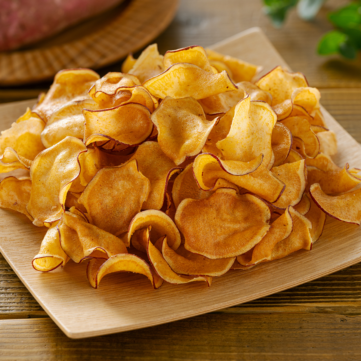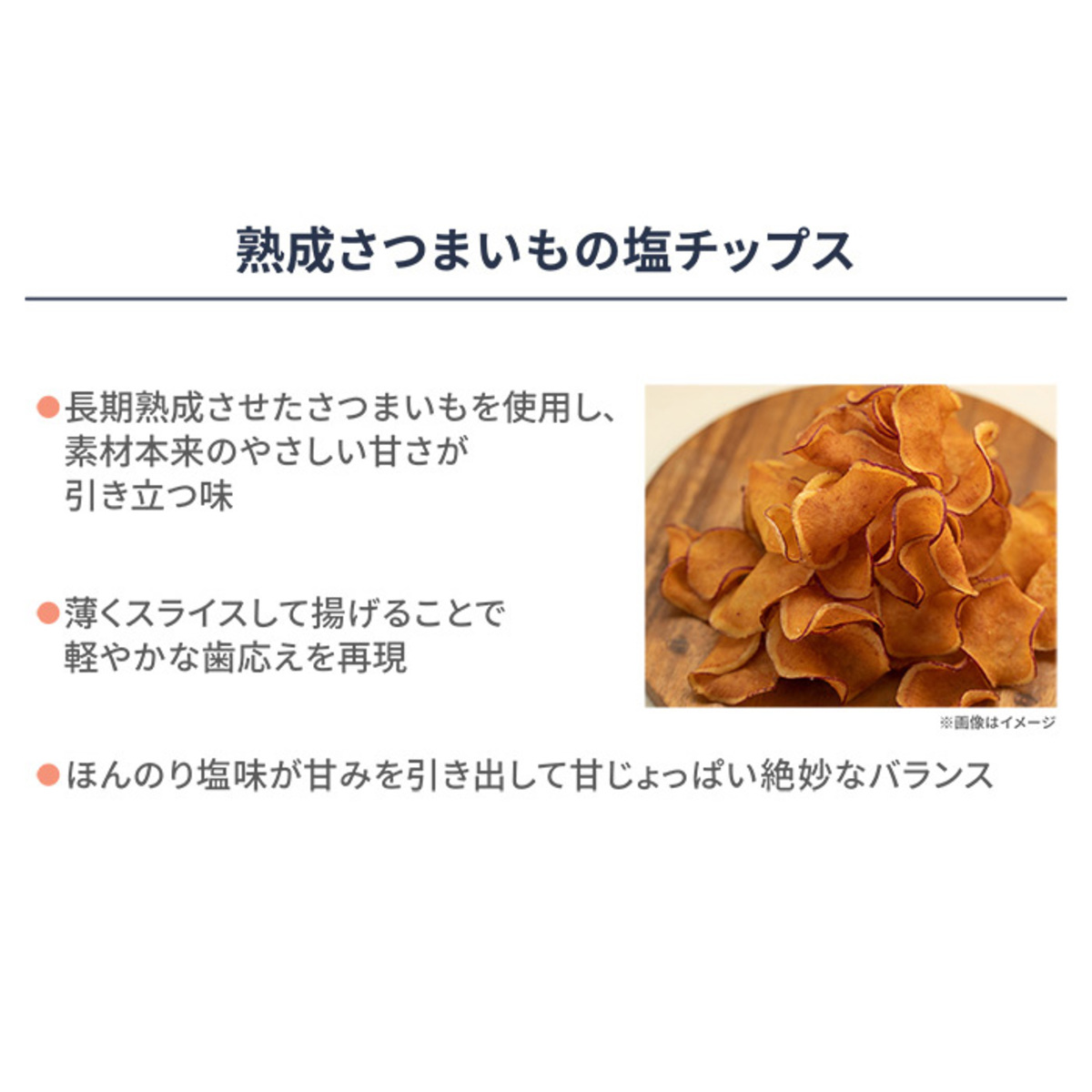長期熟成(3か月)させた宮崎県産のさつまいもを使用した塩チップス。ほんのり塩味が甘みを引き出して、甘じょっぱい絶妙なバランスです。薄くスライスして丁寧に揚げることで、軽やかで心地よい歯ごたえをお楽しみいただけます