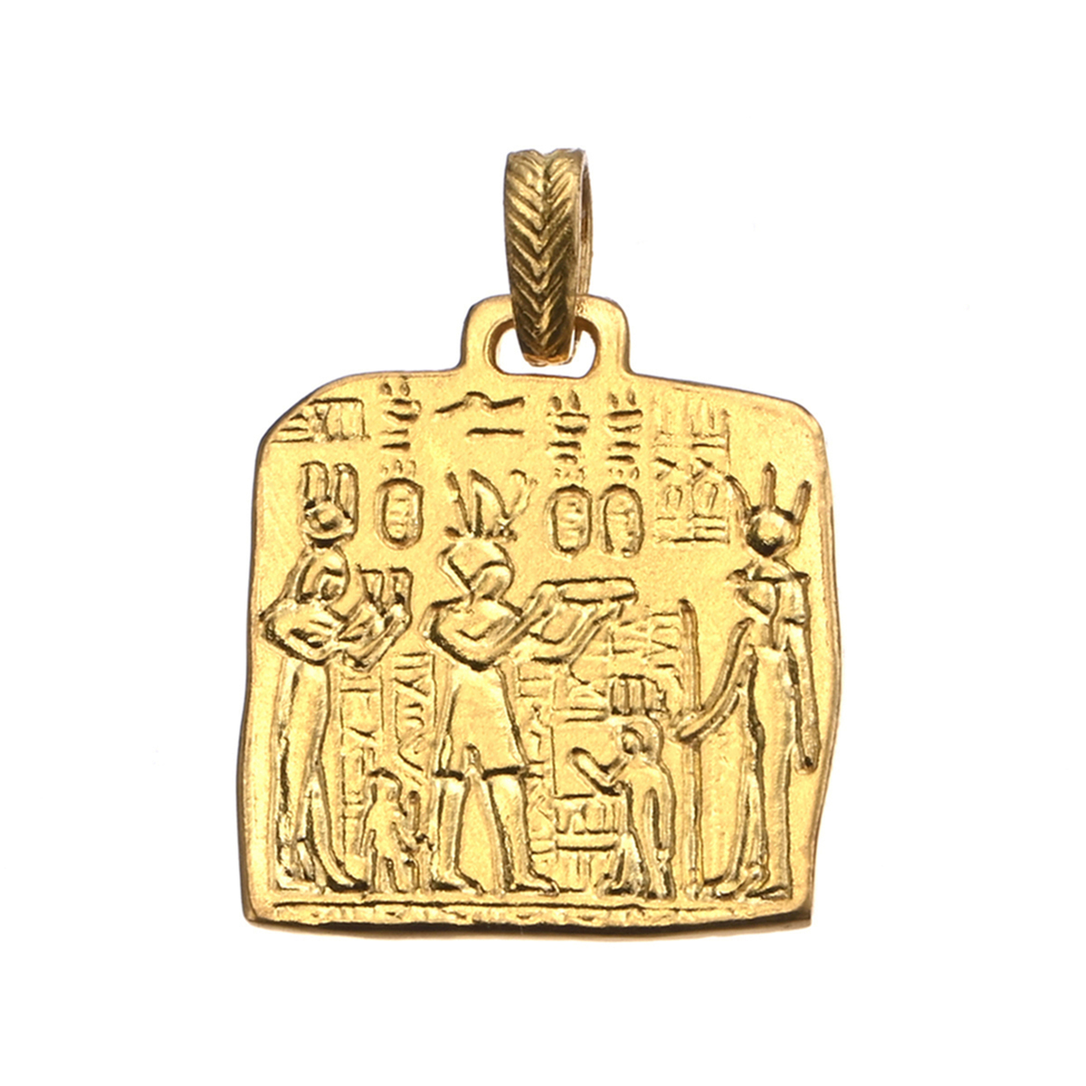 デンデラのハトホル神殿にあるクレオパトラのレリーフを忠実に再現した作品。クレオパトラとその息子カエサリオンが、神々にお供え物を捧げている様子が描かれています