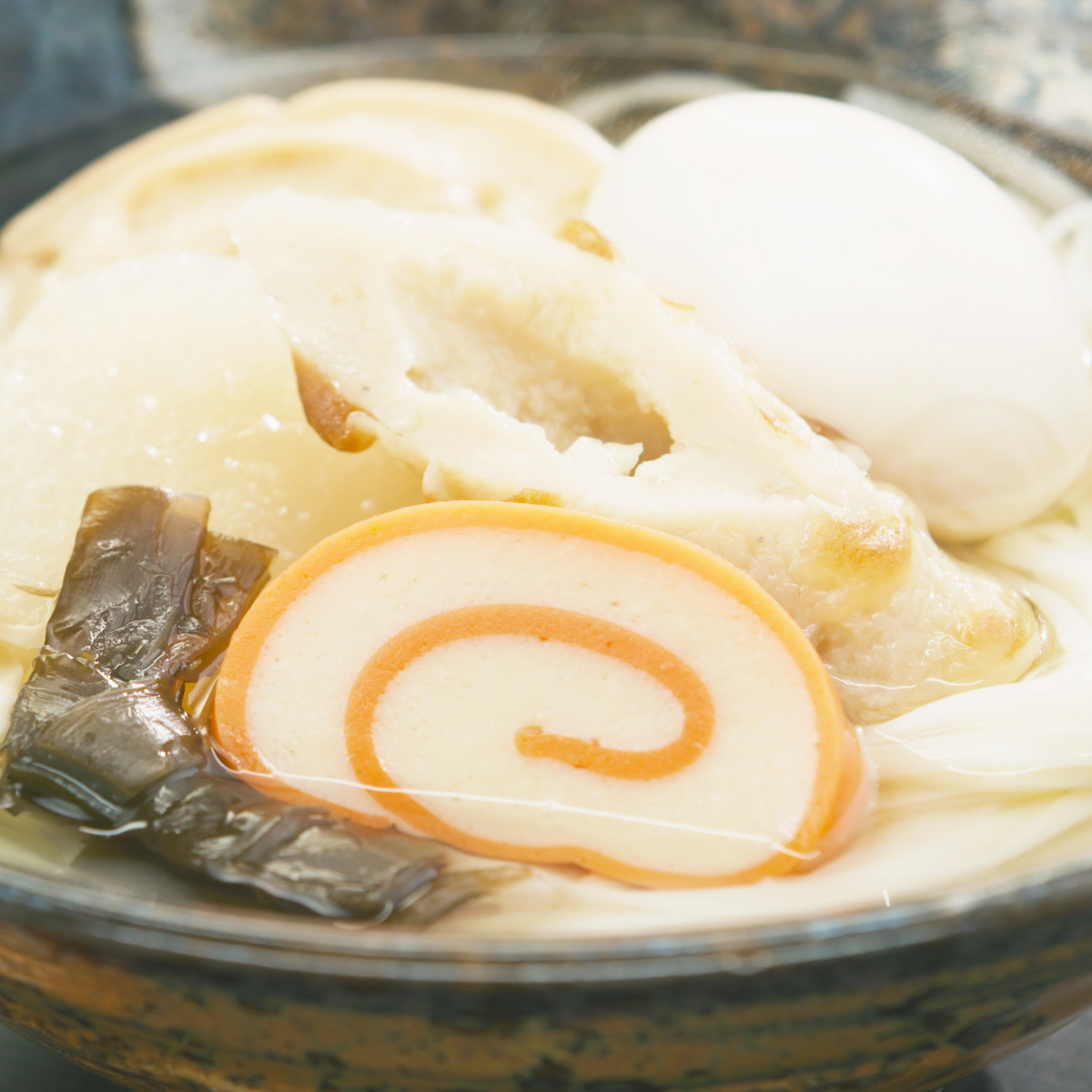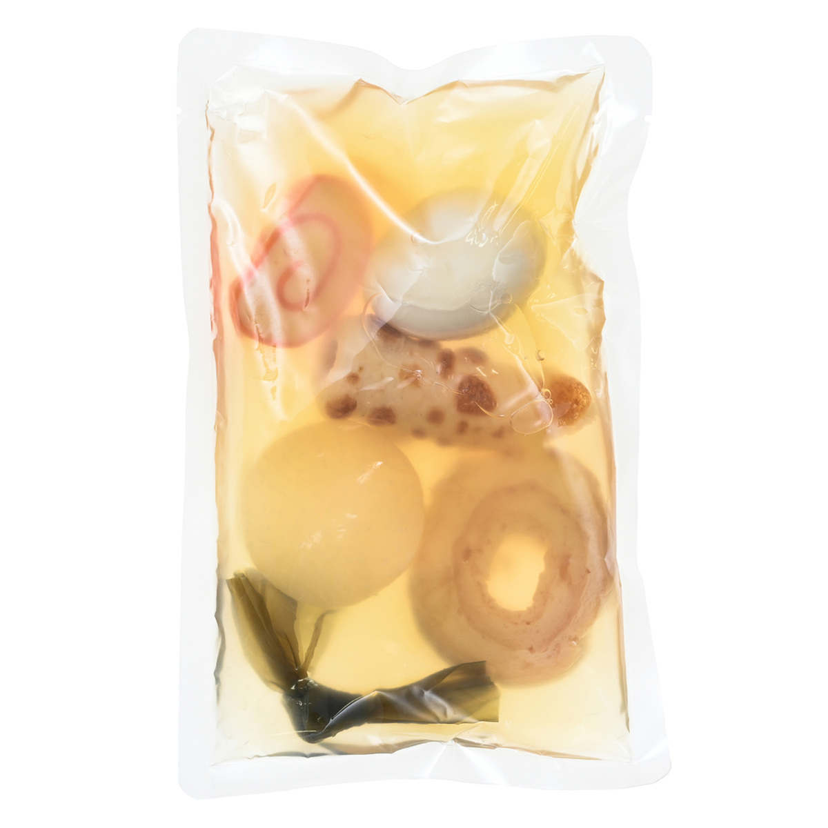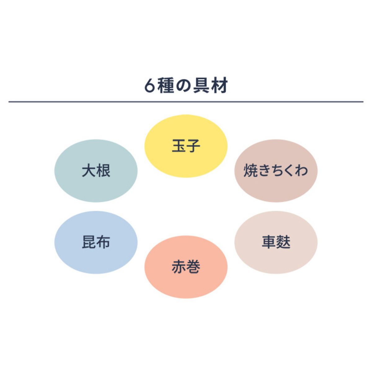 昆布とかつおのあわせ出汁に、人気具材の玉子と大根、北陸特有の赤巻蒲鉾と車麩を入れた金沢風おでん。そのままで、または袋のまま湯せんや鍋に移して温めるだけで美味しくお召し上がりいただけます
