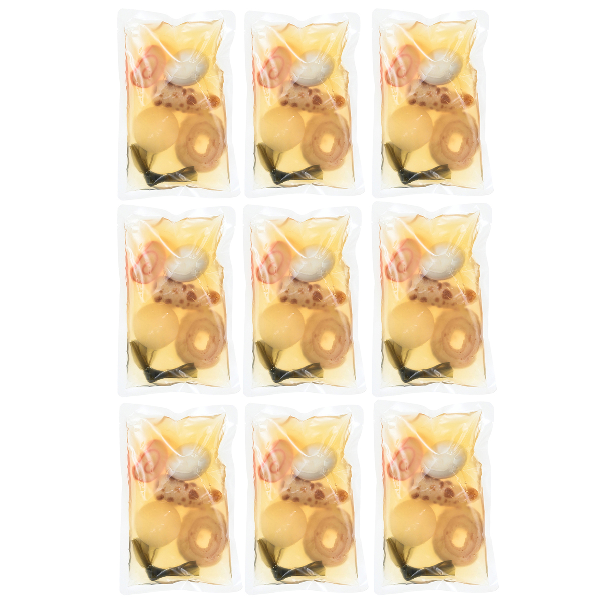 [アレルギー物質特定原材料8品目] 卵、小麦 [内容量] 420g(おでん具材136g、だし284g)×9袋 [賞味期限] 出荷時点で賞味期限まで60日以上ある商品をお届けします [保存方法] 開封前:直射日光を避け、冷暗所にて保存してください 開封後:お早めにお召し上がりください [お召し上がり方] ・個包装のままお湯で温めてお召し上がりください 温め方:袋の封を切らずにそのまま沸騰しているお湯に入れ、5分間湯を沸騰させたまま、温めてお召し上がりください。あるいは袋の封を切り、中身を鍋にあけて温めてお召し上がりください [注意事項] ※本品の魚肉ねり製品に見られる黒い生地は魚の皮で、異物ではございません ※電子レンジでの加熱は、玉子が破裂する恐れがあり危険ですので、おやめください ※袋のまま温める場合は、中身が熱くなりますので、開封する場合はご注意ください [原料原産地] ゆで卵(国内製造) [原産国] 日本 [原材料] ゆで卵(国内製造)、だいこん、魚肉ねり製品(焼ちくわ、赤巻)(小麦・大豆を含む)、濃縮スープ(アミノ酸液調味料、砂糖、食塩、その他)、くるまふ、昆布、食塩/加工でん粉、調味料(アミノ酸等)、炭酸Ca、ソルビトール、保存料(ソルビン酸)、着色料(カラメル、カロチノイド、赤3)、pH調整剤、トレハロース、貝Ca、香料、V.E、V.A