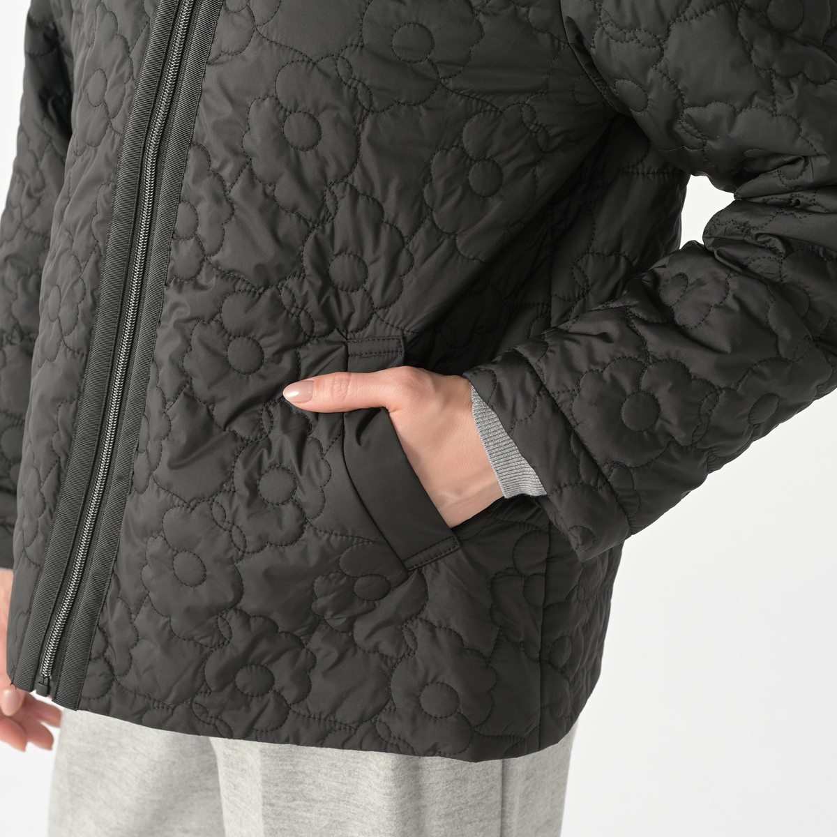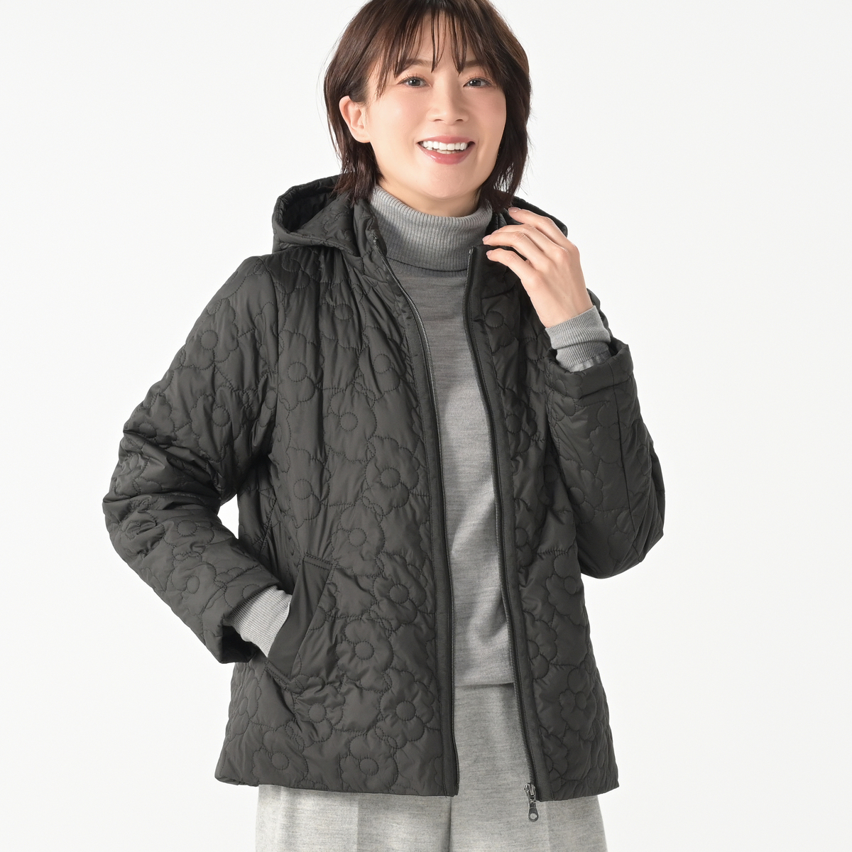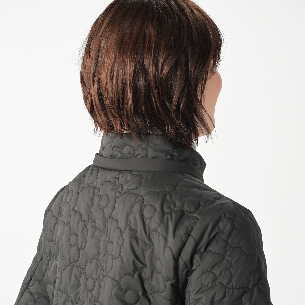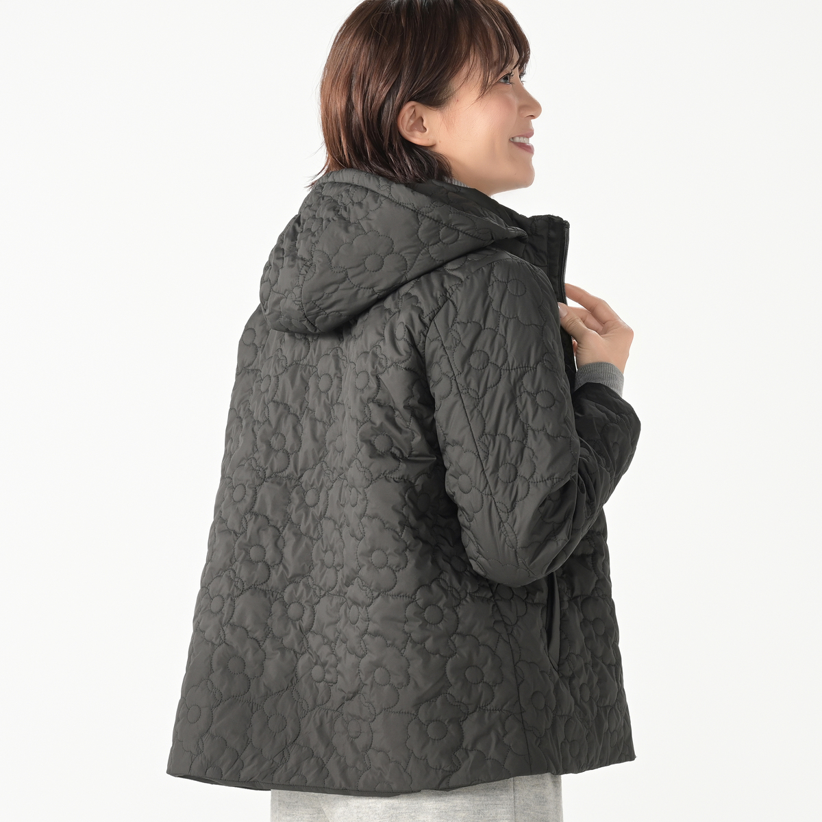 細やかなステッチが上品な印象を与える、花柄キルトの中綿ジャケット。軽やかな着心地で着ぶくれしにくく、ゆったり設計で厚手のニットの上からも羽織れます