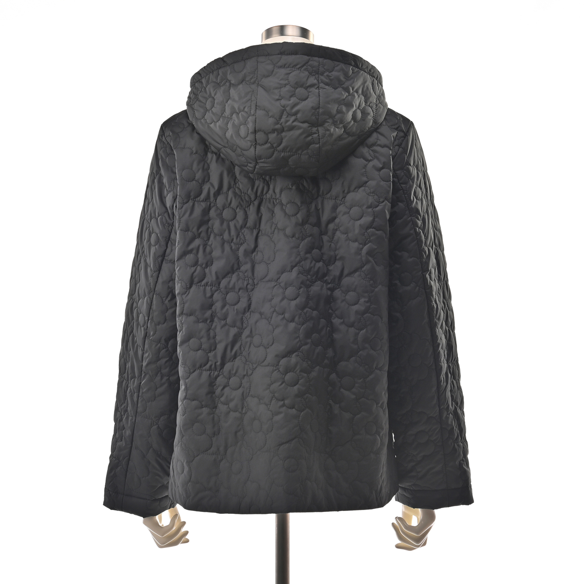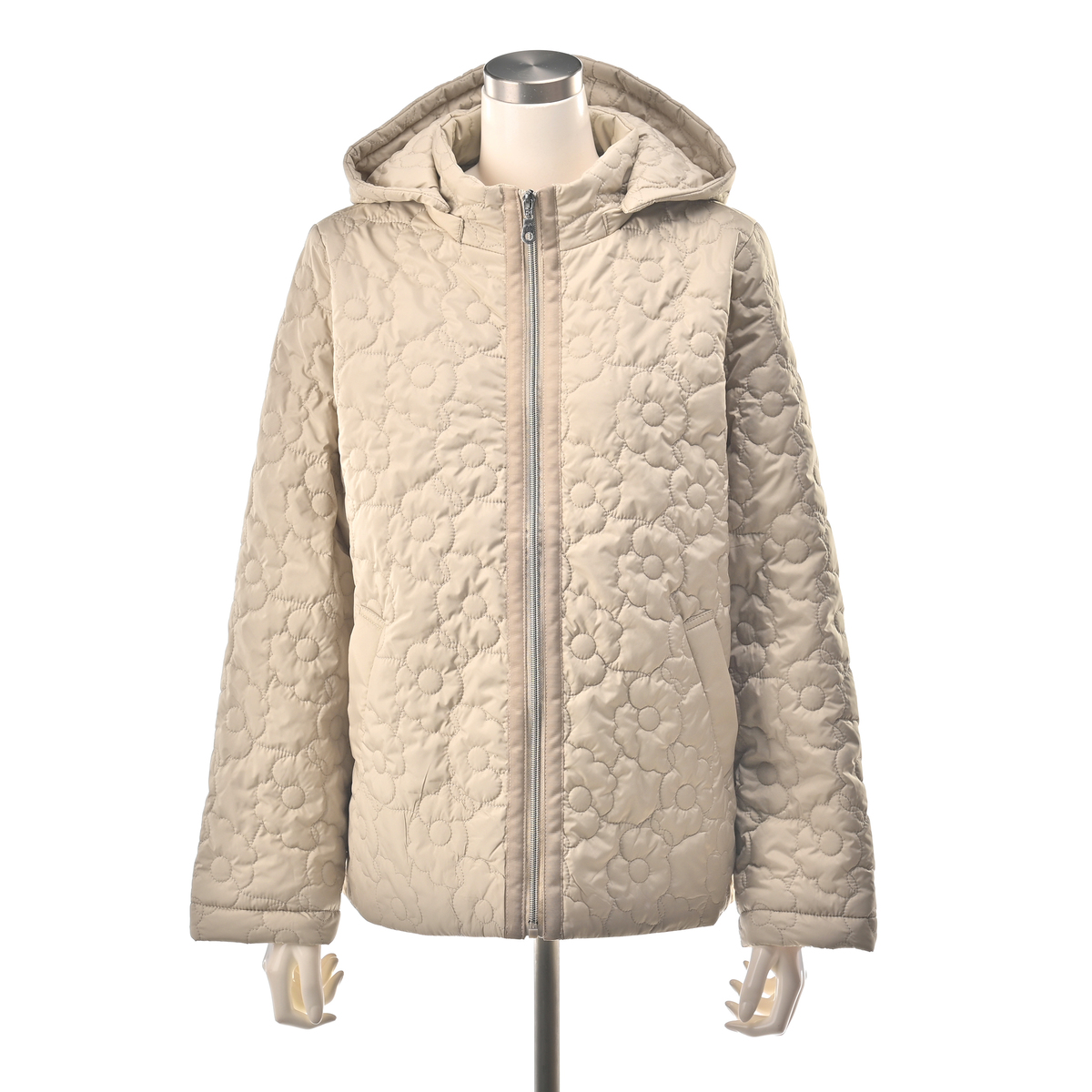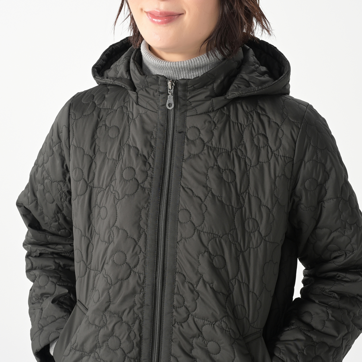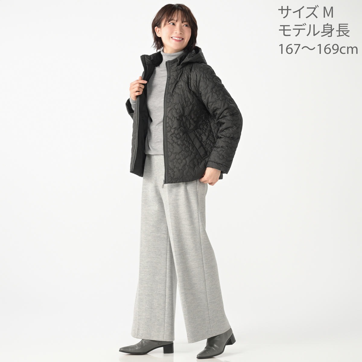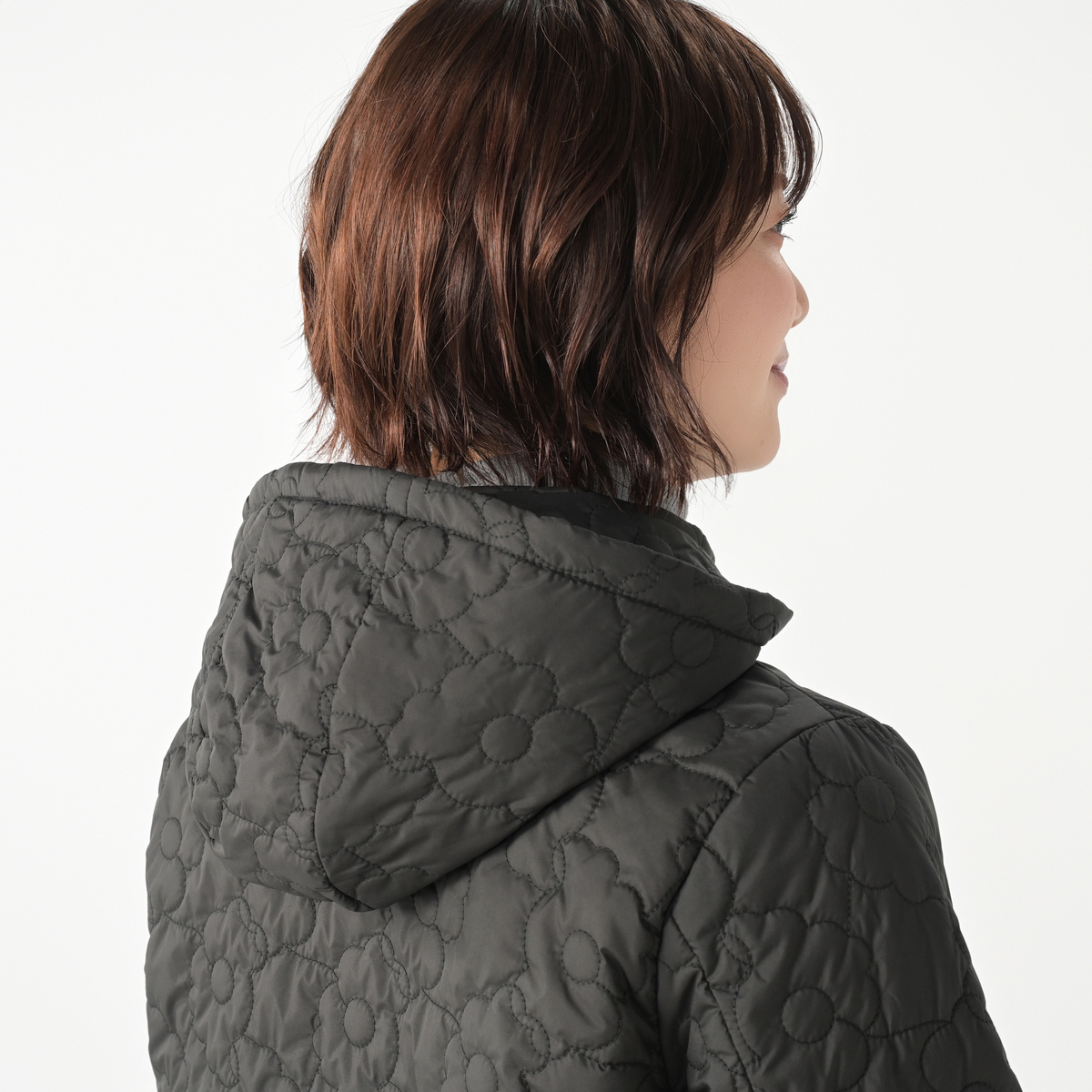 細やかなステッチが上品な印象を与える、花柄キルトの中綿ジャケット。軽やかな着心地で着ぶくれしにくく、ゆったり設計で厚手のニットの上からも羽織れます
