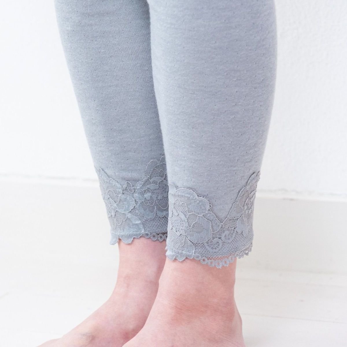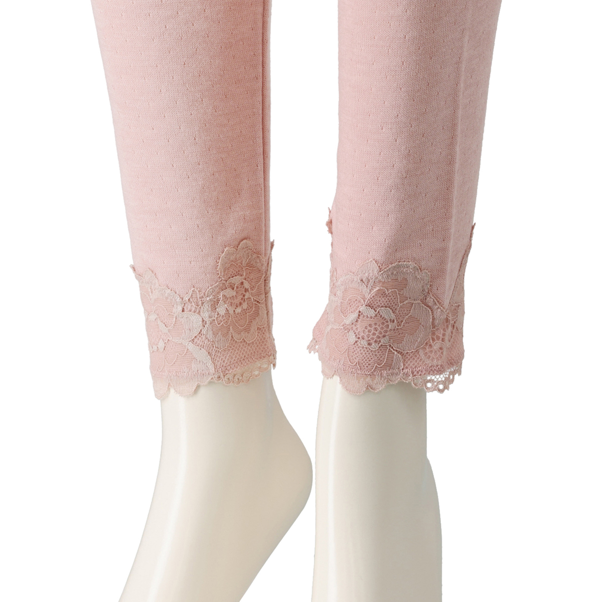 ふんわりとした接結ニット生地を使用したレギンス。程よい厚みで軽くて動きやすく、肌側もなめらかです。足口にはレースを施し、さりげないドット柄が可愛らしさをプラス。インゴム仕様のウエストで穿き心地もやさしく、股上は深めの設計に仕上げています