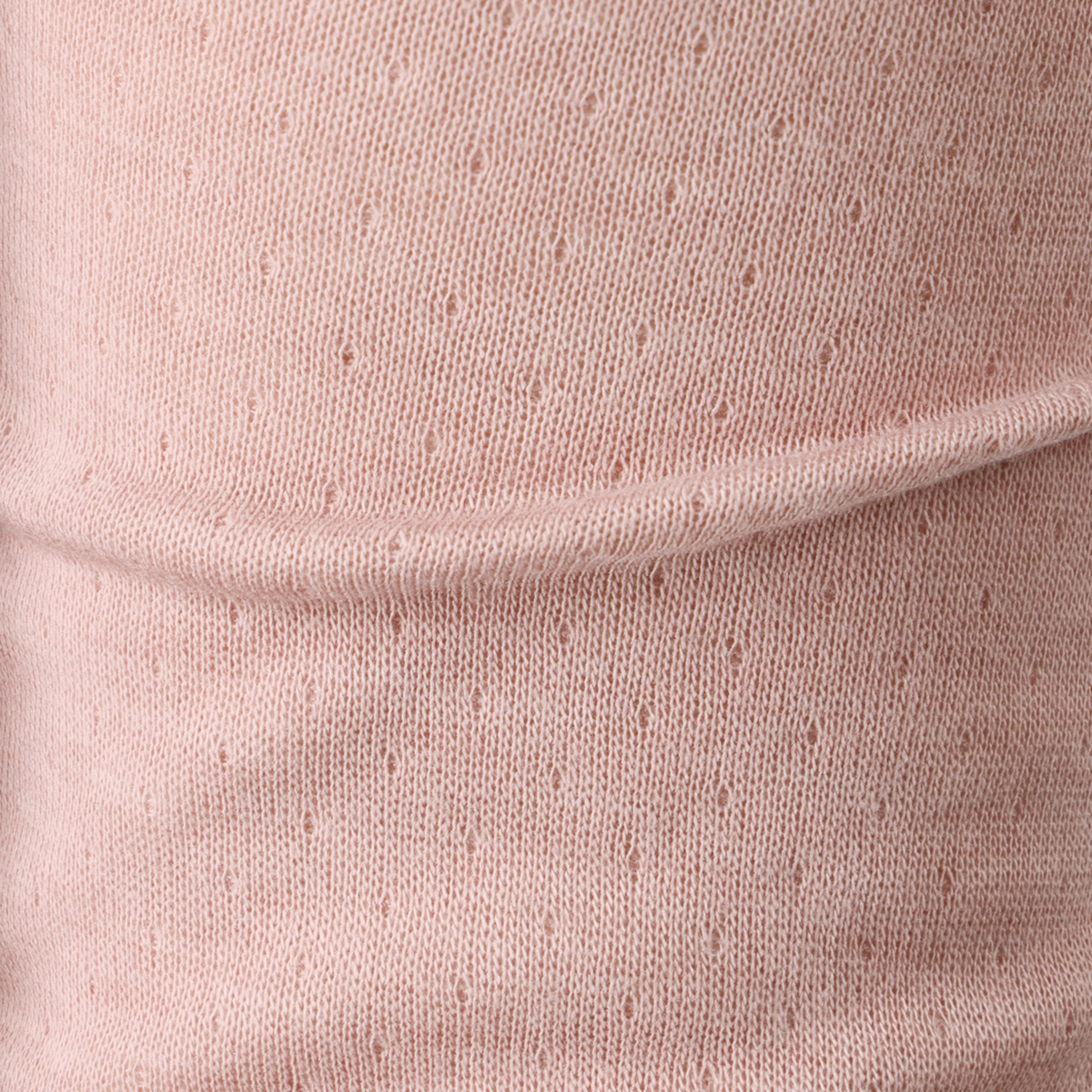 素材には保湿加工を施し、滑りがよくなめらか。接結ニットは2枚の生地の間に空気の層が生まれ、空気を含んだ暖かさがあるという特長を持ちます