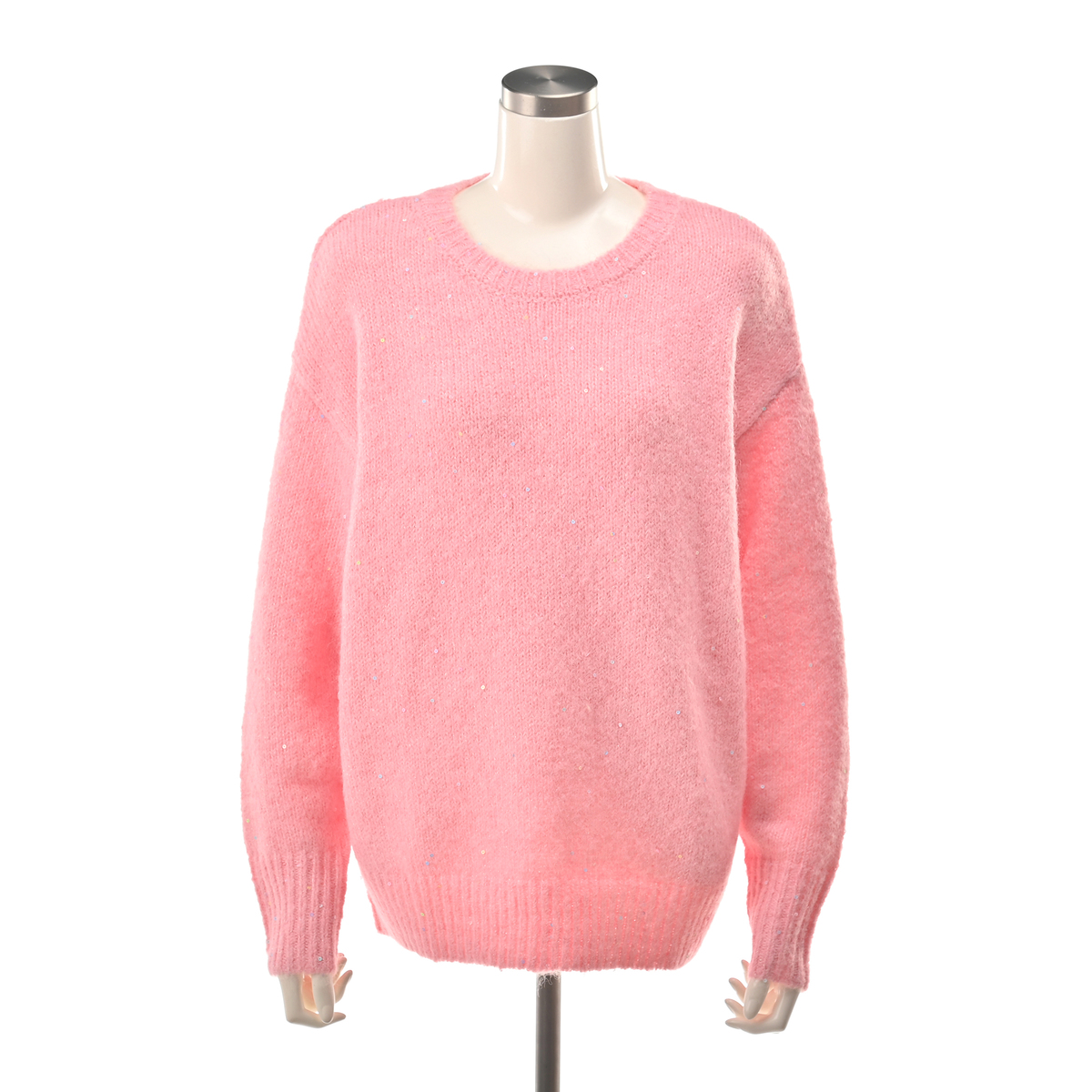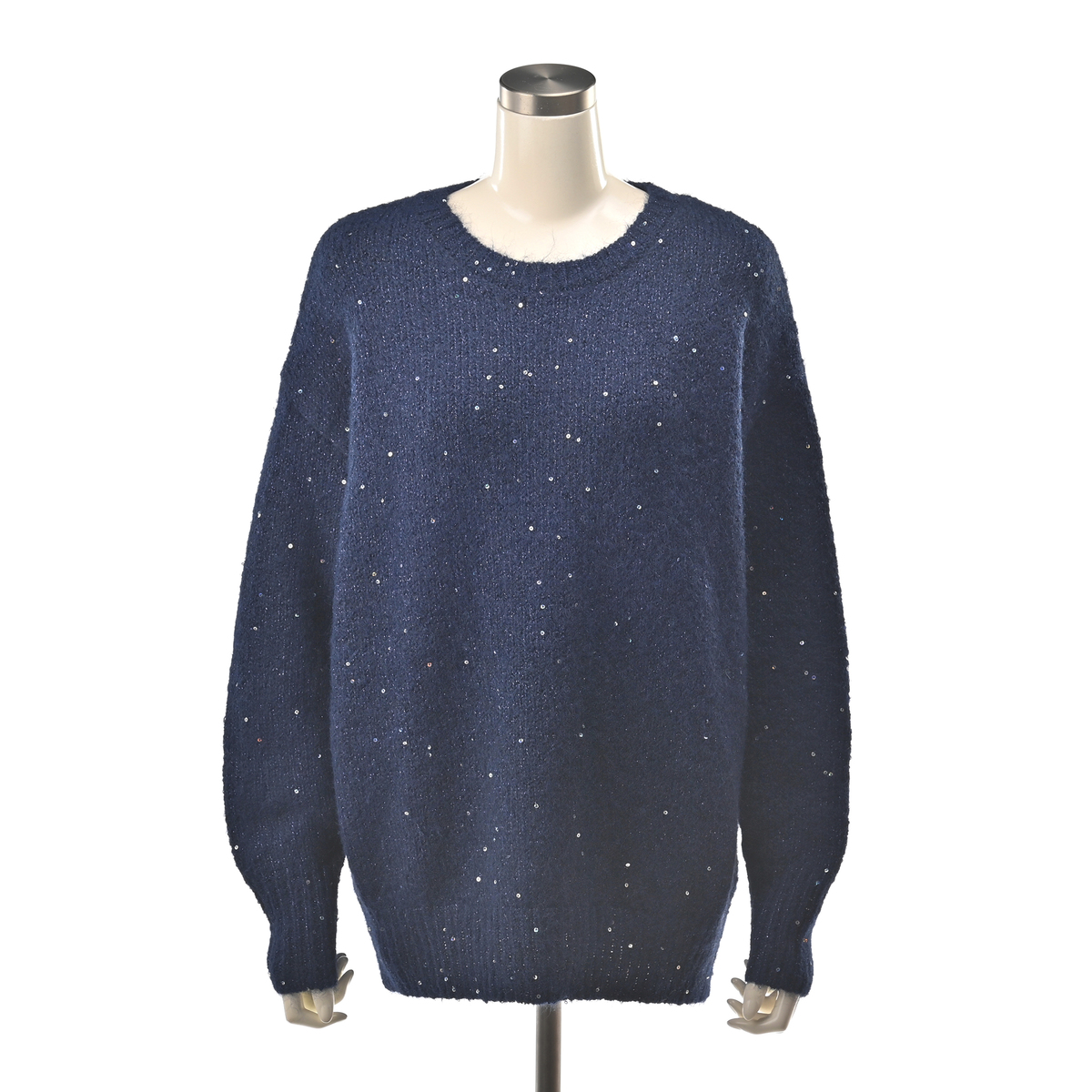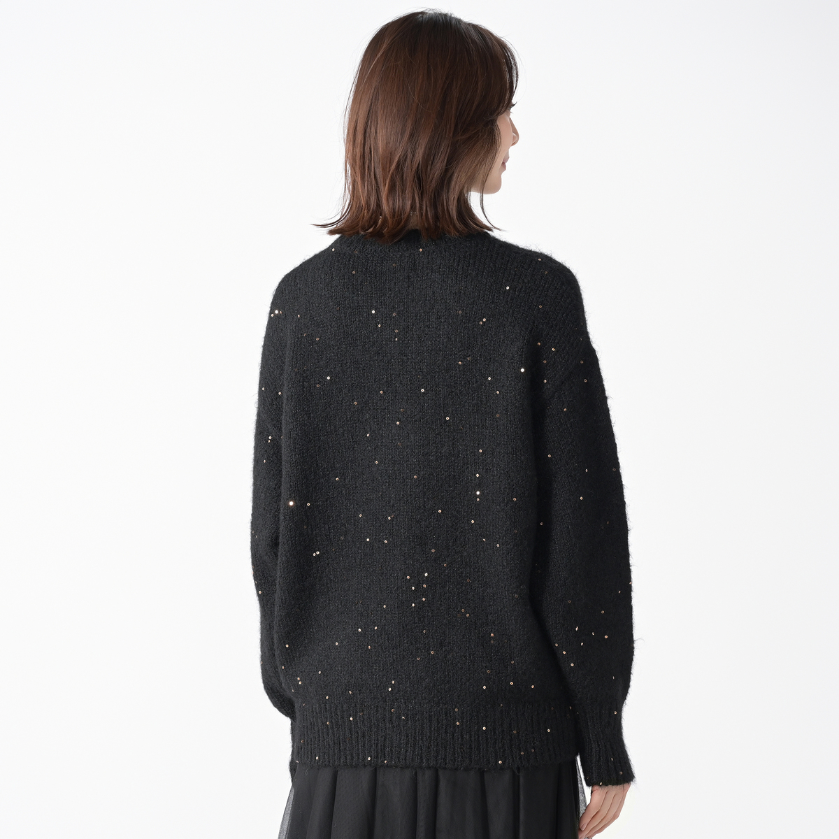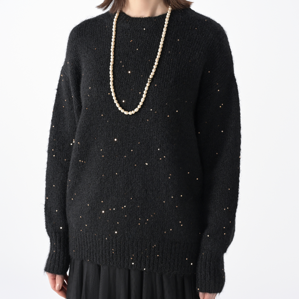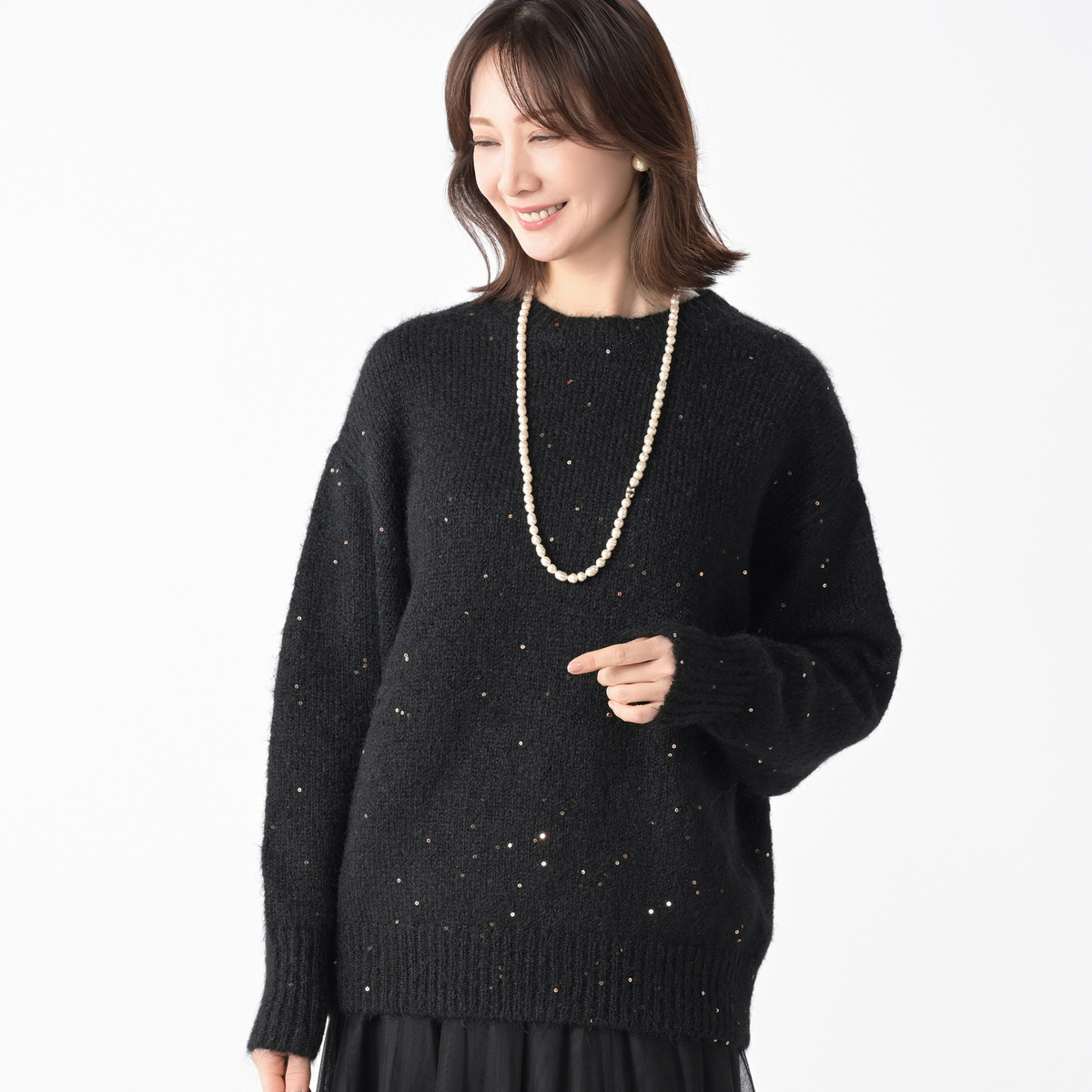 ウールミックスのスパンコールヤーンが輝く、トレンド感あふれるニットプルオーバーです
