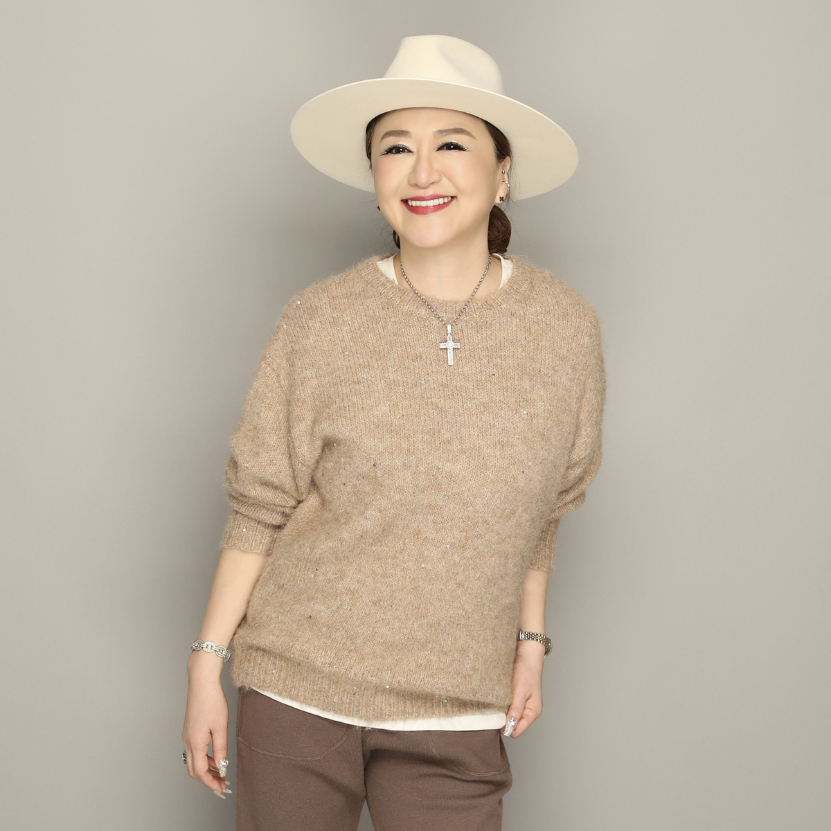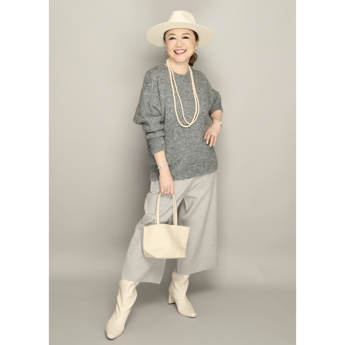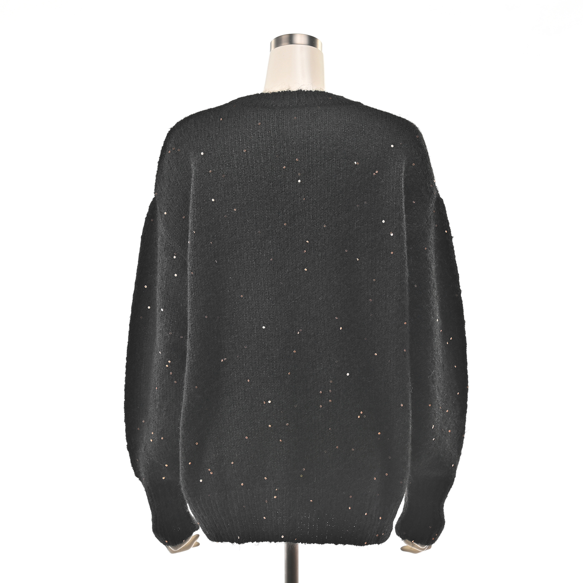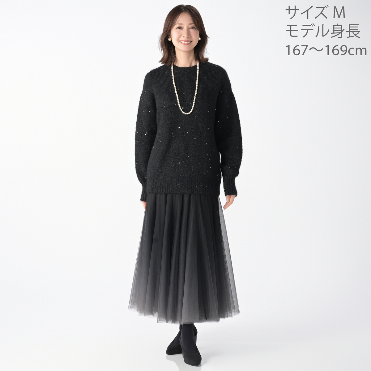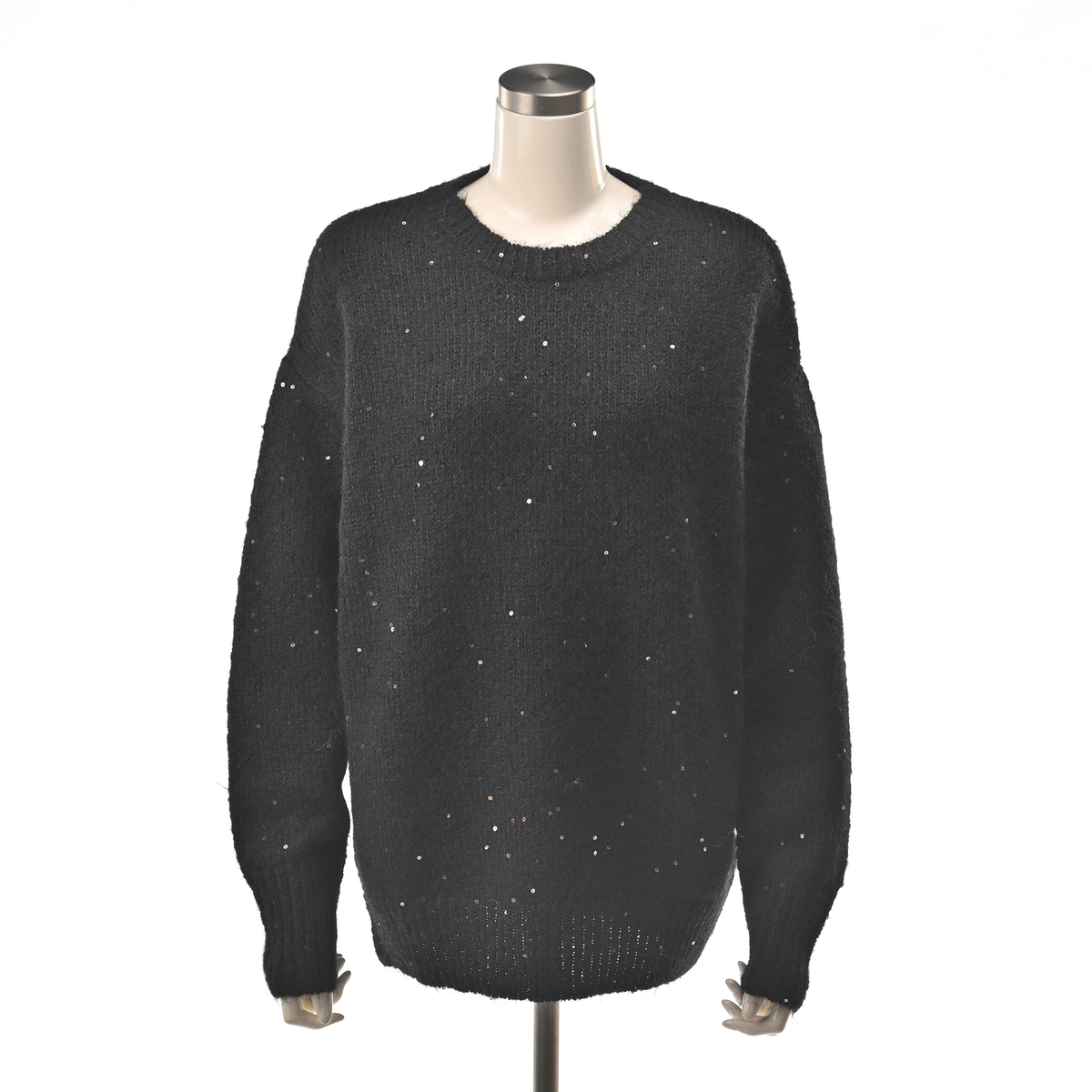 ウールミックスのスパンコールヤーンが輝く、トレンド感あふれるニットプルオーバーです