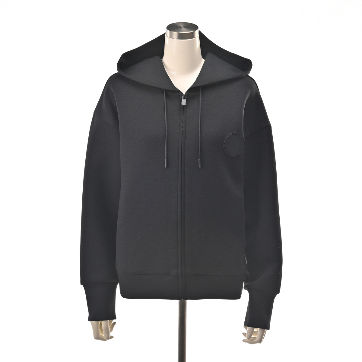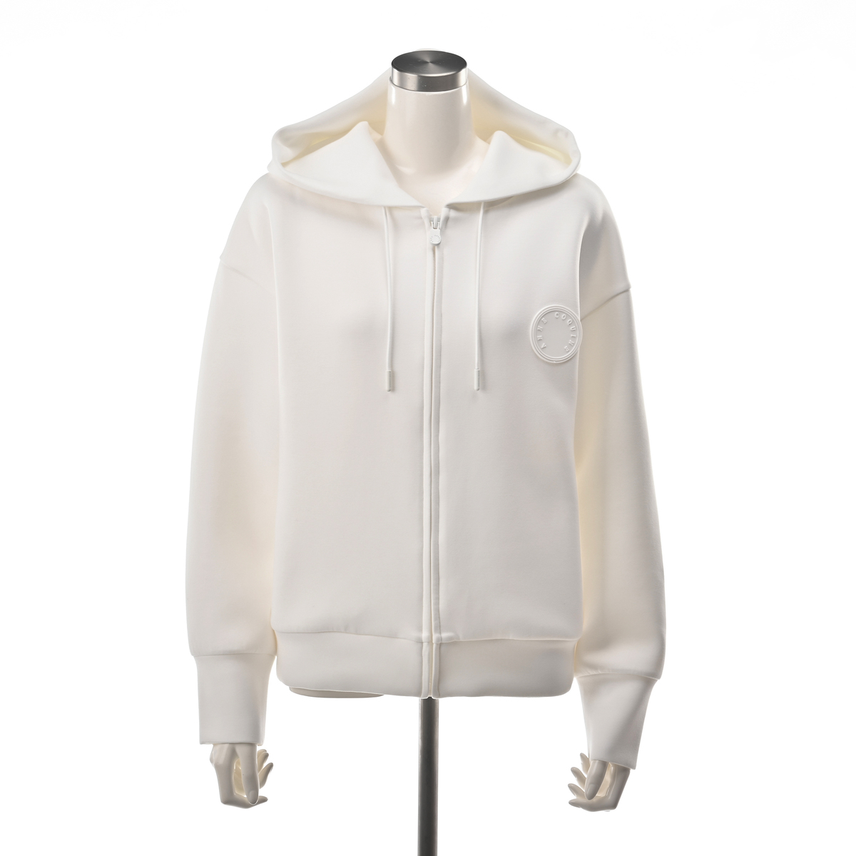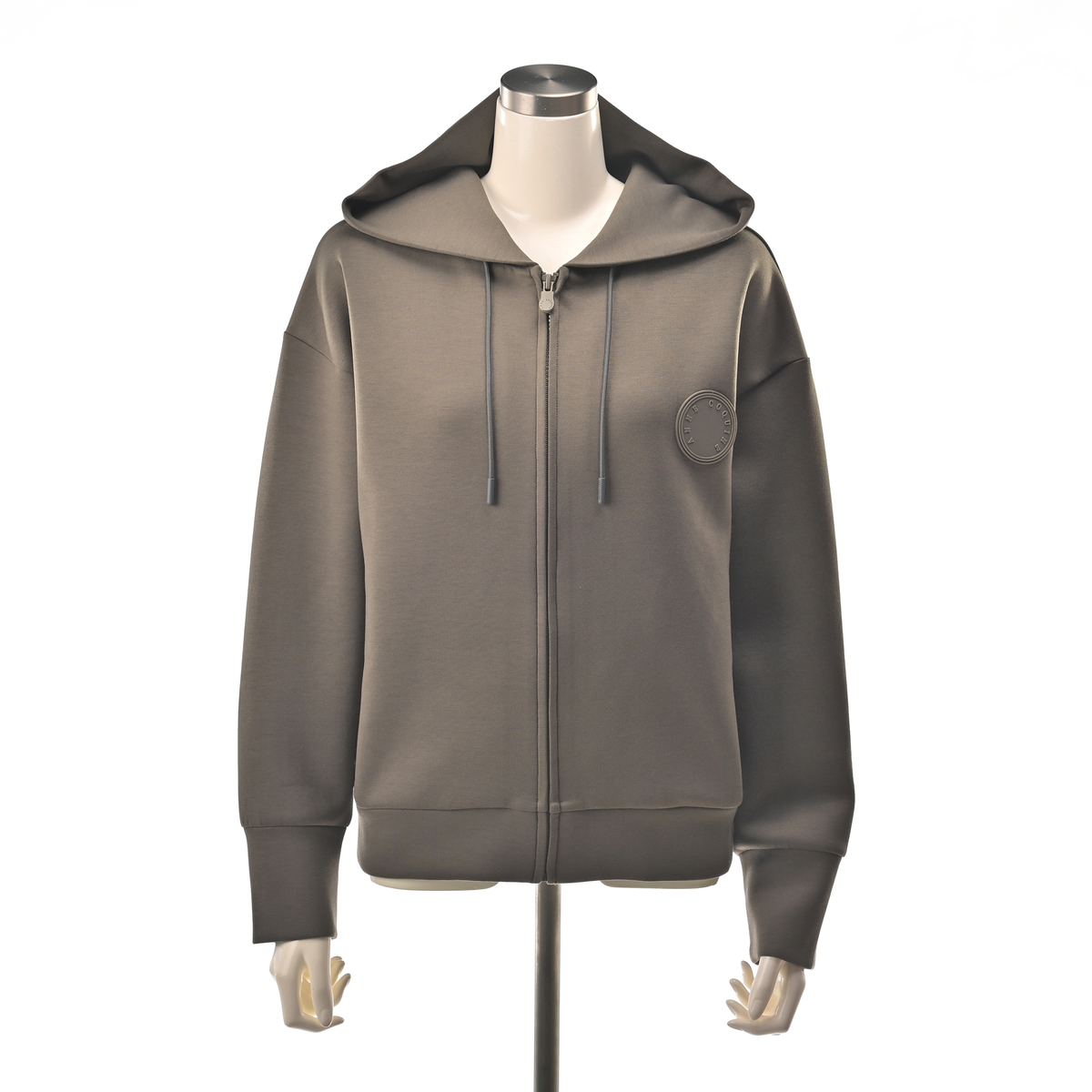 ダンボールニットを使用したジップアップパーカ。左胸にあしらった同色のロゴ入りサークルシリコンワッペンがポイントです