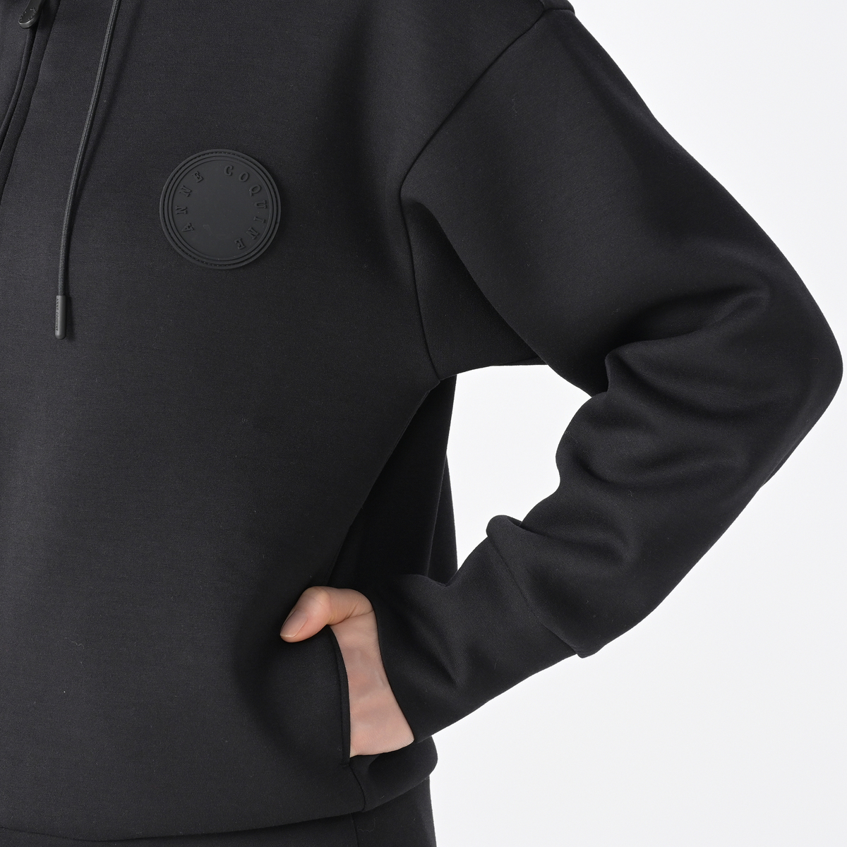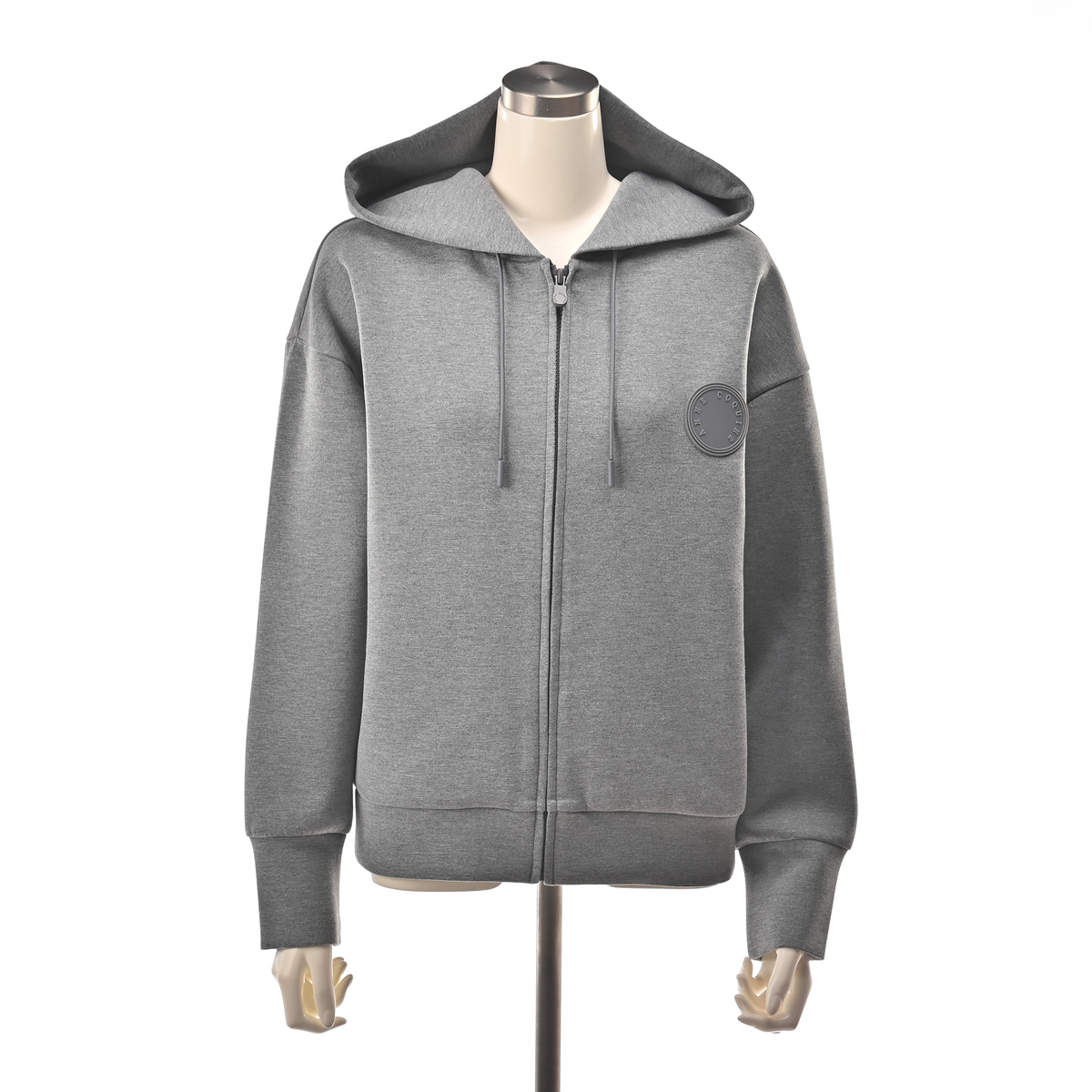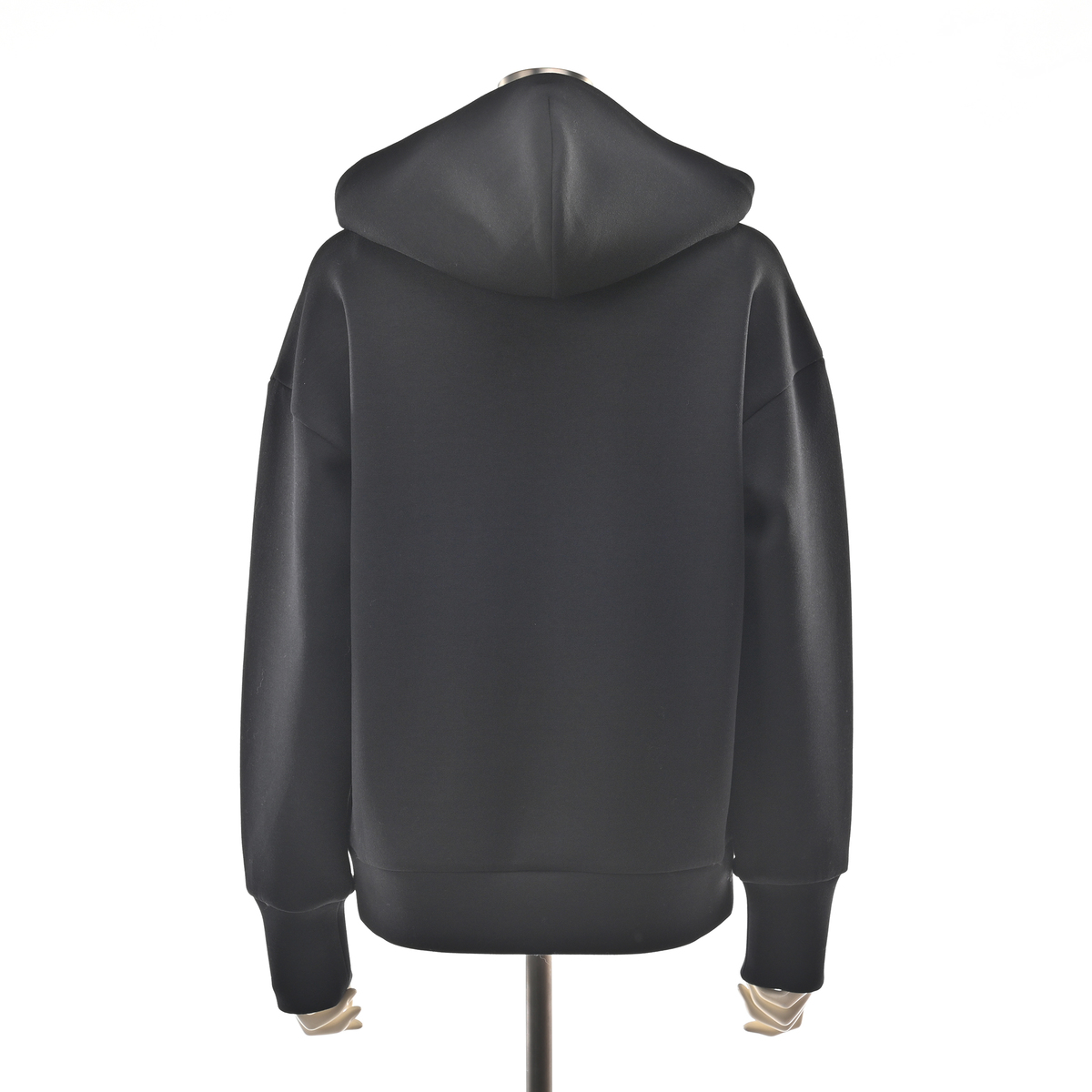 ダンボールニットを使用したジップアップパーカ。左胸にあしらった同色のロゴ入りサークルシリコンワッペンがポイントです