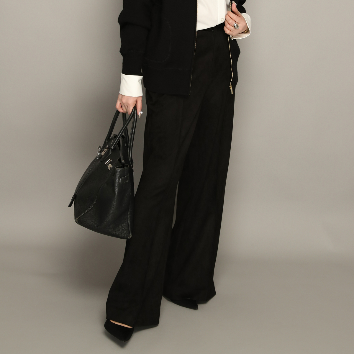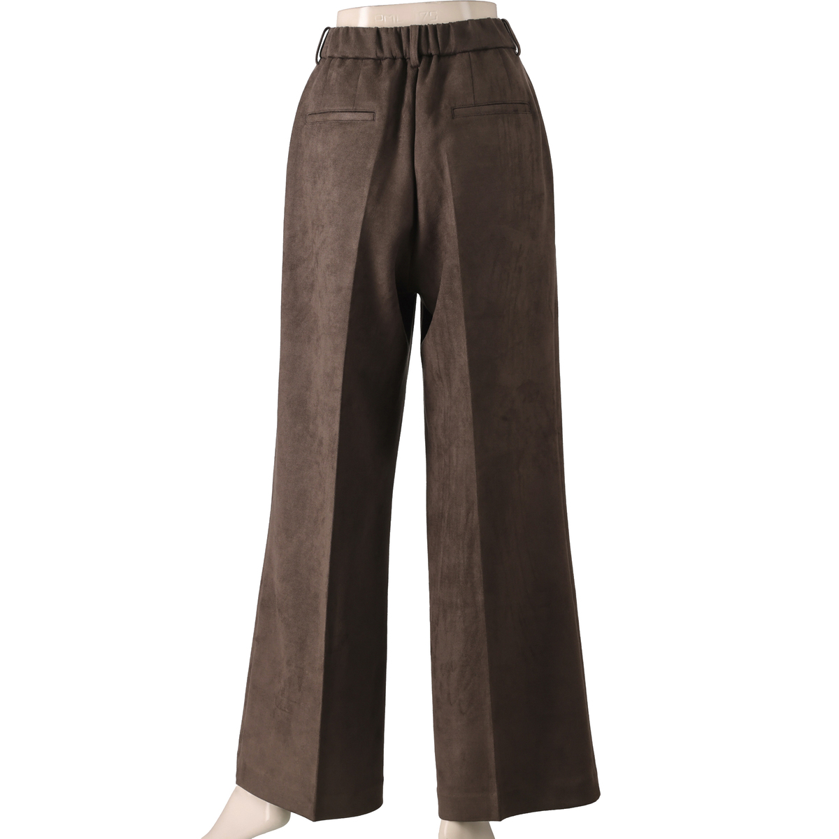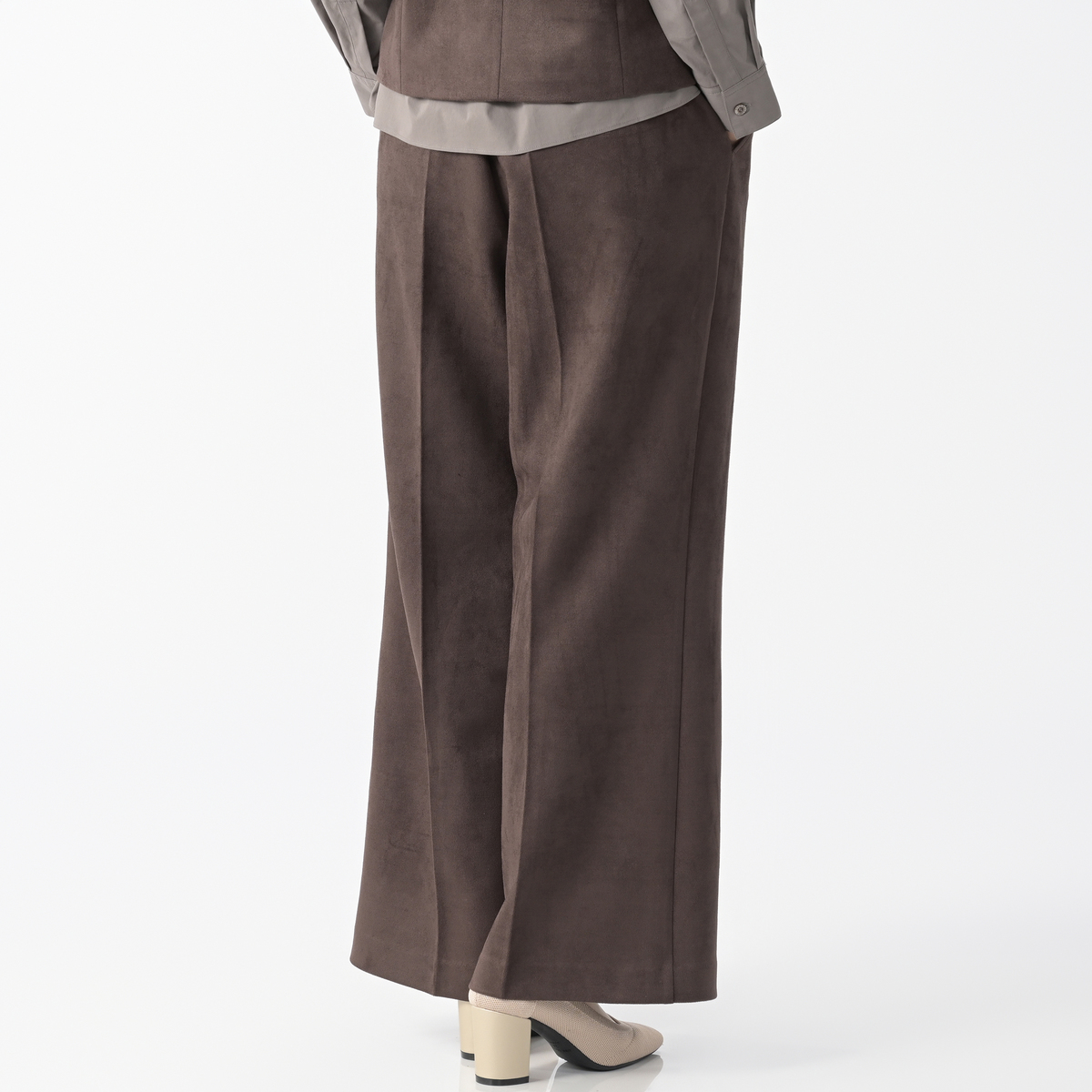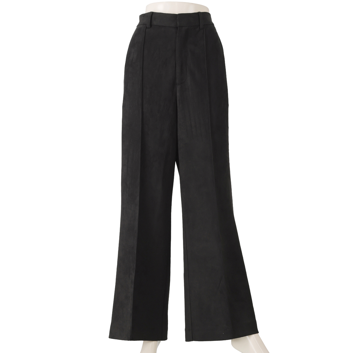 ストレッチフェイクスウェード素材のワイドパンツ。センターにはピンタックを施し、脚長効果をプラスしています