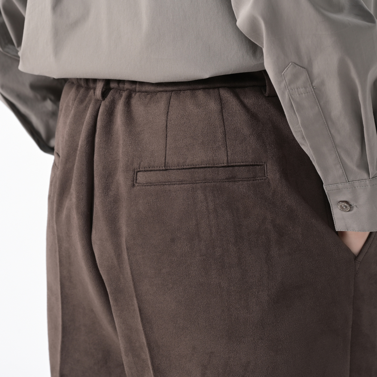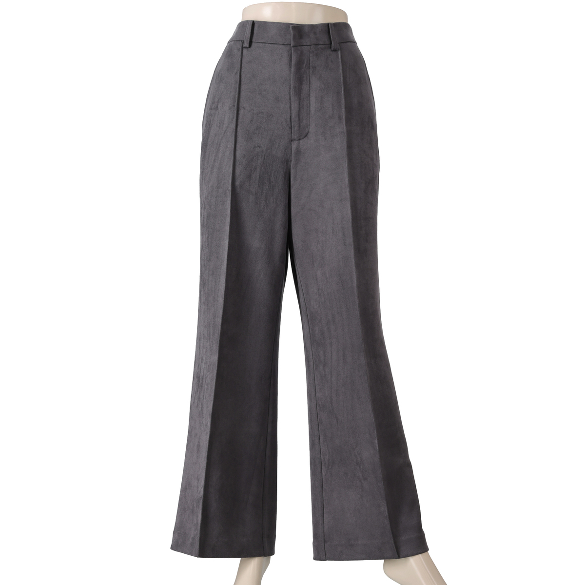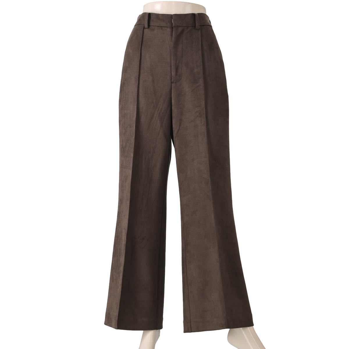 ストレッチフェイクスウェード素材のワイドパンツ。センターにはピンタックを施し、脚長効果をプラスしています
