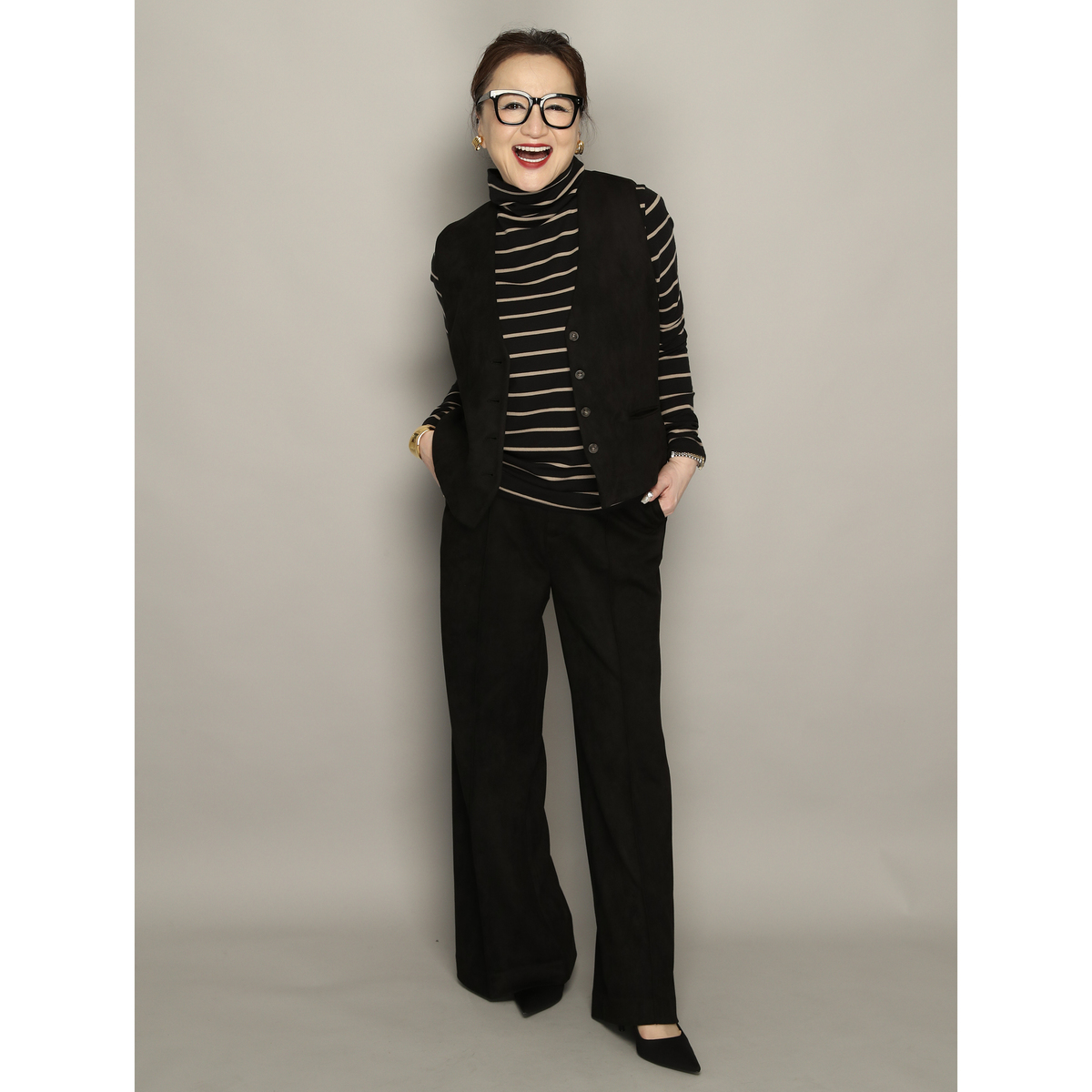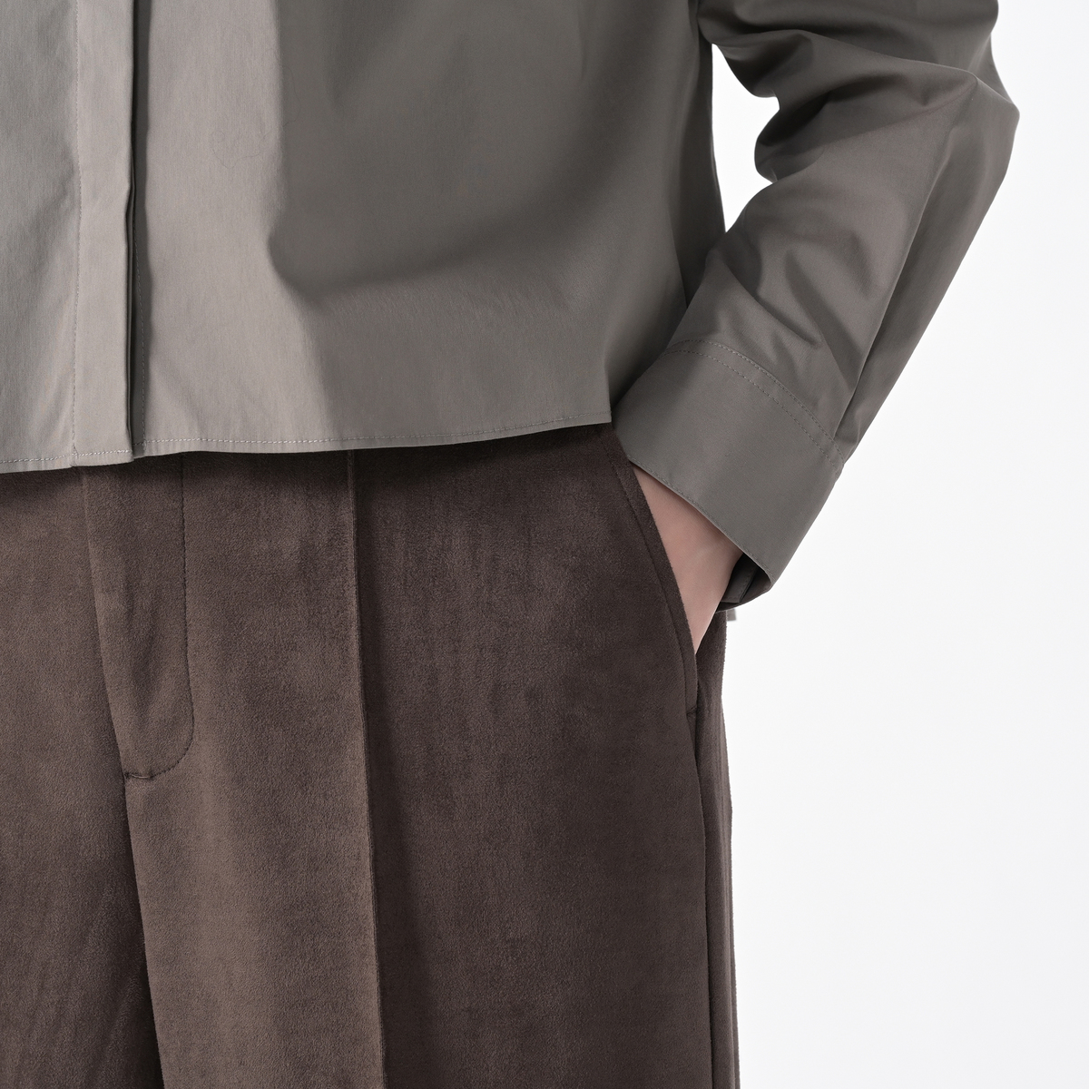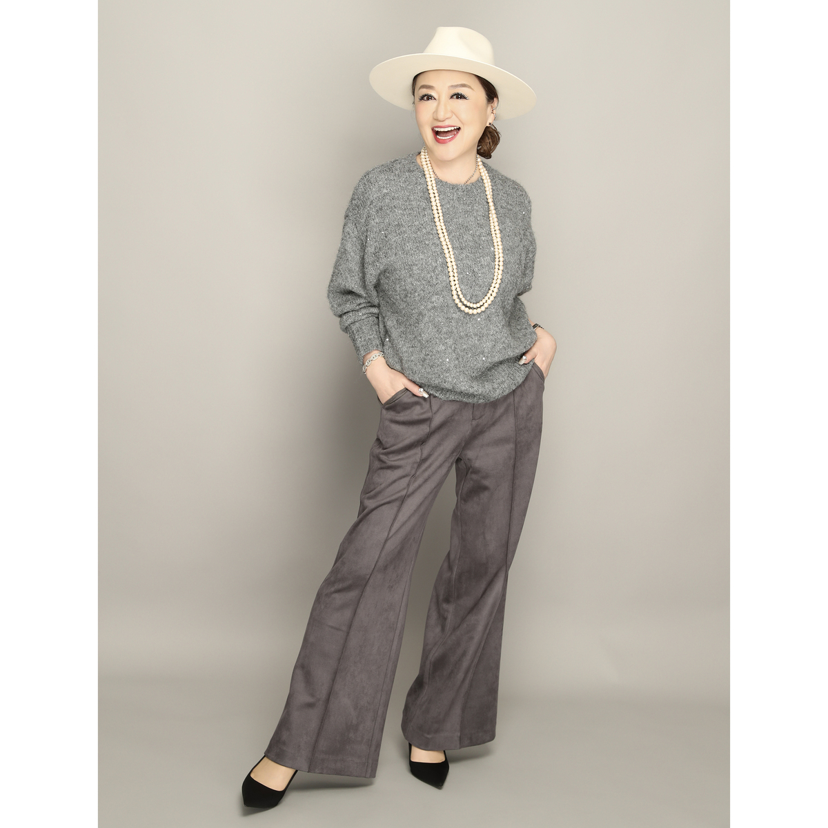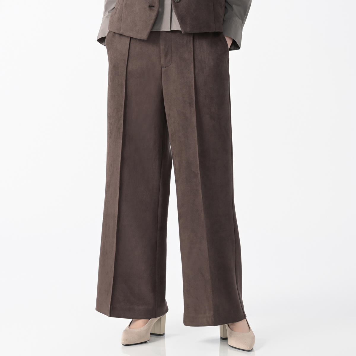 ストレッチフェイクスウェード素材のワイドパンツ。センターにはピンタックを施し、脚長効果をプラスしています