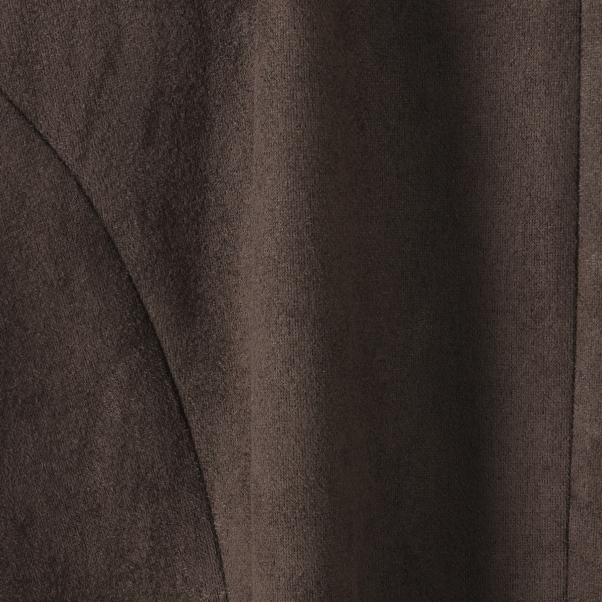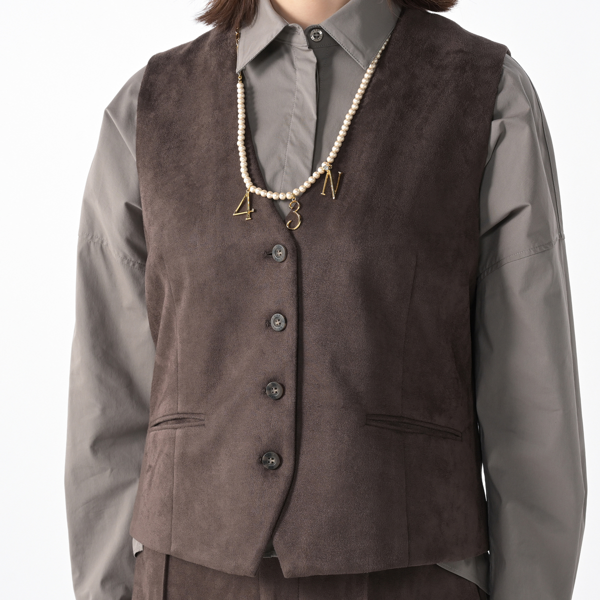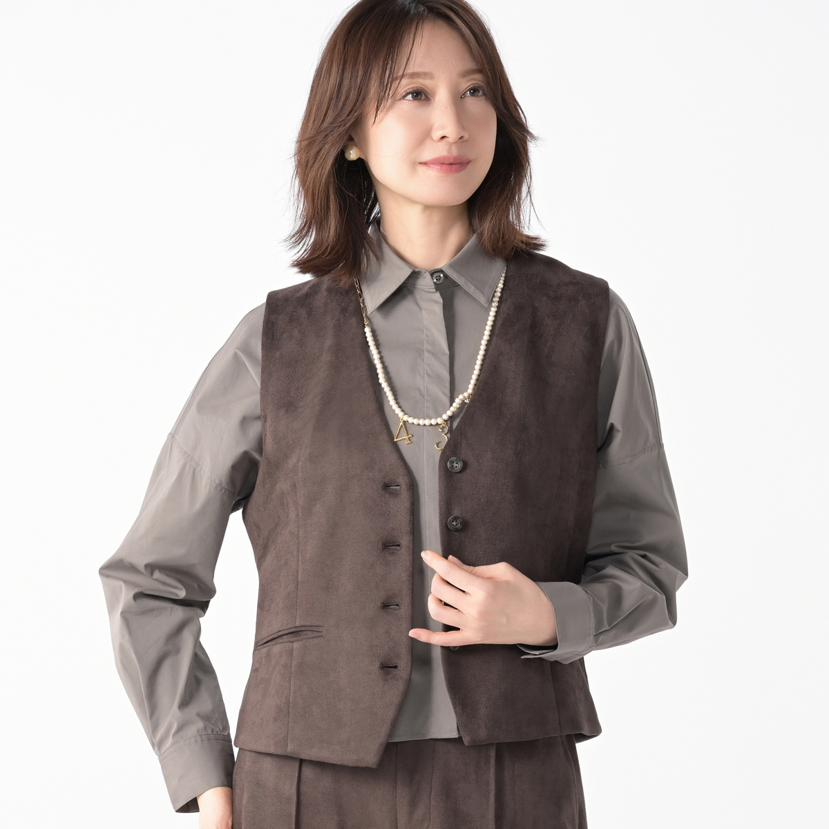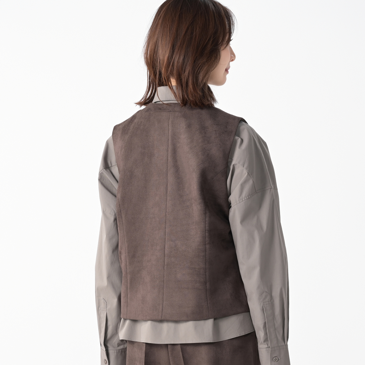 ストレッチ性のあるフェイクスウェード素材で仕立てたショート丈のジレ。洗練された印象で着こなせるVネックデザインです