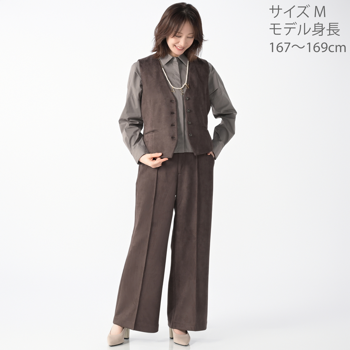 上下セットで高見え、単品でも使える スエードのおかげか?背中も温かくなり、ニット1枚では心もとない時に、羽織ると、温かいし、リブニットのピタピタのときは、胸や、お腹、背中のピチピチ感を隠してくれる優れもの ベストを買うなら、パンツもセットで買っておけば、汎用性が上がります 私は、ブラウンを購入して、あまりに素敵な商品グレー上下を追いコキーヌしました