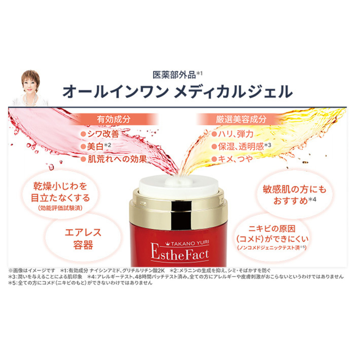 2つの薬用有効成分(*1)を配合したオールインワンジェルクリームです。シワ改善・美白(*2)・肌荒れの薬用効果。1品で導入液、化粧水、美容液、乳液、クリーム、アイクリーム、ネッククリーム、パック、マッサージクリーム、化粧下地の10役を果たします