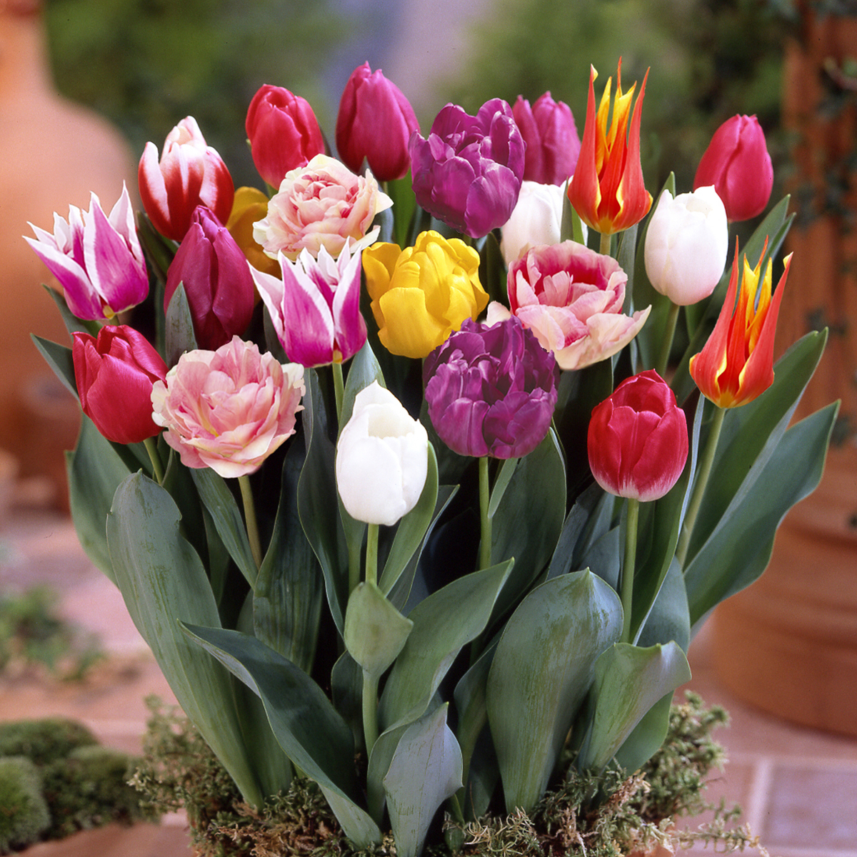 さまざまな形や色のチューリップを一度に楽しめるパック。ガーデニング初心者にも扱いやすく、春の庭づくりに役立ちます