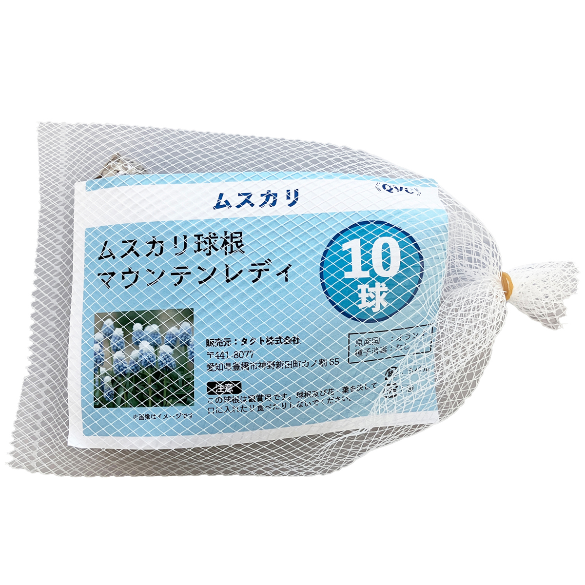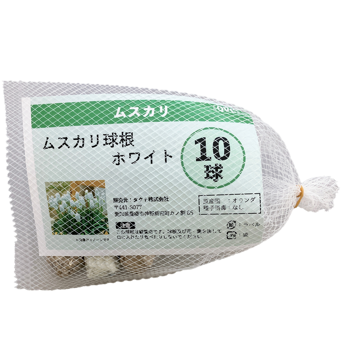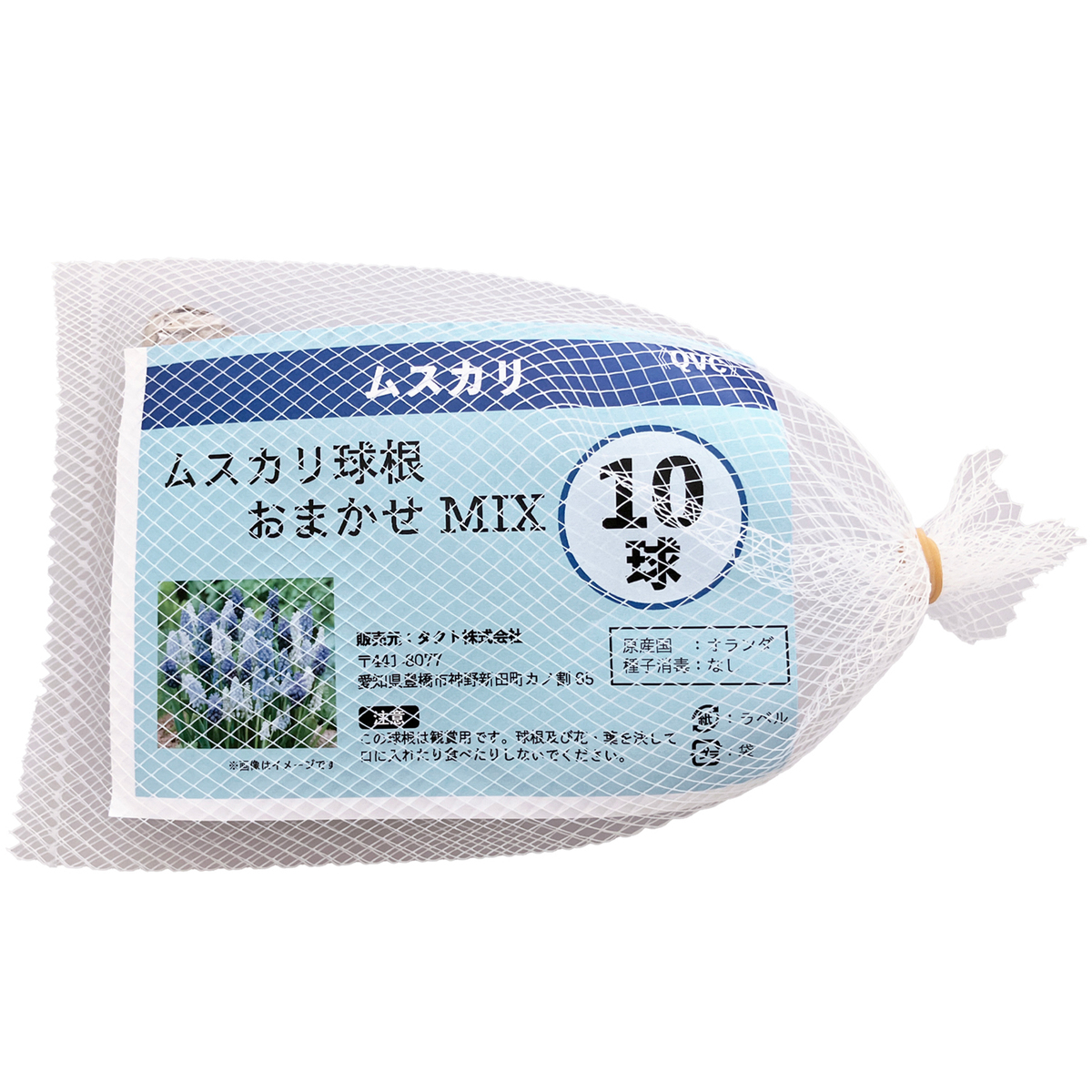 [商品内容] ・球根(ムスカリ)10球 ・育て方説明書 [花の種類] ムスカリ [お届け時商品サイズ] 約幅14×高さ22cm [使用方法] 植え付け時期:植込みは地温が下がり始める10〜12月頃を目安に行ってください。12月以降のお届けは芽が出始めている場合がありますが、品質に問題ありません 植え付け:日当たり・風通し・水はけの良い場所。土は市販の園芸用土をお勧めします。<鉢植え>5号(15cm)鉢に10球が目安です 水やり:土の表面が乾いてからたっぷりと与えてください。芽が出る前も地中で根が生育を始めていますので、冬も土を乾かしすぎないように水を与えてください 肥料:元肥は、緩効性化成肥料を与えてください。元肥入りの園芸用土の場合は必要ありません。追肥は、緩効性化成肥料を2ヶ月に1回程度、または液体肥料を1ヶ月に3回程度与えてください [注意事項] ※植え付けまでの球根保管方法:球根は包材から取り出し、風通しのよい涼しい日陰で保管してください ※冬は株元の凍結防止のため、ワラ、落ち葉、腐葉土等で株元を覆います。暖かい室内には入れないようにしましょう ※咲き終わった花は順次摘み取ります。すべて咲き終わったら花茎も切りましょう。花が終わっても、葉は切らないようにします。葉が光合成を行うことにより、球根に栄養が蓄えられます。葉が黄変し枯れ始めたら、球根を掘り上げて乾燥させた後、涼しい場所で保管します ※ムスカリは、数年植えっぱなしでも毎年花をお楽しみいただけますが、何年もそのままでは株が増えすぎて見栄えが悪くなるので、2〜3年に1度は掘り上げましょう ※鉢植えで掘り上げない場合は、夏は水やりを控えて日陰に置いてください ※この球根は観賞用です。球根及び花・葉を決して口に入れたり食べたりしないでください ※種子消毒はしておりません ※球根の大きさ・サイズは品種により異なる場合があります ※花色の出方は多少色幅があり、画像と異なる場合があります。ご了承ください ※植物の性質や気候などにより、同時に開花しない場合があります。咲き始めが違っても商品違いではありません 【オランダ製】