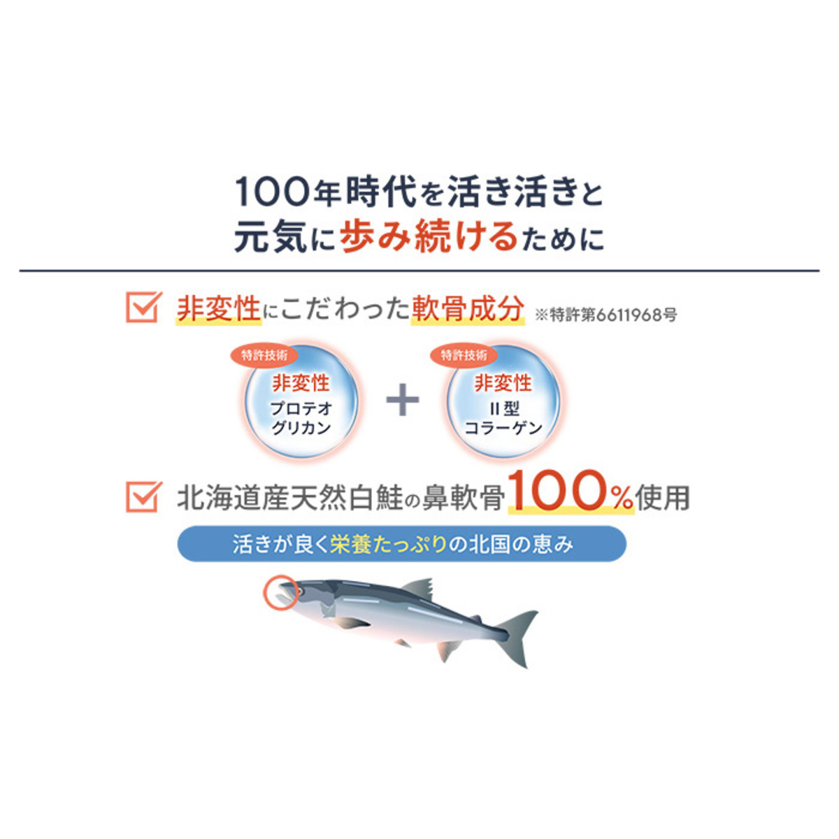 鮭鼻軟骨抽出物(非変性プロテオグリカン、非変性2型コラーゲン含有)は特許製法で製造されており、特許技術によりプロテオグリカンを抽出しています(特許第6611968号)