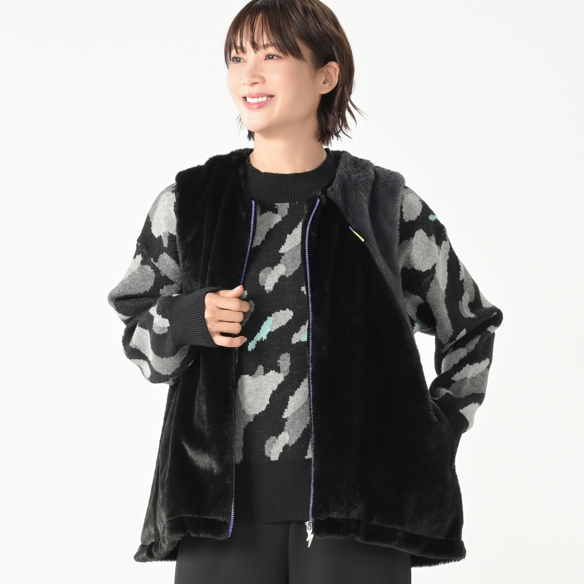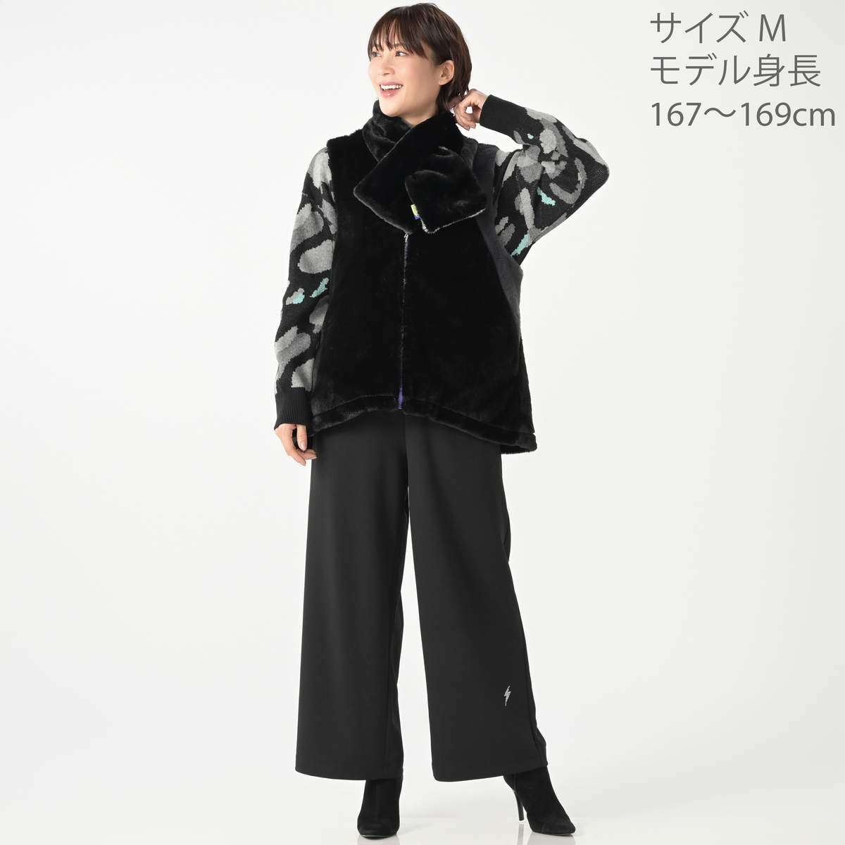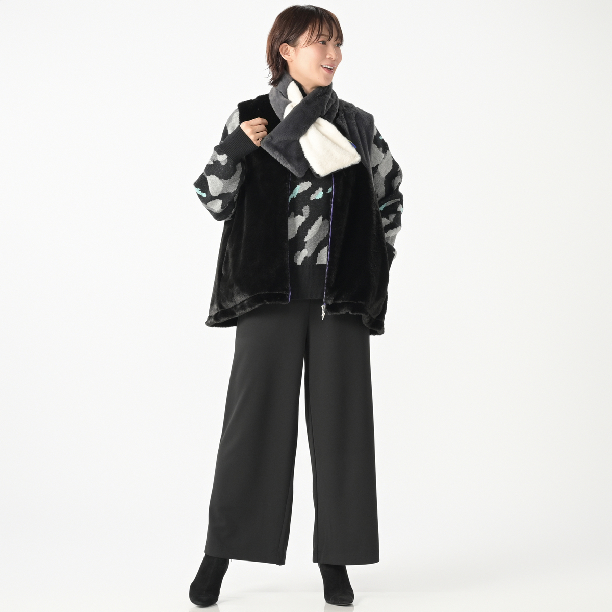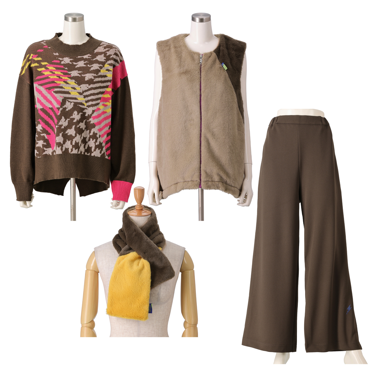 4色ジャガードのニットプルオーバー、配色切替が楽しいフェイクファーのジレ、着回し自在なワイドパンツ、柔らかなネックウォーマーの4点セットです。組合せに迷わず、手軽に華やかなスタイルをお楽しみいただけます