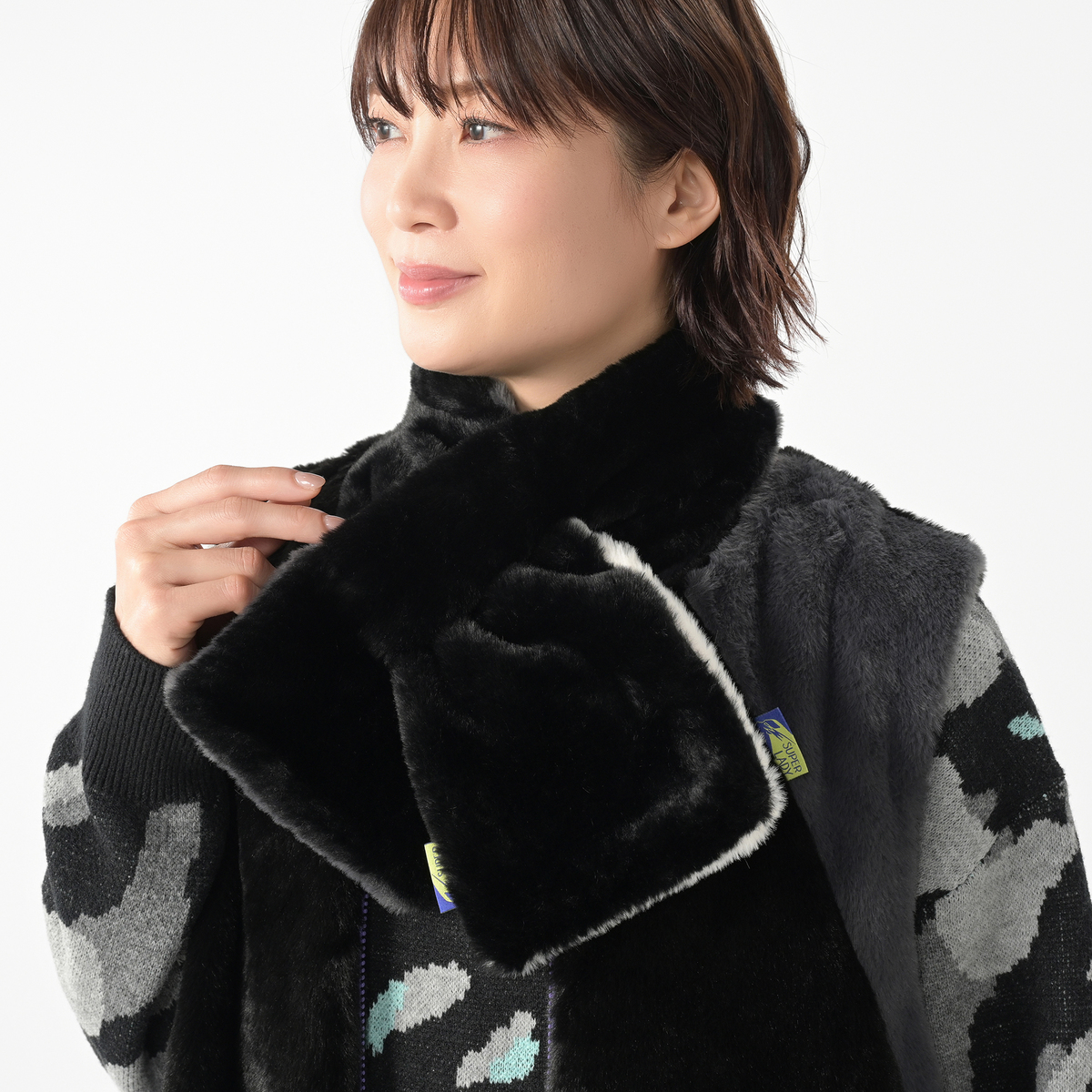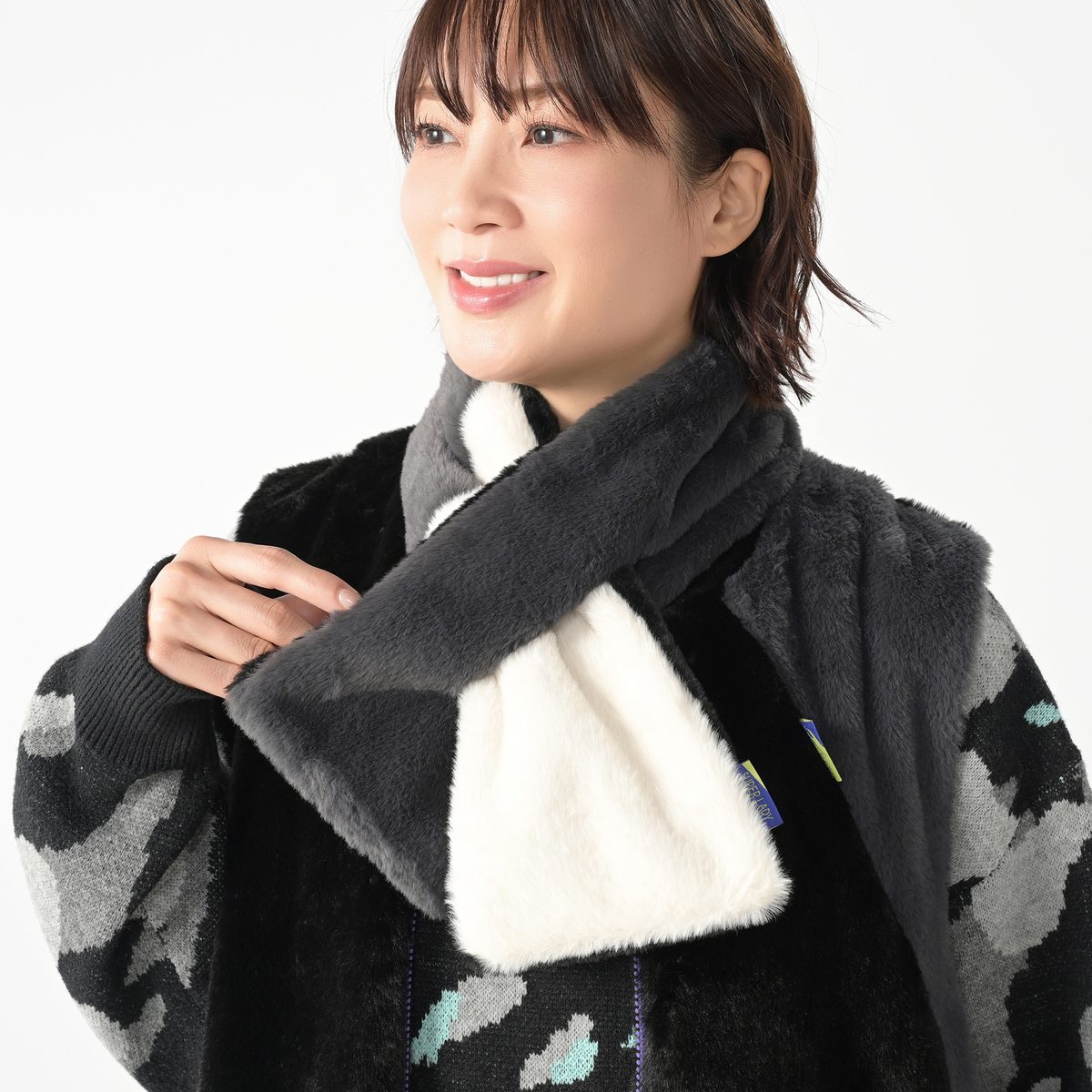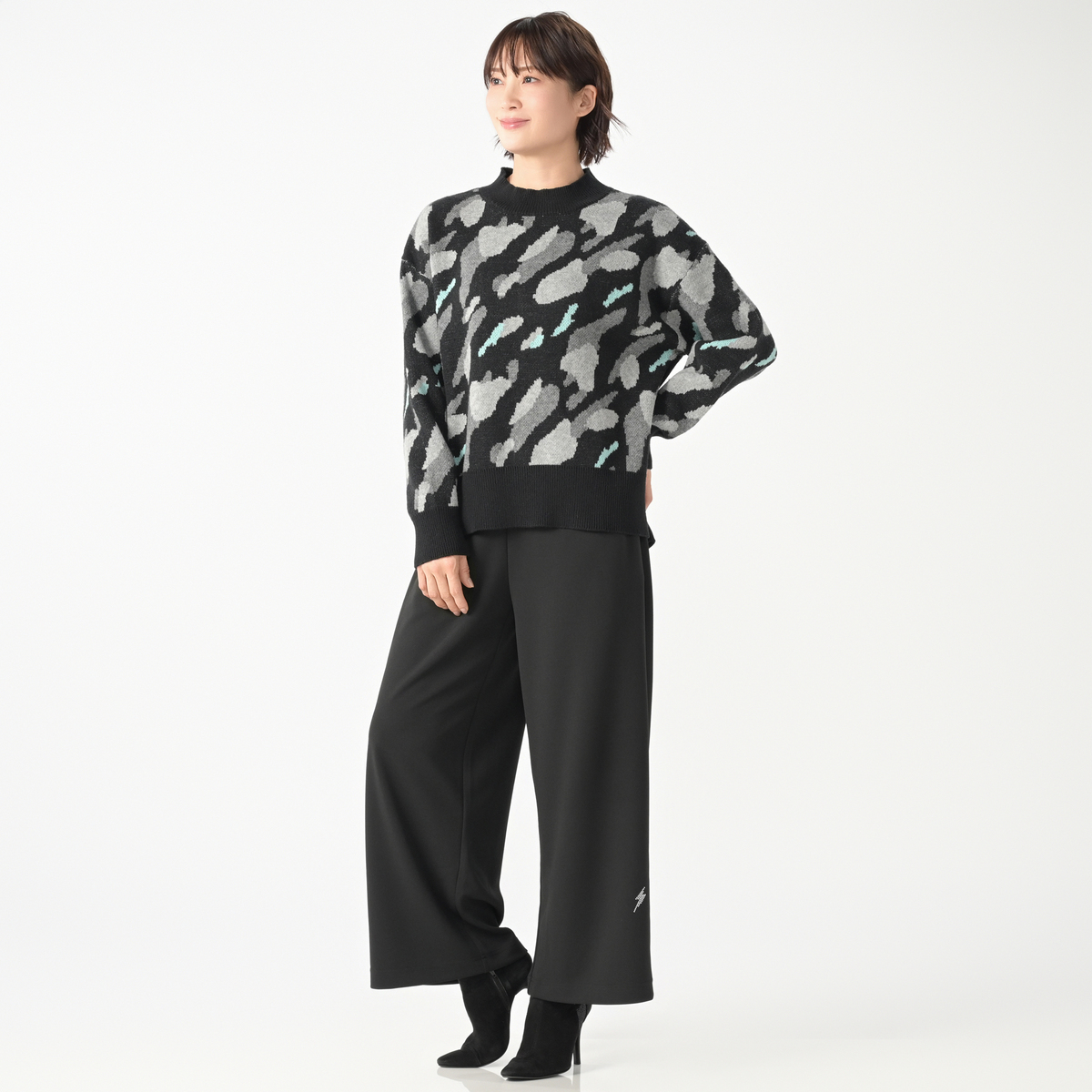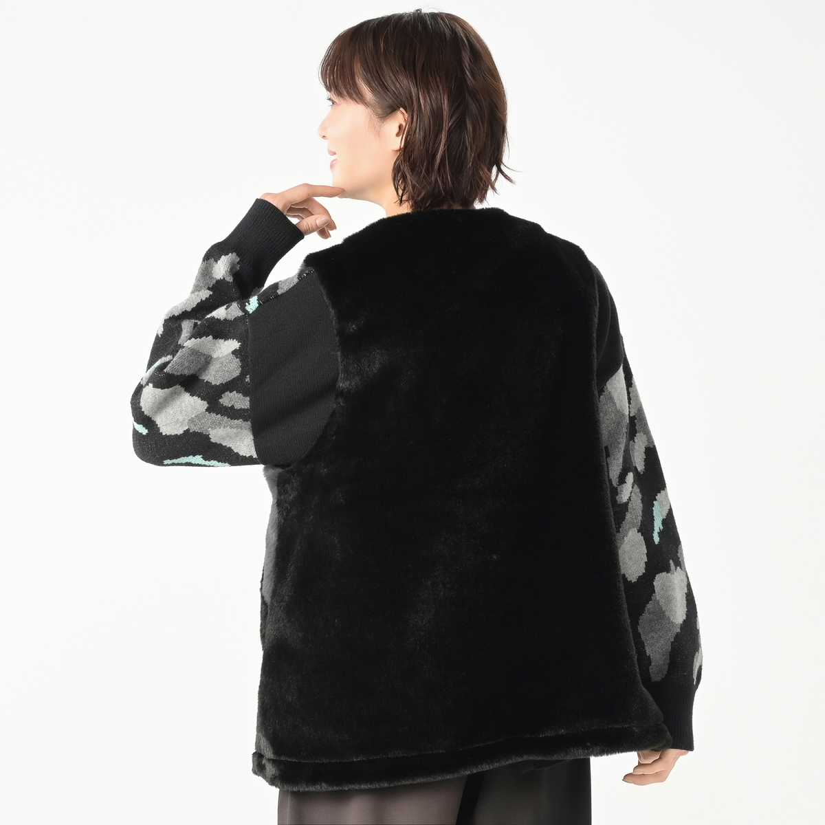 4色ジャガードのニットプルオーバー、配色切替が楽しいフェイクファーのジレ、着回し自在なワイドパンツ、柔らかなネックウォーマーの4点セットです。組合せに迷わず、手軽に華やかなスタイルをお楽しみいただけます