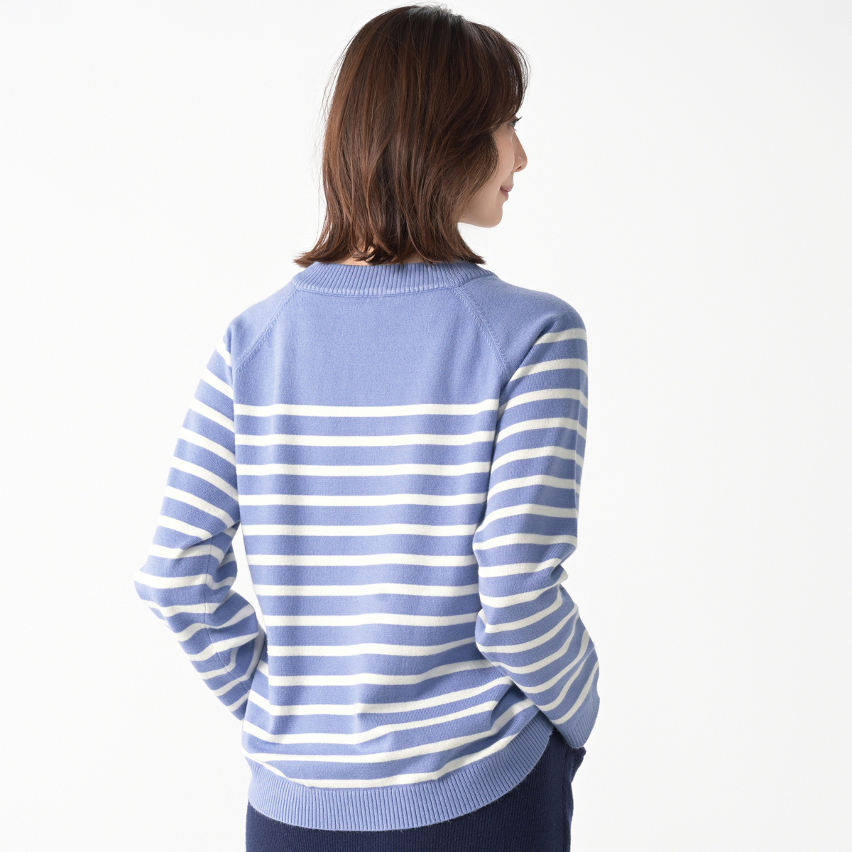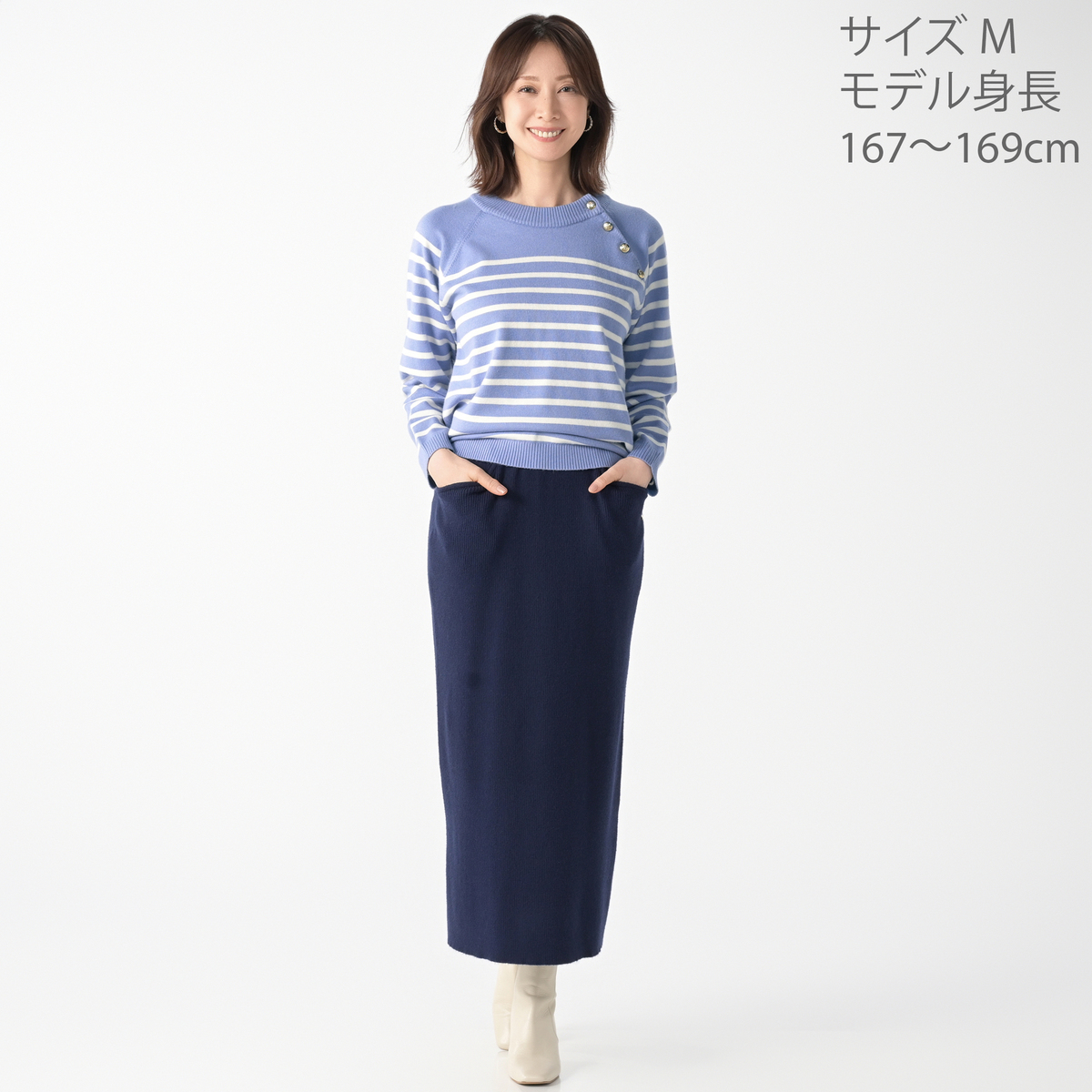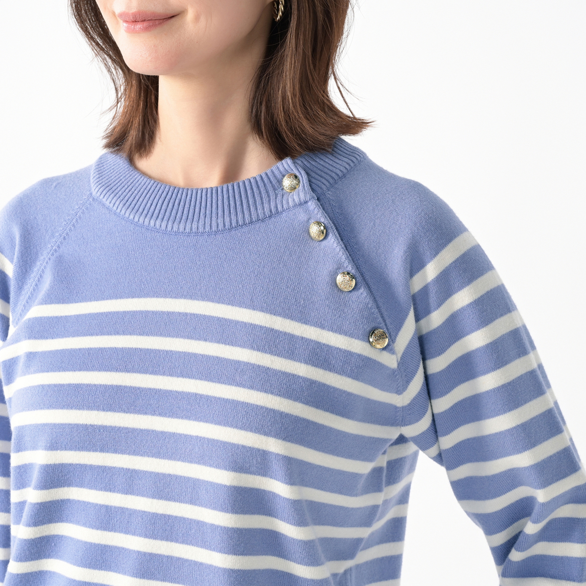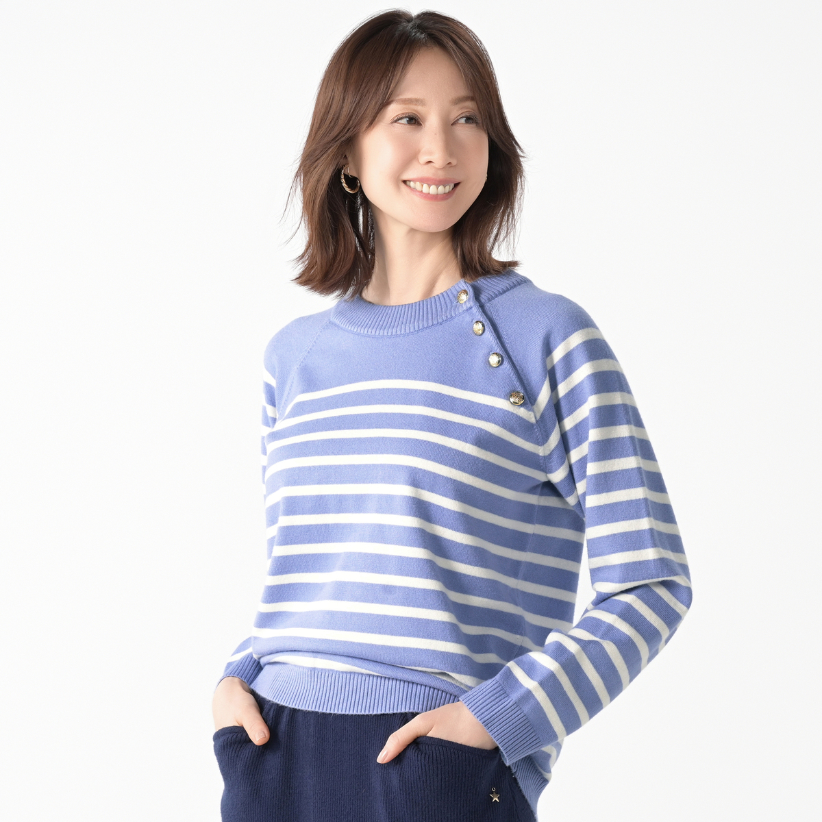 エニワイズ加工を施したニット。繊維中に油脂分を含むことで、しっとりなめらかな肌触りです。上品なマリンテイストに、華やかなボタンアクセントをプラスしました。スカートやパンツとの組合せも自在で、季節の装いに洗練された印象を添えます