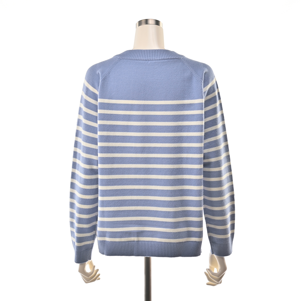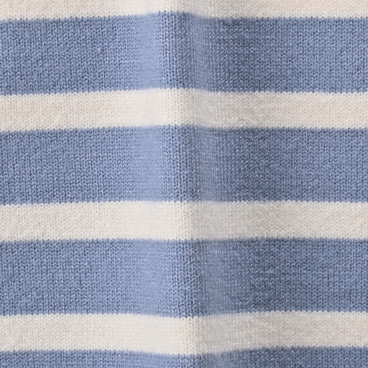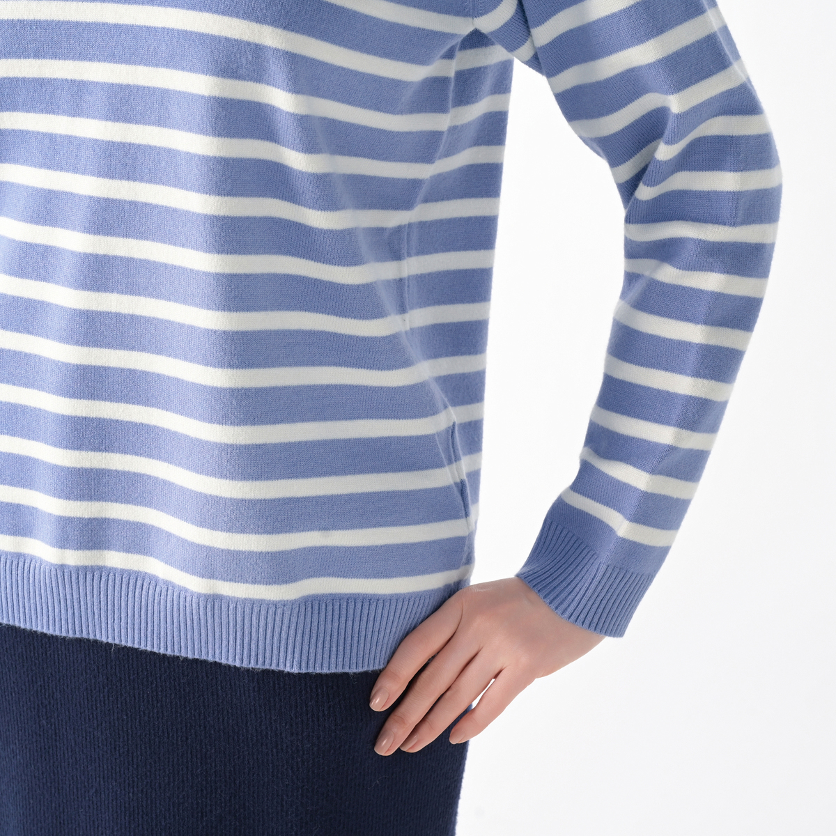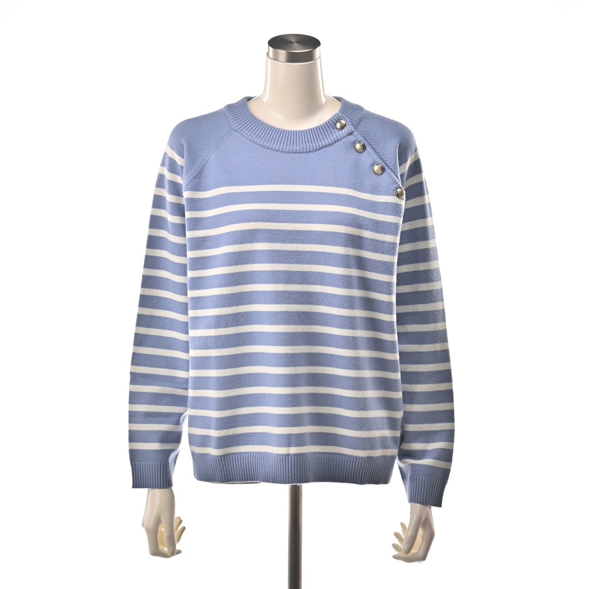 エニワイズ加工を施したニット。繊維中に油脂分を含むことで、しっとりなめらかな肌触りです。上品なマリンテイストに、華やかなボタンアクセントをプラスしました。スカートやパンツとの組合せも自在で、季節の装いに洗練された印象を添えます