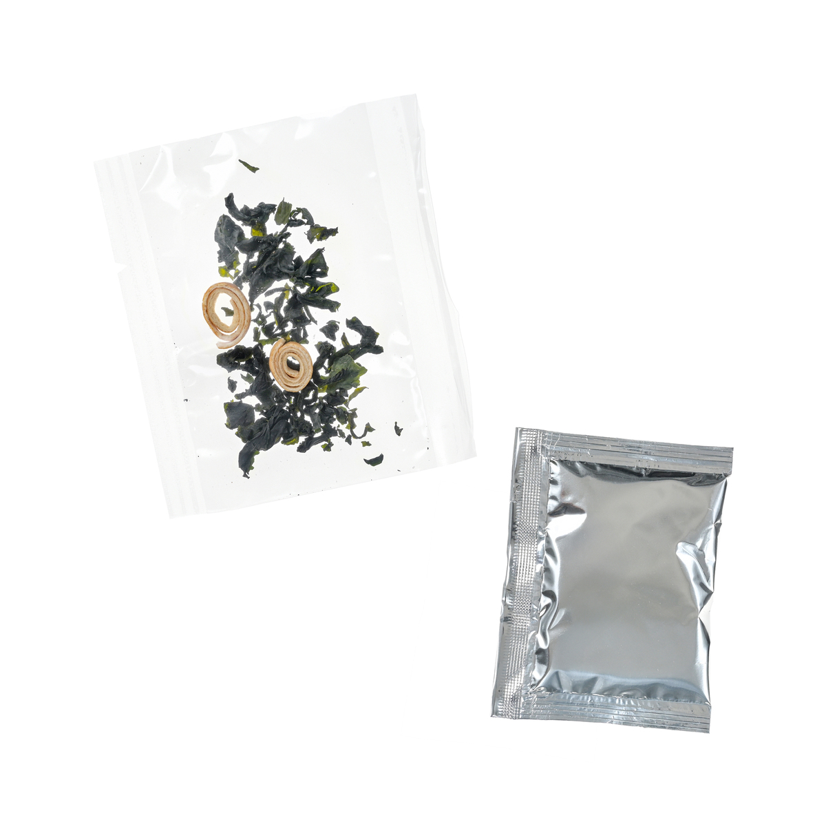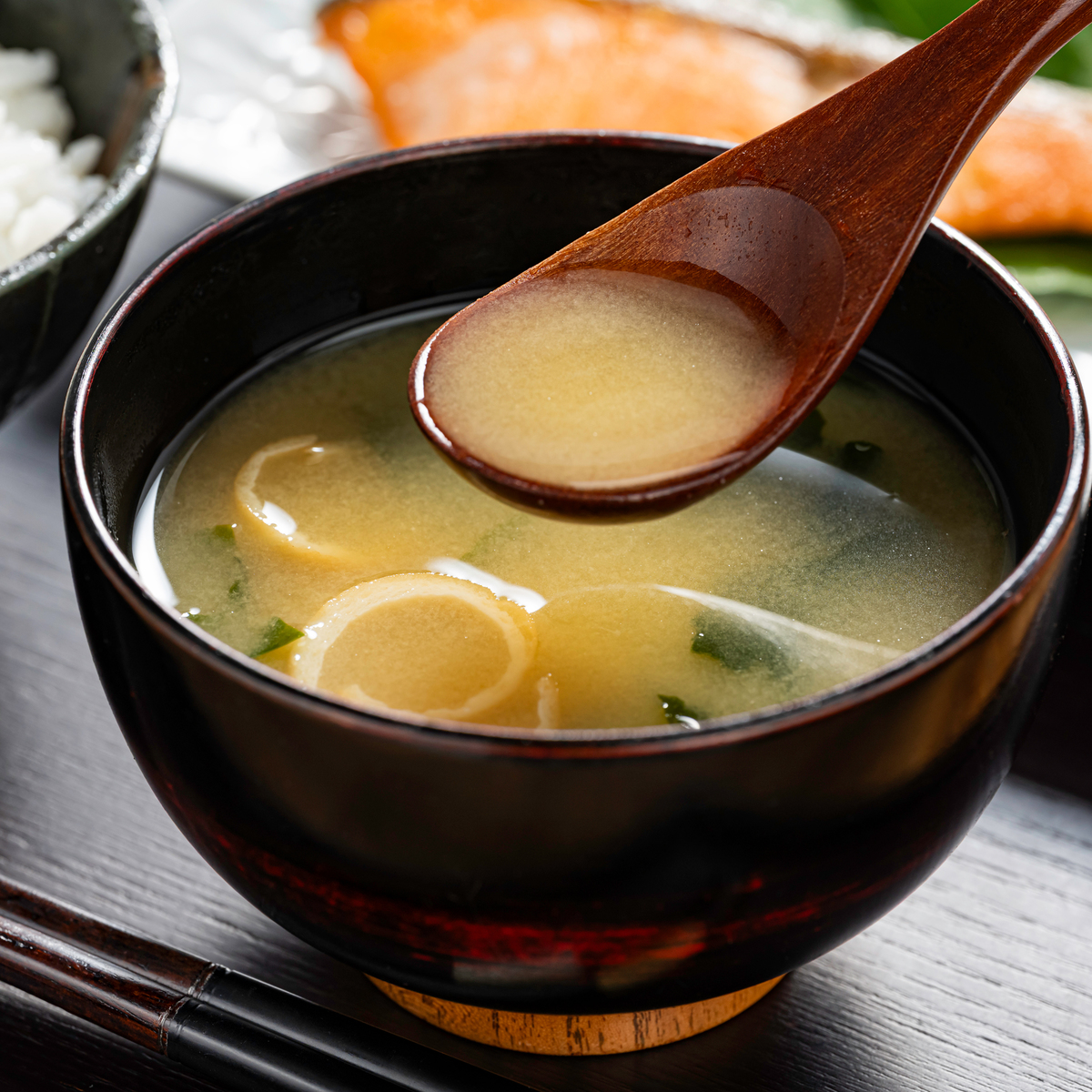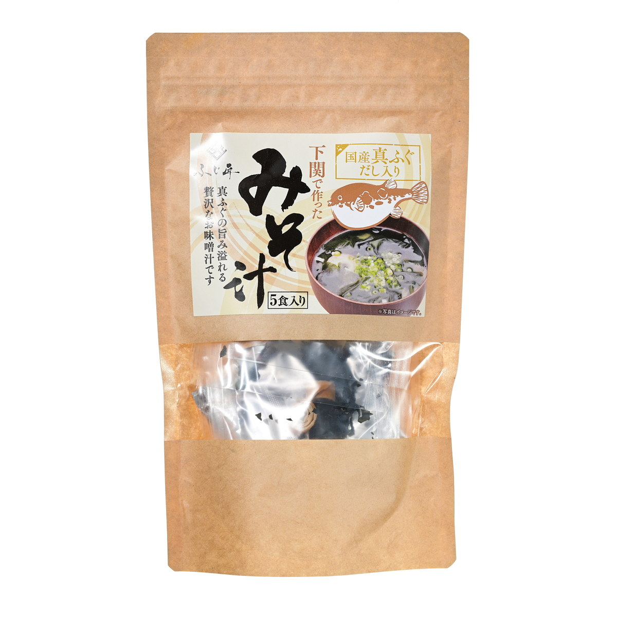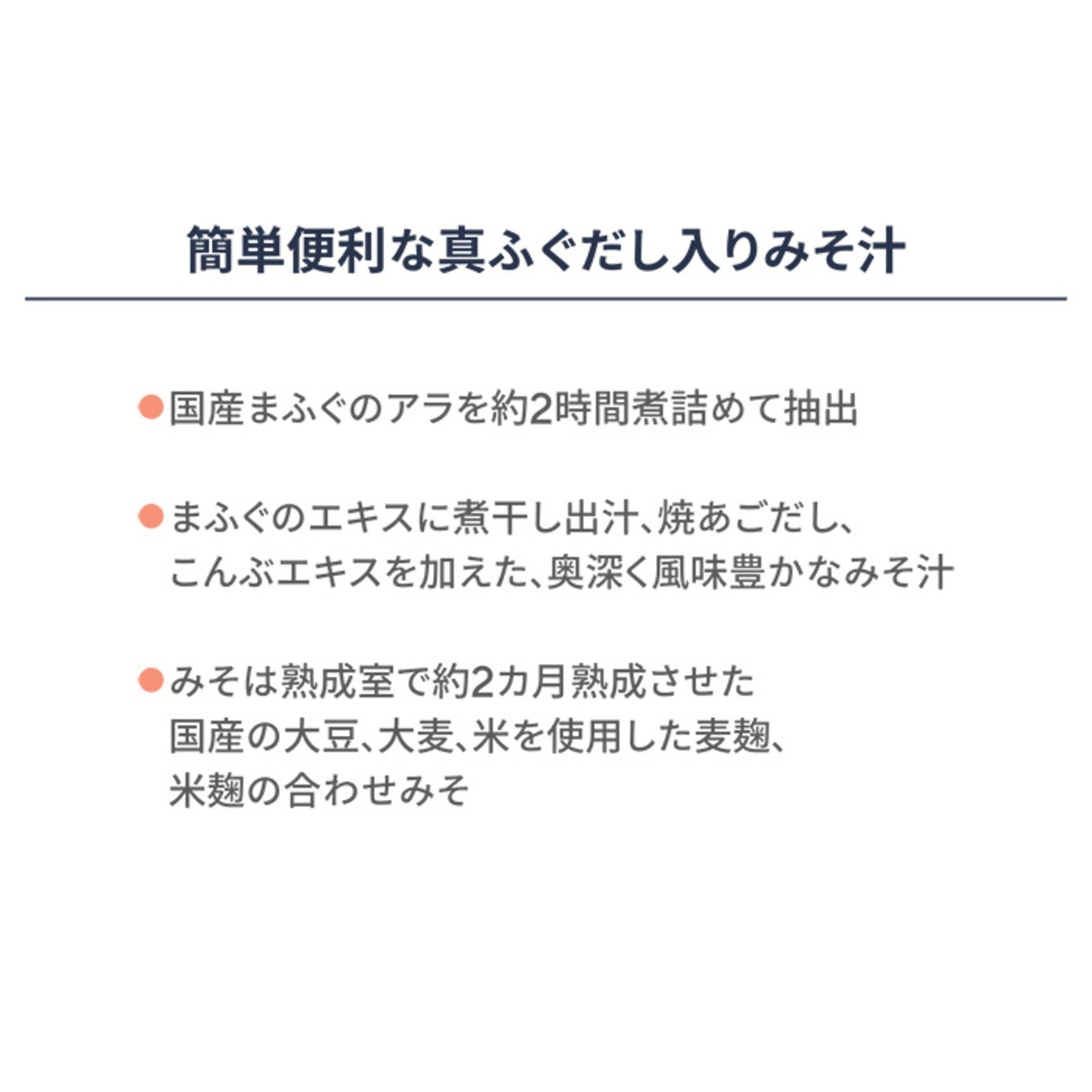 お湯を注ぐだけで本格的な味わいが手軽に楽しめる真ふぐだし入りみそ汁。出汁は国産まふぐのアラを約2時間煮詰めて抽出したエキスに煮干し出汁を加え、さらに焼あごだし、こんぶエキスで味を整え風味豊かに仕上げました