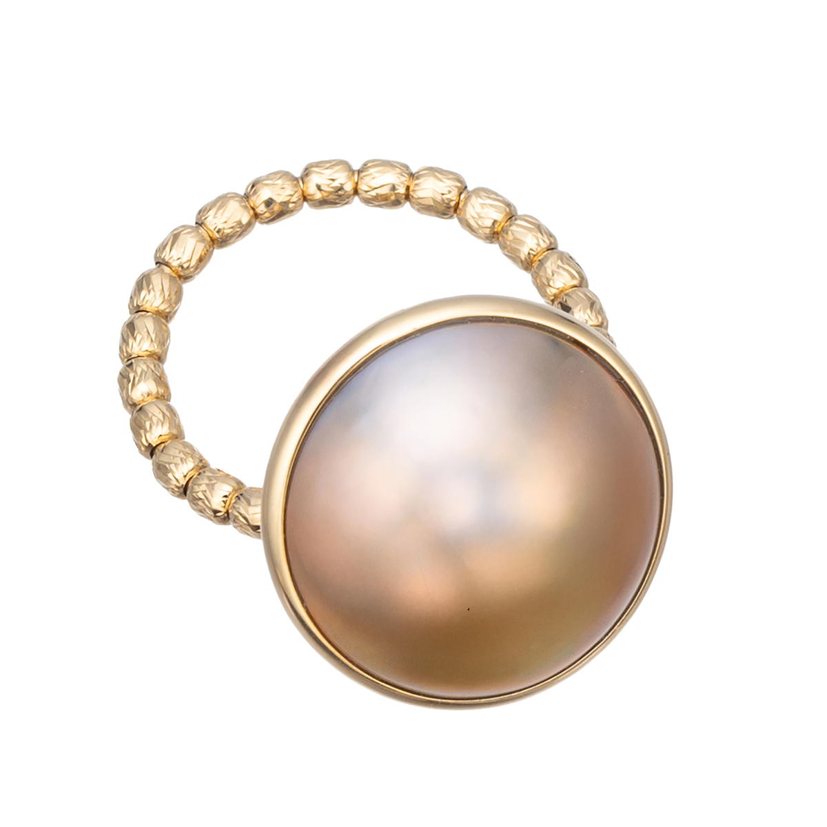 14.0mmUPの奄美大島産マベパールを存在感たっぷりにあしらったストレッチリング。ゴールド系の地色に干渉色が合わさって、独特の色相を生み出します