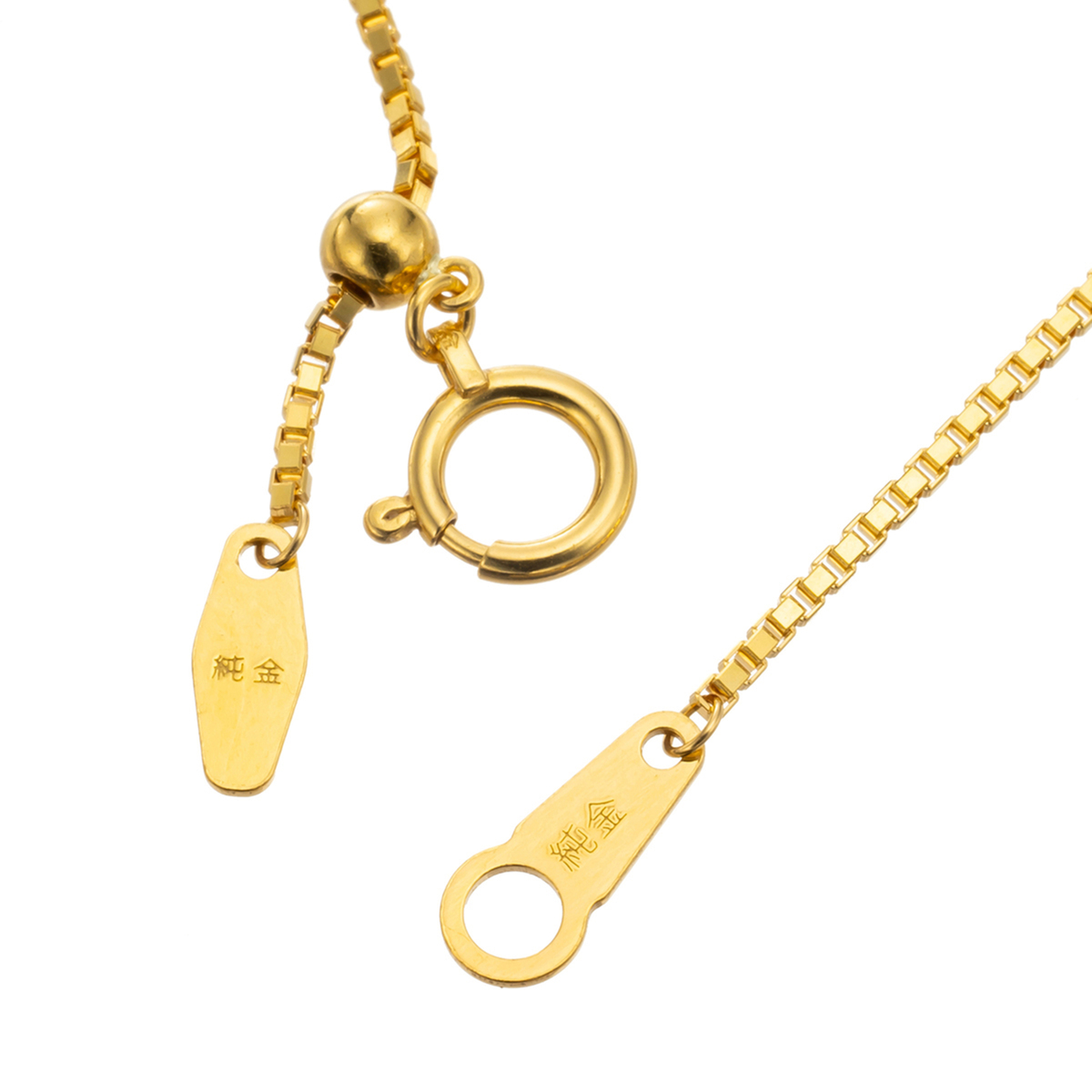 純金ならではの存在感で、シンプルながらもコーディネートが華やぐデザイン。約42cmと約60cmの2サイズ展開で、どちらも長さ調節できるスライド式アジャスター付きです