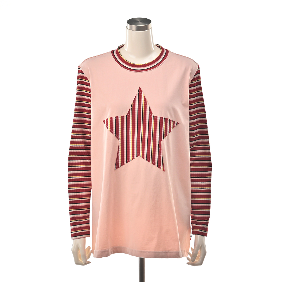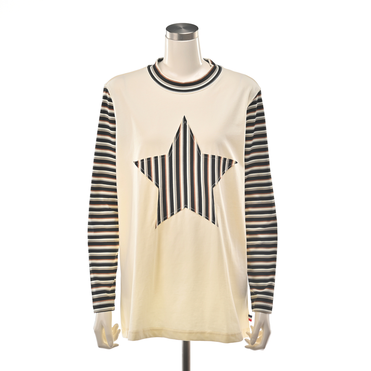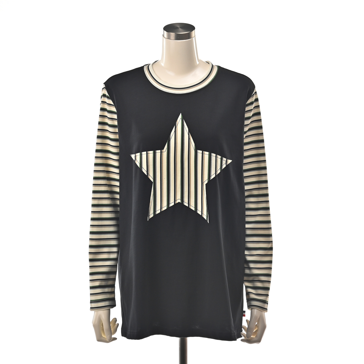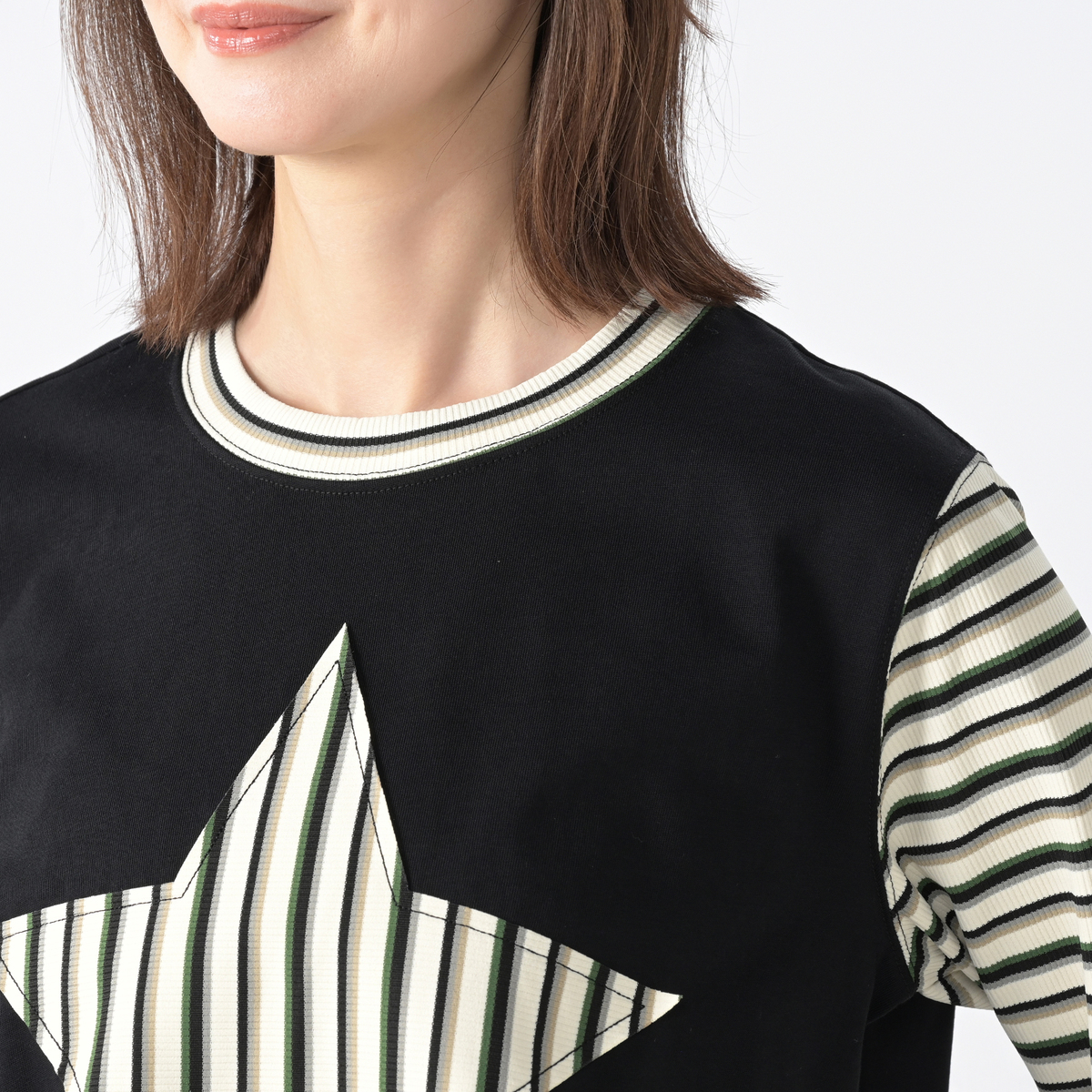 胸元の星型アップリケが目を引く、遊び心あふれるTシャツ。衿ぐりや袖、星部分にはマルチカラーボーダーのテレコ素材を使用しました