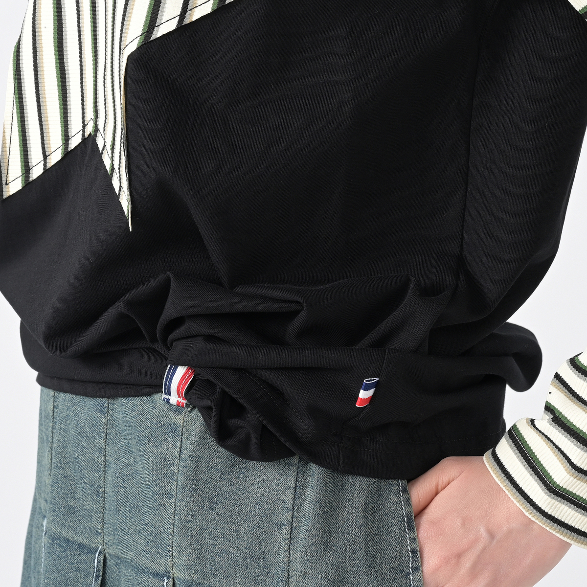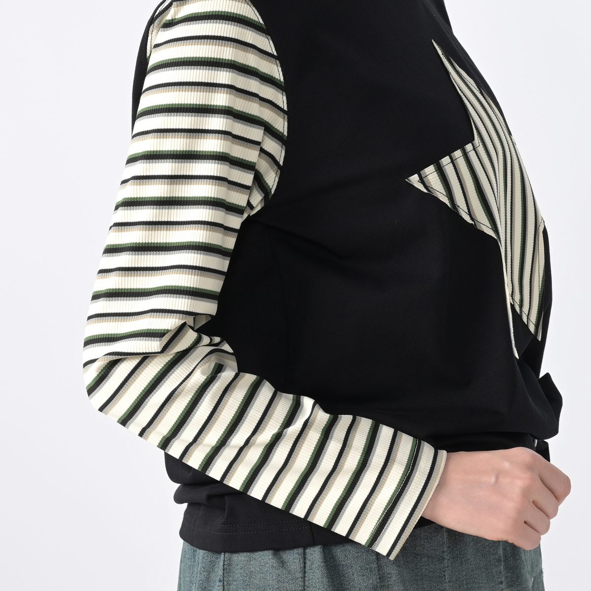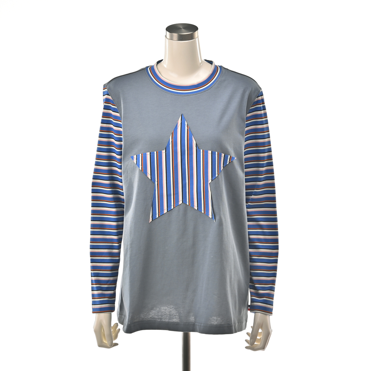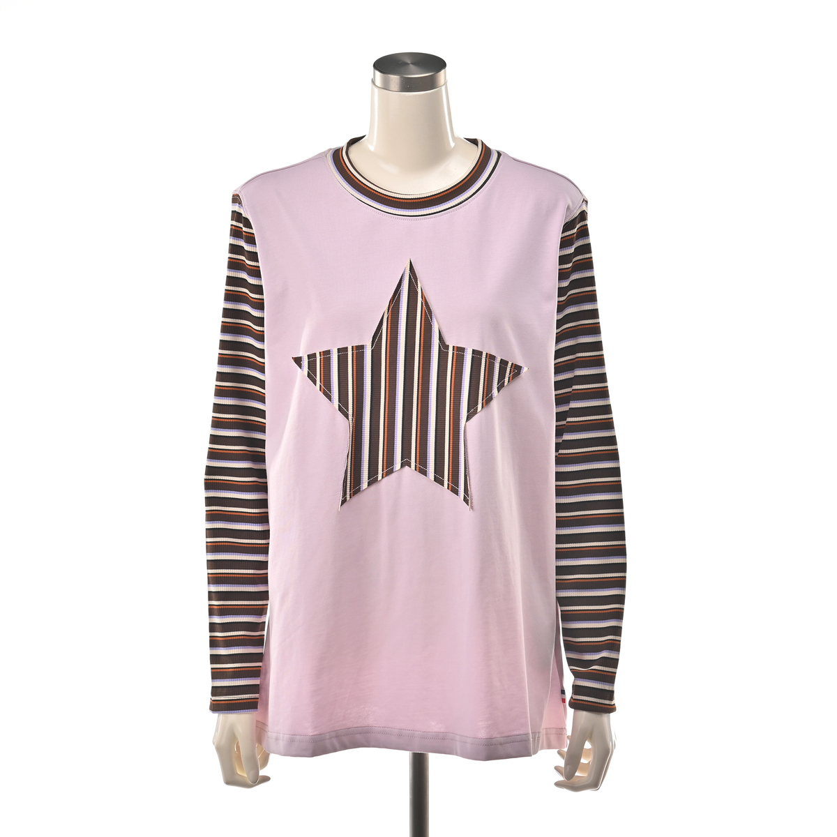 胸元の星型アップリケが目を引く、遊び心あふれるTシャツ。衿ぐりや袖、星部分にはマルチカラーボーダーのテレコ素材を使用しました