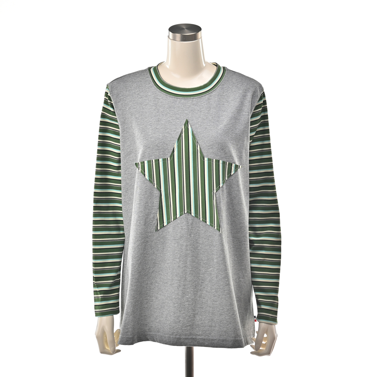 こちらの身頃は綿100%。化繊が少し入った柔らかな生地もそれはそれで良いのですが、やはり綿100%の素朴な肌障りは素肌に気持ちが良いですね!ヘザーグレーのLとブルーグレーのMをいただき、LでもMでも良さそうでしたが、綿100%は多少縮むこともあるかと思い、ヘザーグレーの方を手元に残そうと思います。ヘザーグレー、シマシマ部分には薄いサックスも入っていたり、また画面で見るよりも全体的に明るい印象で気に入りました。ただ、チュニック丈が私にはいまひとつなんです。昔のように、ぴたぴたのスリムパンツが流行っていたときには、腰回りを隠せるチュニックはバランス的にも良かったと思うのですが、昨今のように太めのパンツに合わせるには、もう少し短い丈の方がバランスがとりやすく、着やすいのでは、と思います。また、星柄や花柄は私を含め、どなたも好まれると思うのですが、先生のお描きになる個性的な(笑)動物柄もぜひ! 楽しみにしています!