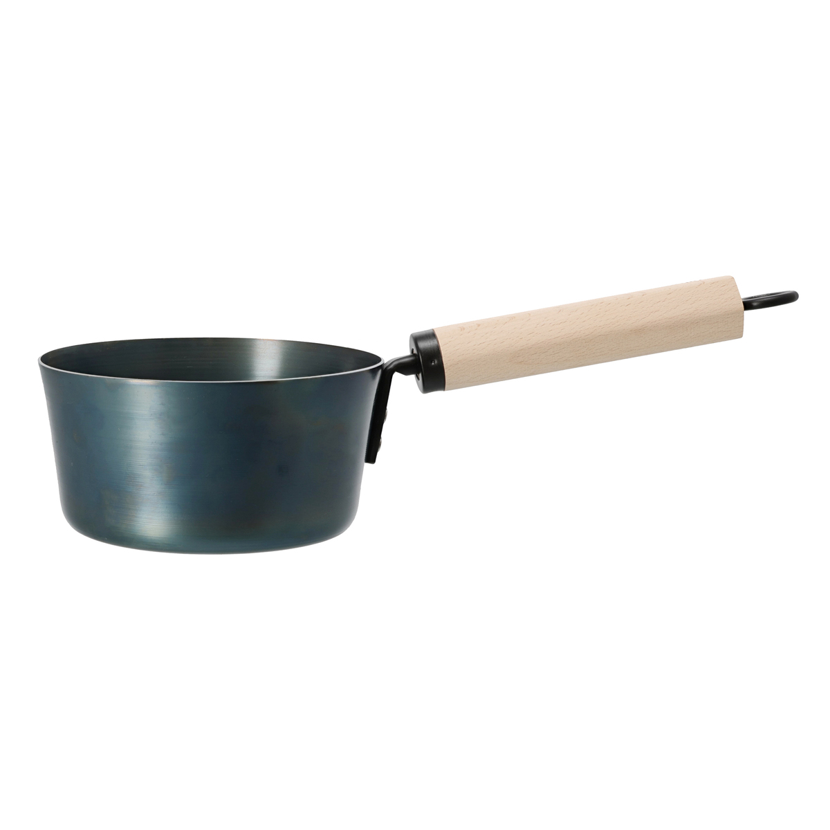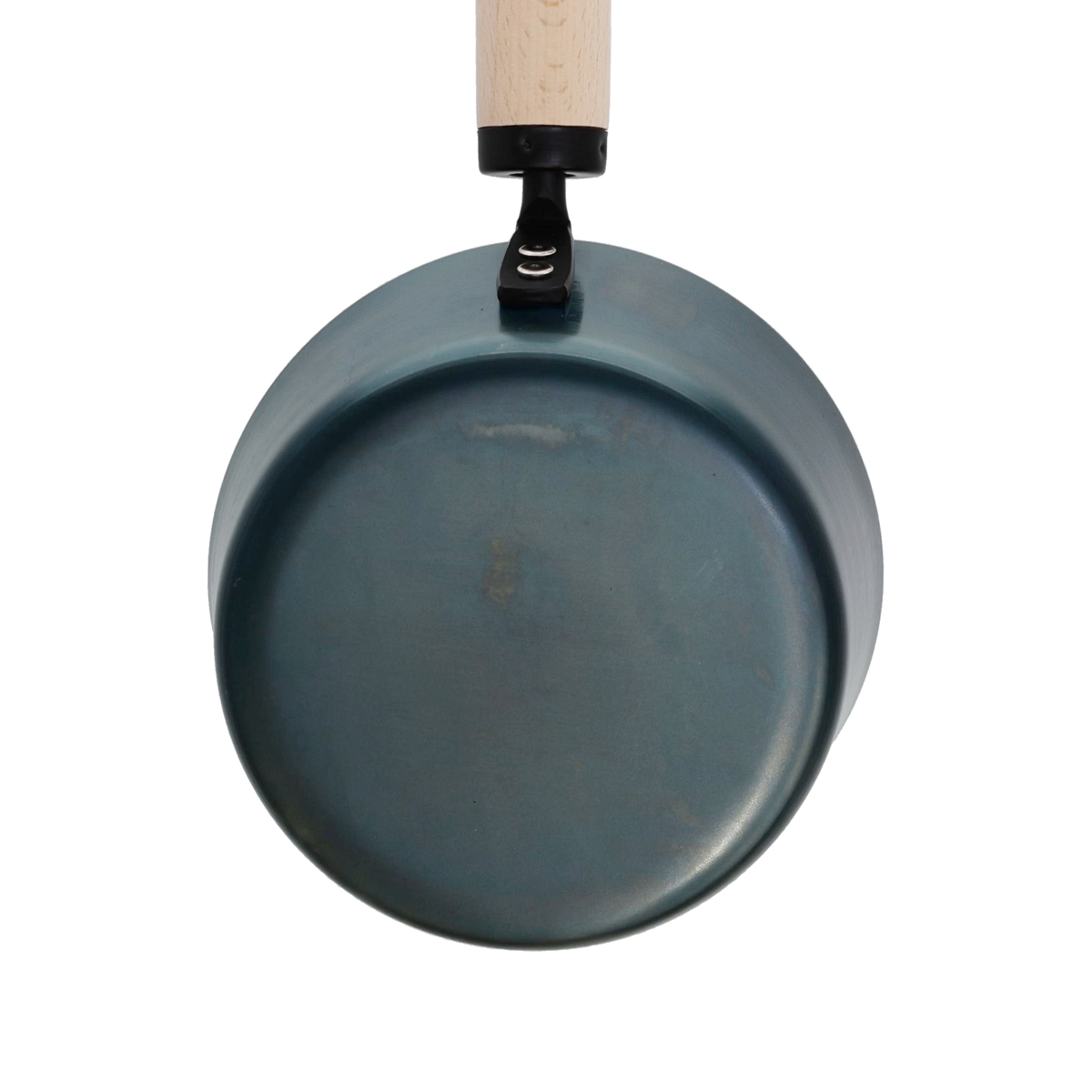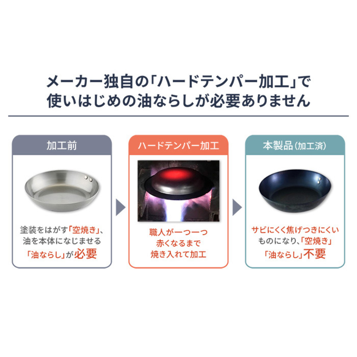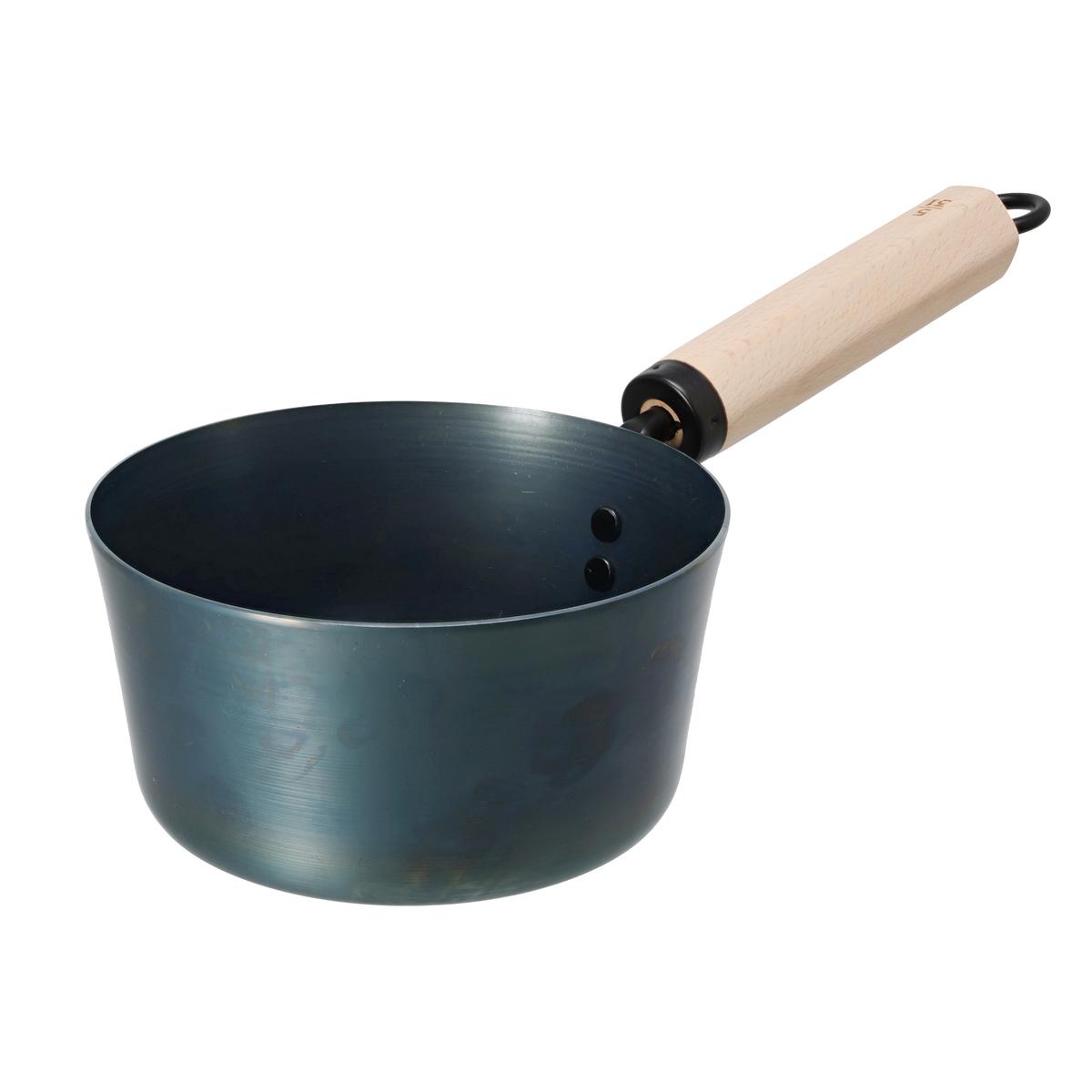 持ち手は握りやすい六角グリップを採用。あえて無垢素材にこだわり、使い込むほどに手になじみ、深い味わいを増していきます。製造工程でハードテンパー加工(焼付油ならし)を施し、鉄本来の弱点を改善。「こげつきにくく、サビにくい」独自の仕上げで、長く快適に使える鍋です