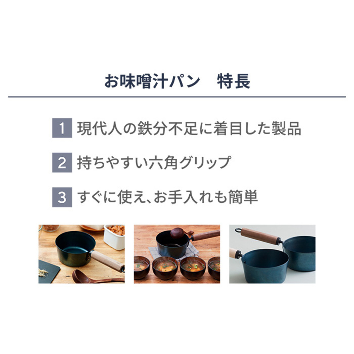 現代人の鉄分不足に着目した味噌汁鍋。職人が一つひとつ手作業でシーズニングを施しているので、買ったその日からすぐに使えます。お手入れも簡単で、長く愛用できるのが魅力。お手入れマニュアルも同封しています