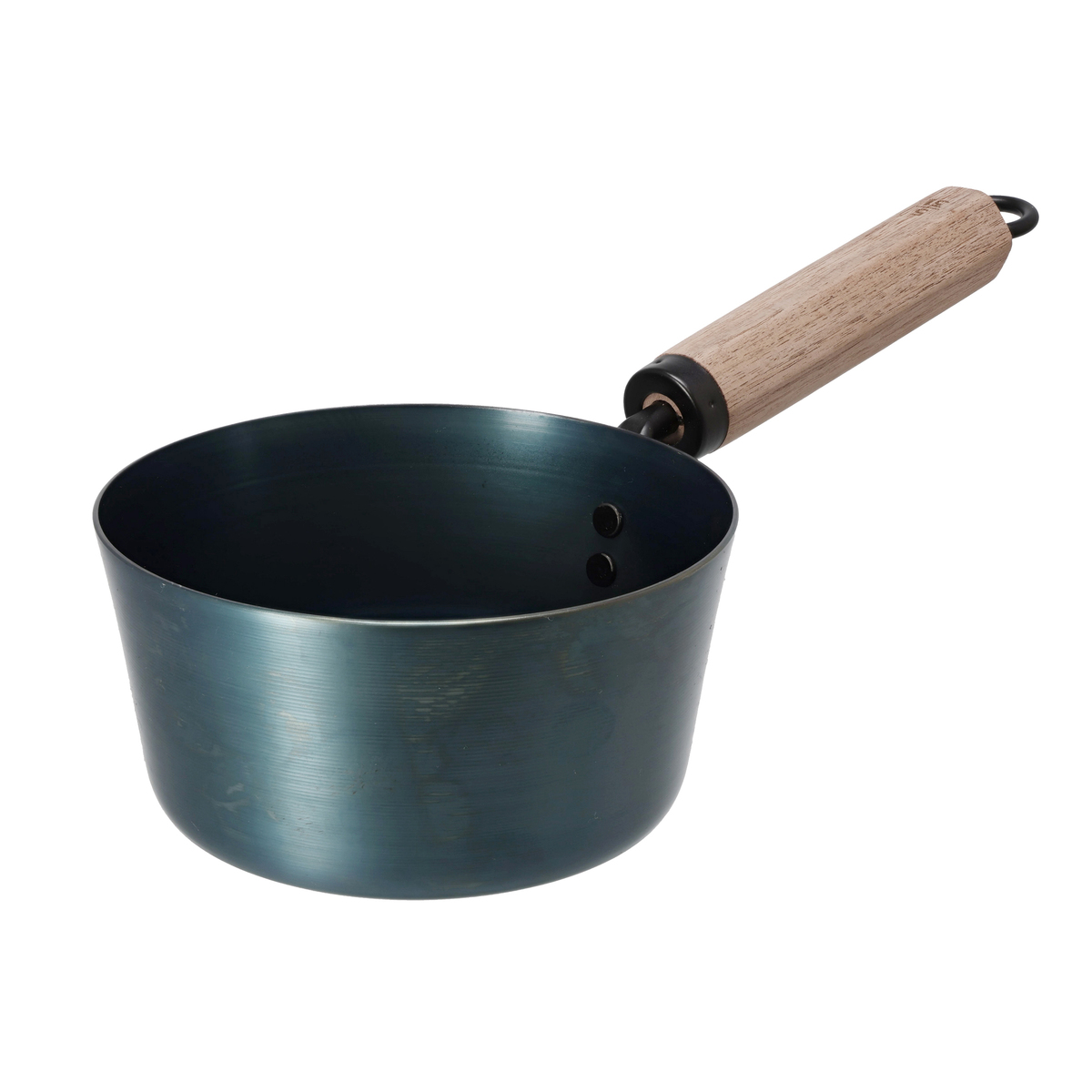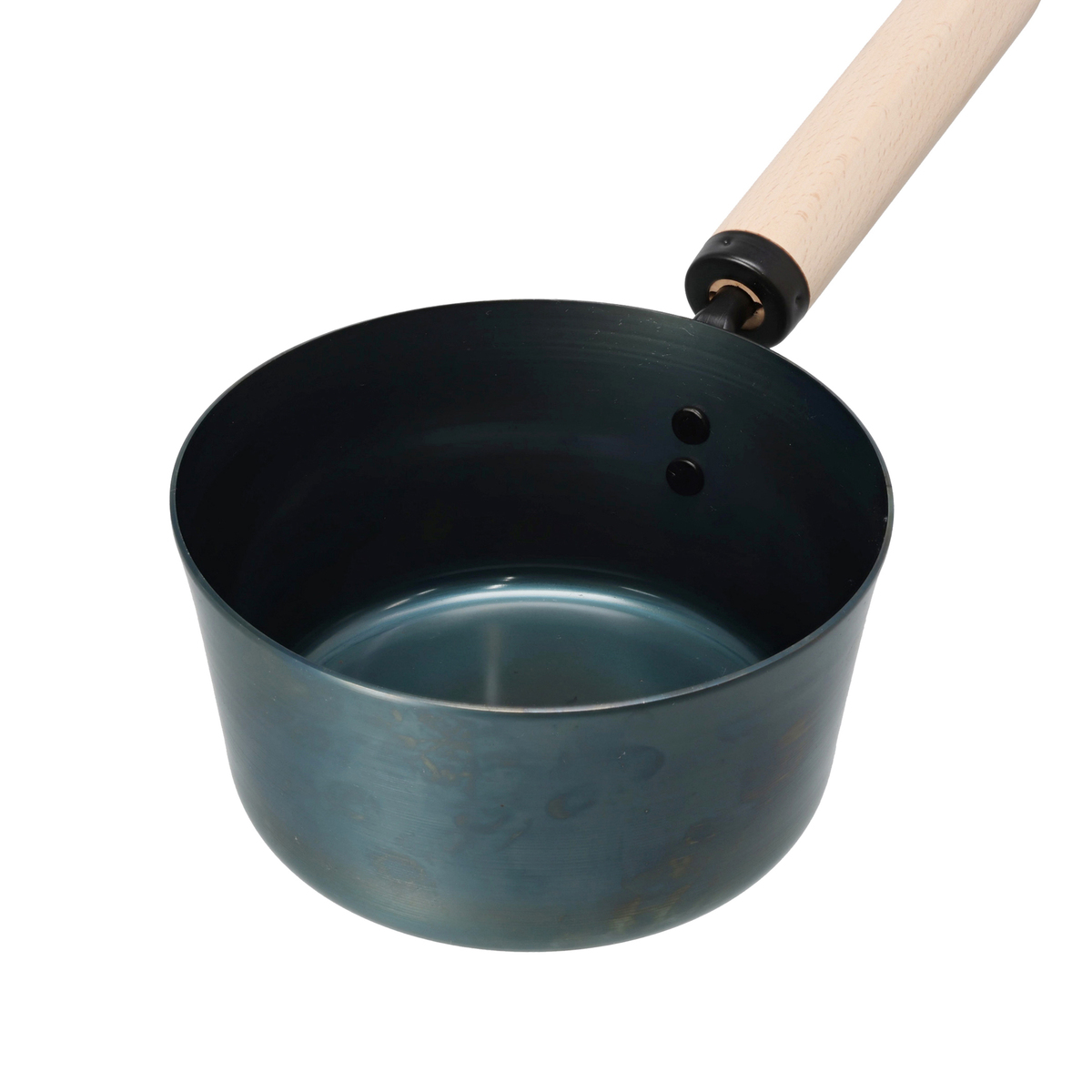 [サイズ] 内側直径:16cm 全長:35.5cm 深さ:8cm [重量] 約650g [満水容量] 1400ml [材質] 本体:鉄製(普通鋼板)(底の厚さ:1.4mm) 表面加工:ハードテンパー加工 取手:木製(天然木) [使用方法] ・本製品は製造工程上1つ1つ手作業でハードテンパー加工(焼付油ならし)しているため、温度、湿度や環境により「焼きムラ・黒い斑点」が出来てしまいます。使用上問題有りませんのでご了承ください。お手元に届きましたら食器用洗剤で鍋を洗いその後、水気を十分に取り油をひいてご使用ください。また、すぐにご使用にならない場合は洗浄後水気を十分に取り鍋全体に食用油をひいて保管してください。ハードテンパー加工は鉄本来の難点を改善した「こげつきにくく、サビにくい」弊社独自の加工方法です ・本体が冷たいままの状態で具材を入れ調理しますと、こびりつきやすくなりますので、本体全体の温度が上がってから調理してください ・使用中、本体が強く熱せられる箇所とそうでない箇所で表面の色が違ってきますが、これは異常ではありません。鉄の持っている特性ですのでそのままご使用ください <使い方のポイント> 1.調理後はすぐに料理を別の容器に移してください。料理を長時間鍋にいれたままにしておくと、鉄臭くなり、鍋表面の酸化被膜が剥がれ、サビてしまう事があります 2.長期保存をする場合は、水分が残っているとサビの原因になるので、乾燥させた状態で保管してください。新聞紙など吸湿性の良い紙に包んで保管するのもおすすめです ■IH200V迄・電気調理器 対応可 ■取り扱い説明を十分にご確認の上、ご使用下さい 【日本製】 [注意事項] ※使用不可:取っ手取外し、漂白剤、食器洗い機、電子レンジ、オーブンレンジ ※長期の使用により取手取り付けネジがゆるんでくる事があります。必ず再度、強く締め直してからご使用ください ※フライパンで揚げ物、天ぷら料理をしないでください。(深型で揚げ物料理対応は除く) ※「急加熱、急冷却」することにより本体中央部が膨らむのとひび割れの原因になりますので「急加熱、急冷却」しないでください。万一、膨らんでもガタつきはございますが、使用上問題はございません。一度膨らむと修正ができないのでお気を付けください ※電磁調理器は本体底面をドーナツ上に発熱していますので、この部分が高温になり、こげやすくなりますので火力調節に注意してください ※調理中は本体のそばからはなれないようにしてください。火災の原因となります [お手入れ] 調理後、鍋が温かいうちに、タワシやささら等を使って、洗剤を使わずにお湯で洗ってください。洗浄後は火にかけて水気を飛ばし、鍋の内側に油を薄く塗ってください。 ◆頑固な汚れ、焦げ付き、サビを落とす方法 1,食器洗い用スポンジの裏面の研磨面や金たわしを使ってゴシゴシと磨いてこすり落としてください 2,表面の油膜を取り除き、水洗いして、水気を拭き取ってください 3,フライパンを火にかけて、強火で全体を加熱してください 4,もう一度水で洗って水気を取り、火にかけて強火で加熱します 5,玉虫色に焼けたら火を止め、熱が冷めてから油慣らしを行ってください。 この手入れは何回やっても(つまり何回失敗しても)さしつかえありません。鉄は表面に何もコーティングしていないタフな素材だからです。何回でも玉虫色の酸化皮膜がよみがえりますので、安心してお使いください ※こすり傷が着きますが使用には問題ありません 油ならしの方法 ※ガスコンロの場合 1,鍋をガスコンロに置き、火をかけて充分に熱します。(中火以下で底面から炎が出ない程度) 2,大さじ4〜5杯程度の油を入れて、鍋の肌(内側全体)に油をなじませます 3,全体が黒っぽく変化したら、火を止め油をオイルポットに戻し、コンロの上でゆっくり冷却させます ※変形するので加熱後は水で急冷しないでください 4,キッチンペーパーで内側を油がなじむように拭いてください。しばらく使わない場合は外側も軽く拭いてください