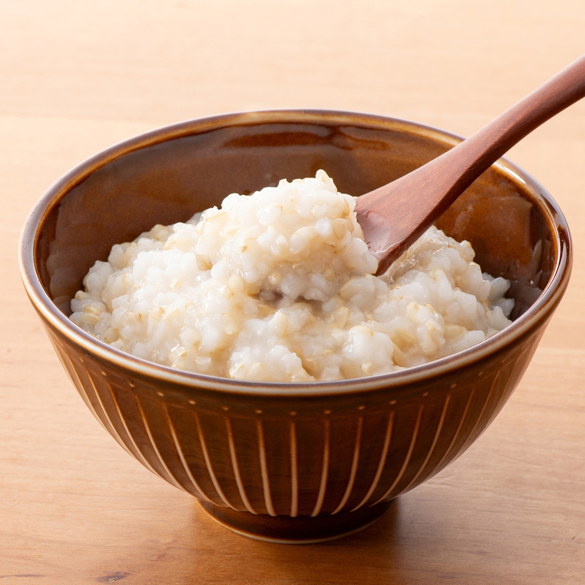 白がゆはほんのり塩味のある味わい。玄米がゆは玄米ならではの食感と風味が特徴。どちらもシンプルな味でアレンジもしやすく、どんなおかずにもよく合います。温めずに冷たいままでも美味しく食べられます
