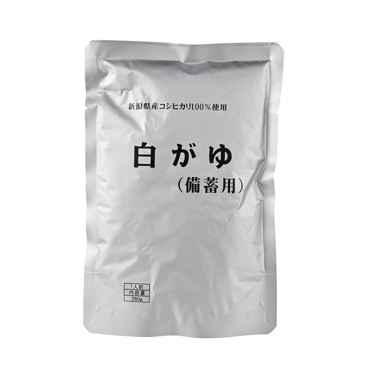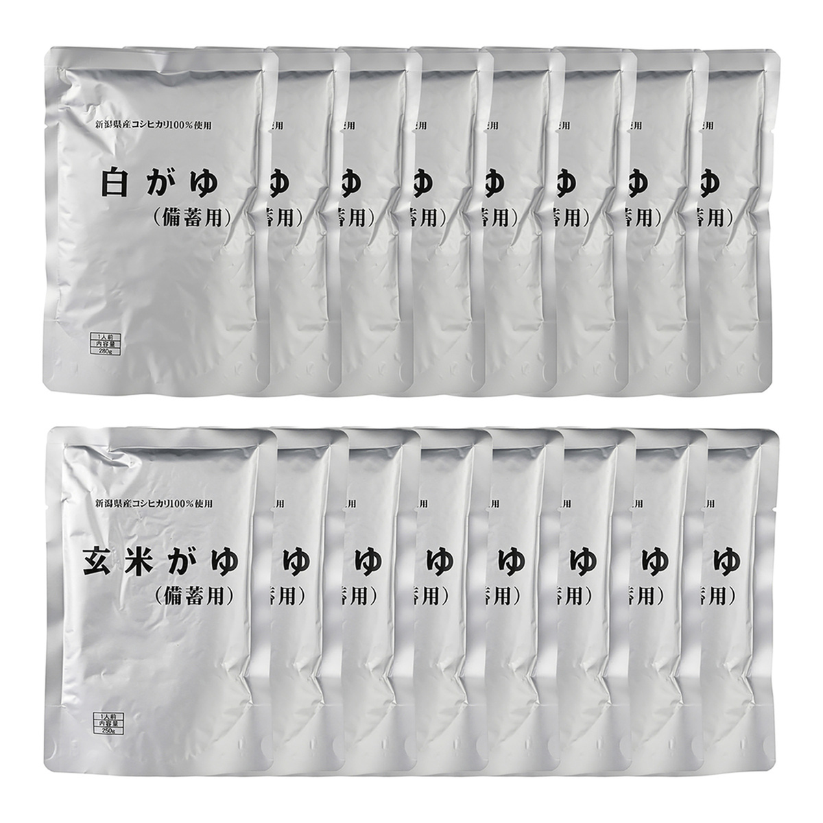 [アレルギー物質特定原材料8品目] なし [商品内容] 白がゆ[備蓄用](280g)×8パック 玄米がゆ[備蓄用](250g)×8パック [保存方法] 開封前:直射日光を避け、常温で保存してください 開封後:お早めにお召し上がりください [お召し上がり方] ・温めずに冷たいままでもおいしく召し上がれます <温める場合> ・袋の封は切らずにそのままふっとうしたお湯の中に入れ5分間加熱してからお召し上がりください ・電子レンジであたためる場合、必ず袋から出し深めの皿に開け、ラップをかけてから加熱してください [注意事項] ※加熱直後は熱いのでお気をつけてください ※開封時に切り口で手を切らないようご注意ください ※ゴミの分別は各市町村の区分に従ってください [原料原産地] 白がゆ:うるち米(新潟県産コシヒカリ) 玄米がゆ:うるち玄米(新潟県産コシヒカリ) [原産国] 日本 [原材料] 白がゆ(備蓄用): うるち米(新潟県産コシヒカリ)、食塩 玄米がゆ(備蓄用): うるち玄米(新潟県産コシヒカリ)