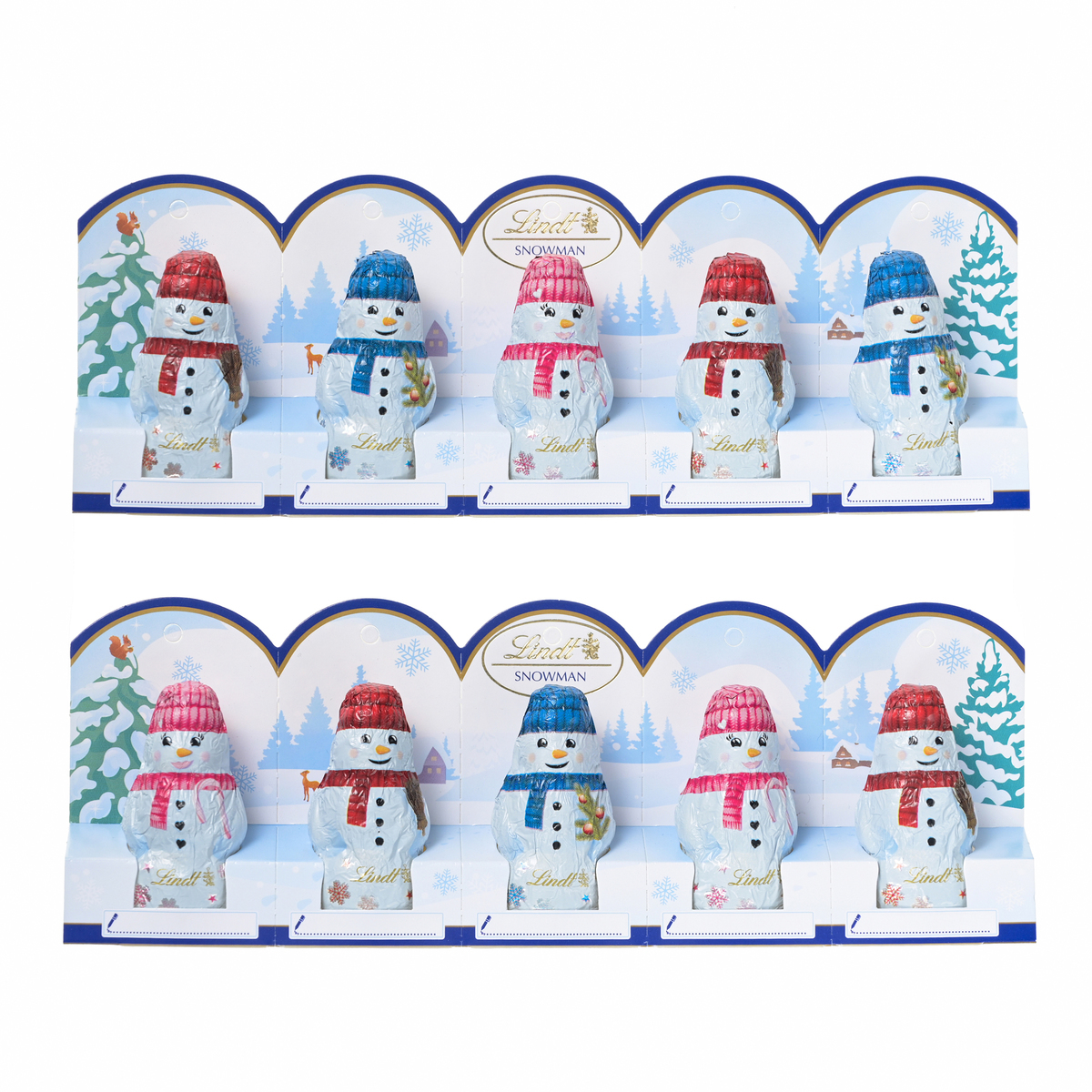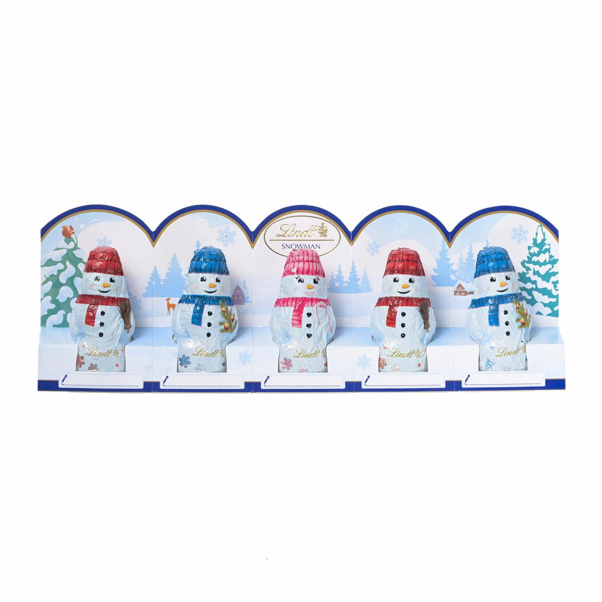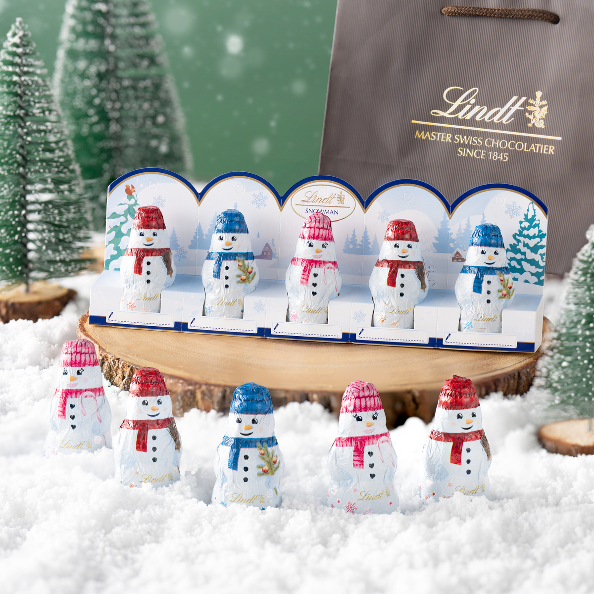 雪景色をバックに、ニット帽とマフラーを着用したスノーマン(1個約10g)のミルクチョコレート。スノーマンの台紙は1個ずつ切り離せる仕様で、紐を通してギフトのデコレーションにつけたり、オーナメントにしたり、5個を1個ずつ分けて使えます