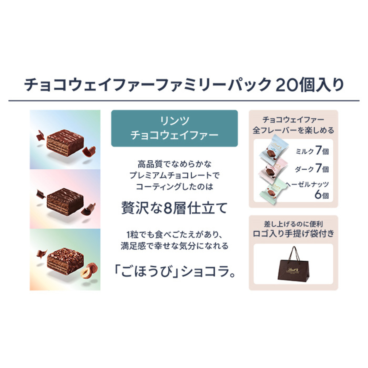 [アレルギー物質特定原材料8品目] 小麦、乳 [商品内容] ・チョコウェイファー ファミリーパック 20個入 ・ショッピングバッグ S [フレーバー] ・ミルク、ダーク 各7個 ・ヘーゼルナッツ 6個 [賞味期限] 出荷時点で賞味期限まで90日以上ある商品をお届けします [保存方法] 直射日光・高温多湿を避け、涼しい場所で保存 [原産国] イタリア [原材料] チョコウェイファー ファミリーパック 20個入: 砂糖、ココアバター、カカオマス、小麦、全粉乳、植物油脂、脱脂粉乳、ヘーゼルナッツ、乳糖、低脂肪ココア、ヘーゼルナッツペースト、麦芽エキス、塩、バニラビーンズ/植物レシチン、膨張剤、香料、(一部に小麦・乳成分・大豆を含む)