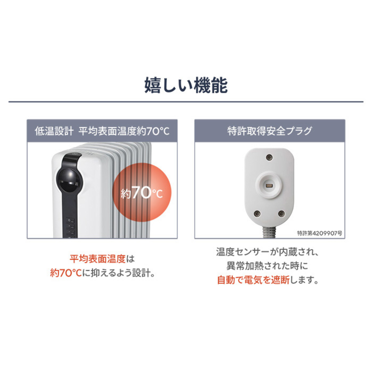 安全プラグが異常加熱(約80℃以上)したときに作動し、ヒーターの電源を切ります。壁面コンセントの老朽化やガタツキによる発熱、発火事故を未然に防ぐことができます(特許第4209907号取得)