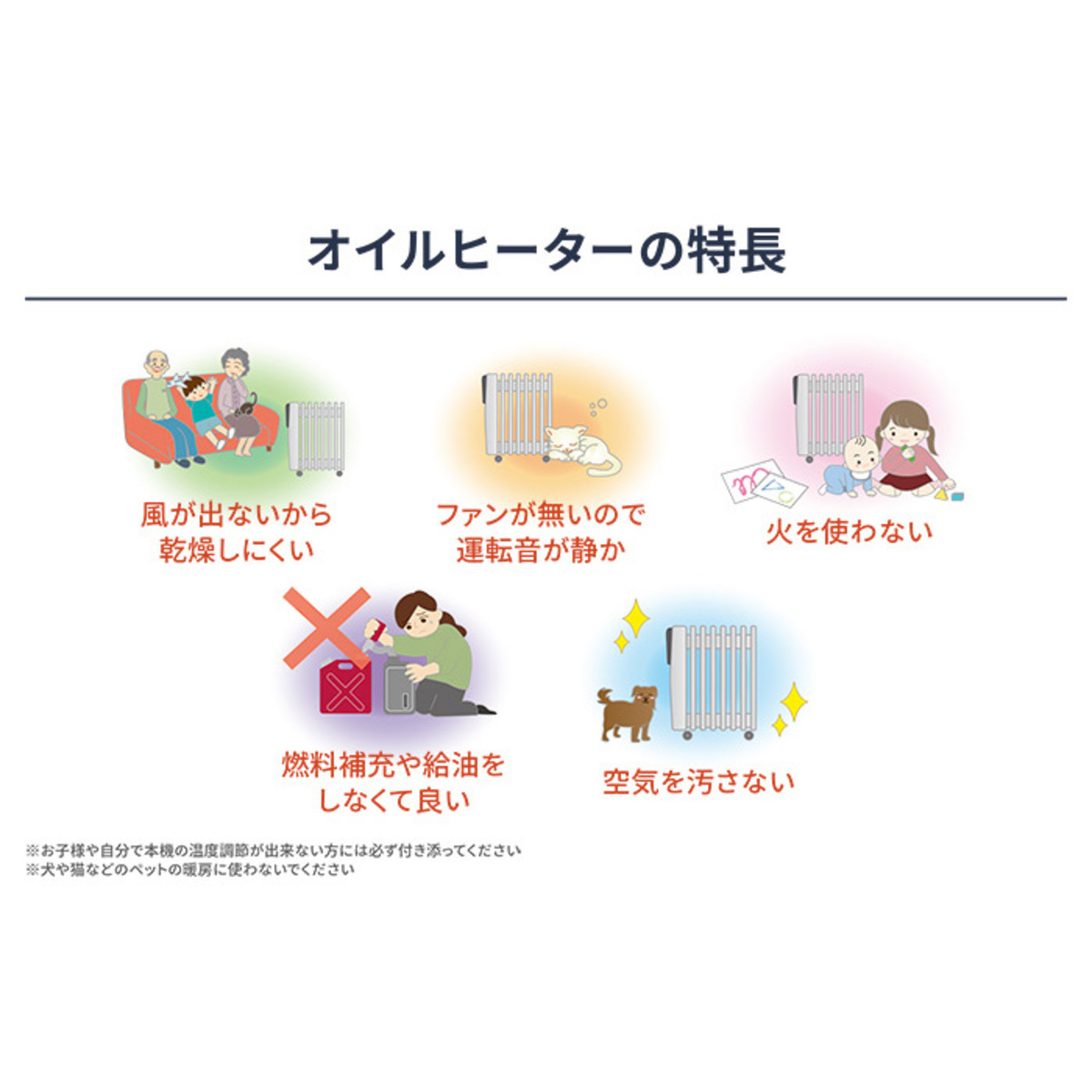 本体が密封されたオイルによってあたためられ、部屋全体に熱を伝えるオイルヒーター。燃料補充不要で、お手入れ簡単です。広さの目安は約8畳(*1)〜10畳(*2)。オイルヒーターの熱が冷気の侵入をブロックすることで暖房効果が高まるので、窓側や外気に触れている壁際に置くと効果的です