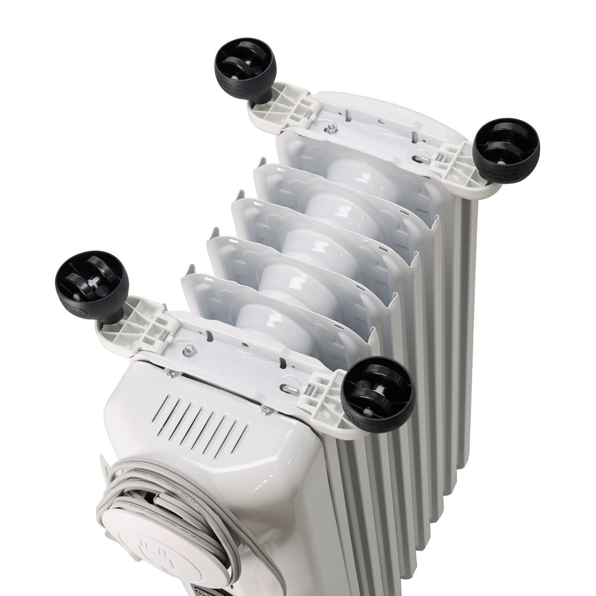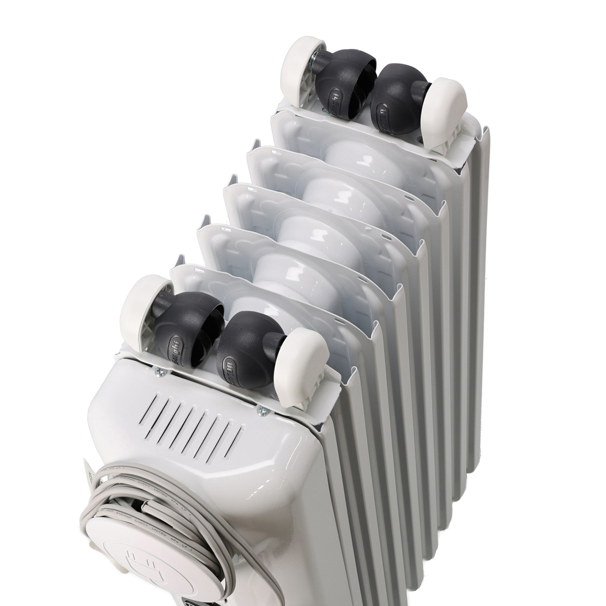 ラジエーター内部に密封したオイルを、本体下部にある棒状の電気ヒーターで温めます。温められたオイルはフィン内を循環、効率よく放射し、輻射熱と自然対流で室内を温めます。燃料を使わず、温風を出さないことで空気を汚さず、乾燥も気にならないのがオイルヒーターの一般的な特徴です