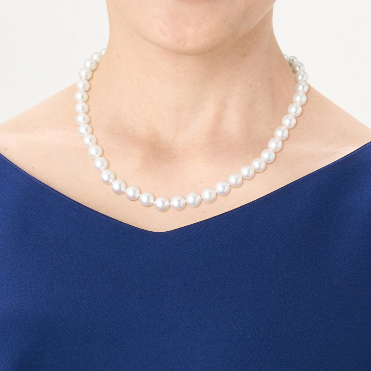 フォーマルからカジュアルなシーンまで活躍する、ネックレス&イヤリングまたはピアスのセット。テリが魅力的なセミラウンドのアコヤ真珠8.5mmUP珠を使用しました