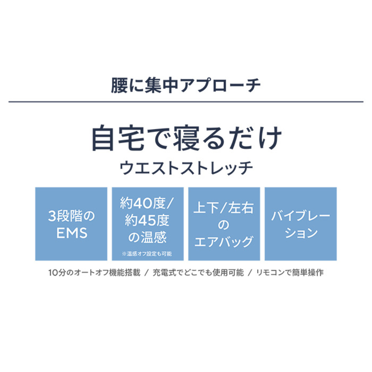 [商品内容] ・ウエストストレッチャー本体 ・アシストボード ・充電ケーブル(USB AーDCプラグ) ※ACアダプターは付属しません。定格出力DC5V/2A以上のものを使用して下さい [サイズ(約)] 本体:幅40×奥行17.2×高さ5.7cm アシストボード:幅42.5×奥行18.9×高さ1.9cm [重量(約)] 本体:1090g アシストボード:209g [材質] ABS樹脂、PP樹脂など [充電時間] 約3.5時間充電で約1時間使用可能 [耐荷重] 60kg [使用方法] 1.本体に仰向けに寝る 2.体の位置を調節する 3.電源をオンにする 4.リモコンで機能を選択する ■取り扱い説明を充分にご確認の上、ご使用下さい 【中国製】 [注意事項] ※下記の医療用電子機器をお使いの方は本製品を使用しない ・ペースメーカー等の体内埋込式医療用電子機器 ・皮下埋込式カテーテル ・人工心肺等の生命維持用医療電子機器や心電図等の装着型医療電子機器 ・その他、体内に装着する医療用電子機器 ※下記に該当する方は本製品を使用しない ・意志表示ができない方 ・幼児や成長期の子供、ご自身で説明書の内容を理解できない方 ・神経障害、皮膚知覚障害がある方 ・交通事故などにより、腰に障害がある方 ※下記のような方は医師に相談の上、使用する ・生理中や妊娠中、出産直後、授乳中の方 ・腰の手術を行った方、腰に傷のある方 ・今までに重い病気を患ったことがある方 ・脊椎の骨折、捻挫、肉離れなどがある方 ・急性疾患の方 ・悪性腫瘍のある方 ・感染症疾患のある方 ・有熱性疾患のある方 ・糖尿病など高度な末梢循環障害による知覚障害のある方 ・身体に異常を感じている方 ・骨粗しょう症の方 ・その他医療機関で治療中の方 ※上記に当てはまらない場合でも、使用に不安がある方は医師に相談する ※使用中に携帯電話などの電子機器を使用しない ※他の美容機器や医療機器と併用しない ※充電ケーブルは根元まで確実に差し込む ※コネクター部分を接続する際は、まっすぐ挿入する ※充電ケーブルが傷んだり、コンセントの差し込みがゆるい時は使用しない ※ぬれた手で充電ケーブルの抜き差しをしない ※汚れ、ほこりなどは乾いた布で拭き、定期的に清掃する ※充電ケーブルを水につけたり、水洗いしたりしない ※充電ケーブルを風呂・シャワー室など水回りで使用、充電しない ※充電ケーブルを傷つけたり、破損したり、束ねたり、加工したりしない ※充電ケーブルに重い物を載せたり、引っ張ったり、無理に曲げたりしない ※コンセントや配線器具の定格を超える使い方をしない ※付属の充電ケーブル以外は使用しない ※使用しないとき、清掃のときは必ず電源を切って、充電ケーブルをコンセントから抜く ※万が一、異常が発生したら直ちに電源を切る ※内蔵電池が漏液して、液が目に入った場合、擦らずに水道水などきれいな水で十分に洗う (感電、ショート、発熱、発火、破裂による火災などの原因)(お肌、身体を傷める原因) ※本製品の取り扱いに関し、下記の内容を必ず守る ※充電式電池内蔵のため、火中投入・加熱および高温での充電使用・放置保管はしない ※重い物を置いたり、強い衝撃を与えない ※不安定な場所に置いたり、落としたり、ぶつけたりしない ※分解や修理、改造をしない ※防水仕様ではないため、浴室や浴槽、シャワー室、洗面台または水の入った容器の近くで使用したり、充電したりしない ※水につけたり、かけたり、水洗いしたりしない ※異臭、異常発熱した時は使用しない ※取扱説明書に記載されている用途以外には使用しない ※電極パッドに充電ケーブルや金属類を接触させない ※電気こたつの中や電気カーペットなどの暖房器具の上では使用しない ※使用前に本体裏側の布地に破れがないか必ず確認する (感電、ショート、発熱、発火、破裂による火災などの原因) ※タイマーが止まったら使用を止め、長時間腰をのせたままにしない ※睡眠時には使用しない ※次のような場所で本製品の使用・保管はしない ※ほこりの多い場所 ※高温、多湿、直射日光の当たる場所(車中・浴室など) ※油煙、湯気の当たる場所 ※強い電波や磁気の発生する場所 ※乳幼児の手の届く場所 ※引火性のもの(アルコール、シンナー、ベンジン、除光液、スプレーなど)の近く (事故や故障の原因)