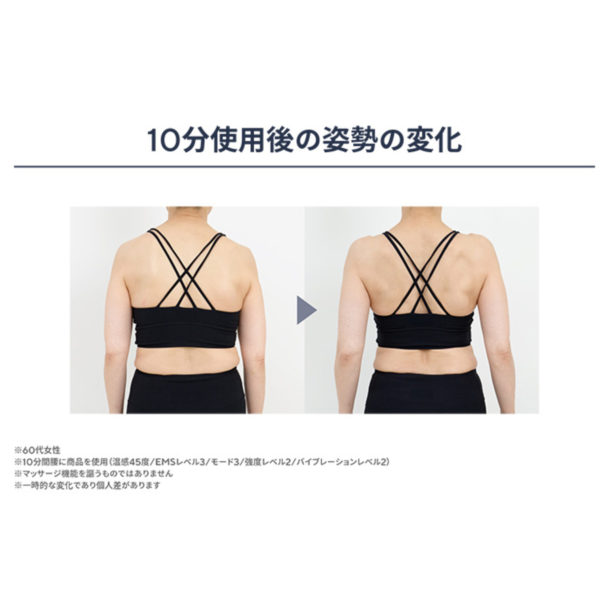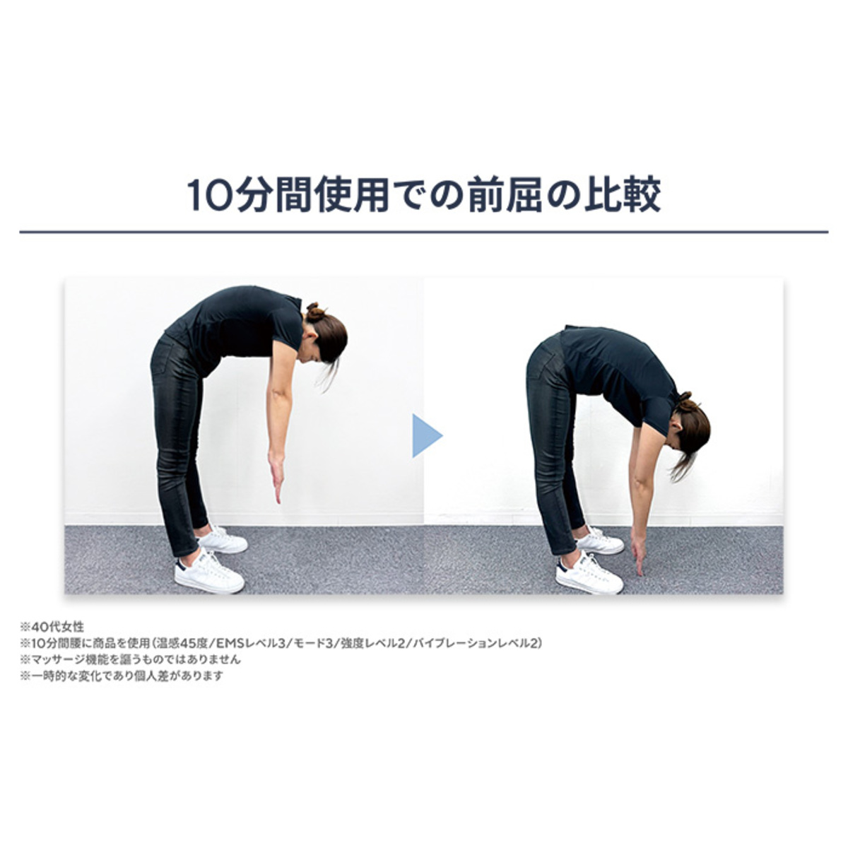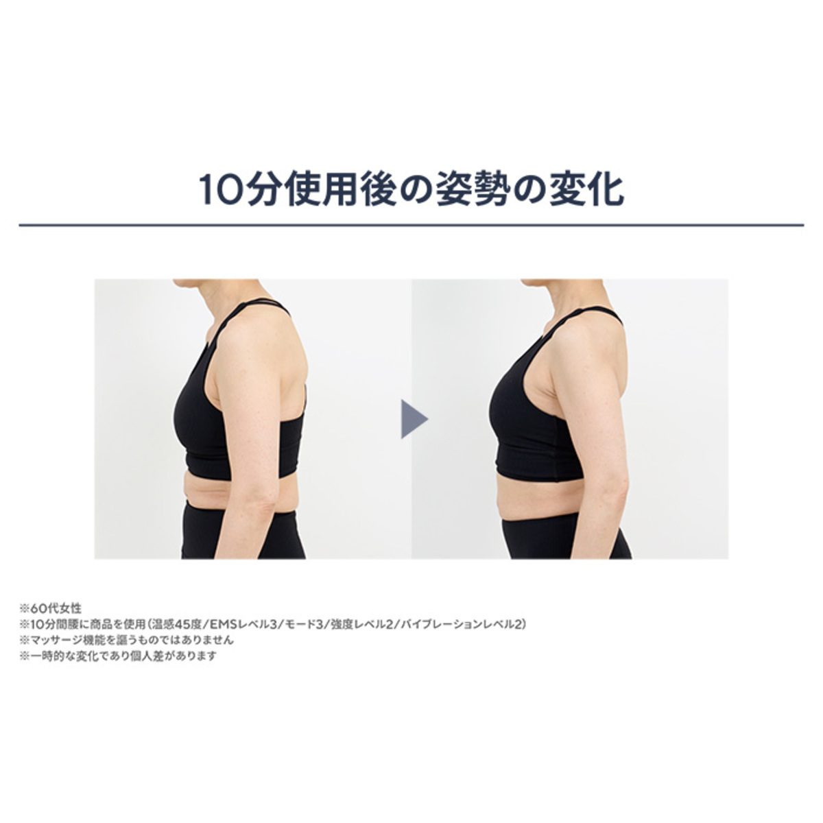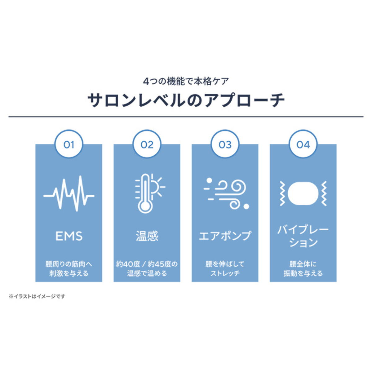 3段階のレベル調節が可能なEMS機能や、レベル1(約40度)レベル2(約45度)の温度調節が可能な温感機能、バイブレーション機能も搭載し、筋肉への刺激や部位を温めるケアも選択できます。腰以外にもふくらはぎや足裏にも使えます