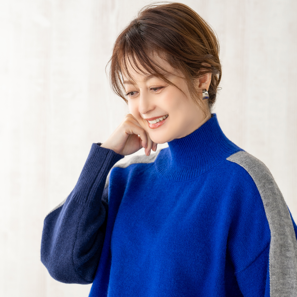 大胆な配色ブロッキングがモードな雰囲気を演出するニットプルオーバー。視線を縦に流すデザインで自然とすっきり見えし、気になる体型もさりげなくカバー。落ち着いた色合いながら、着るだけで華やぐ存在感が魅力です