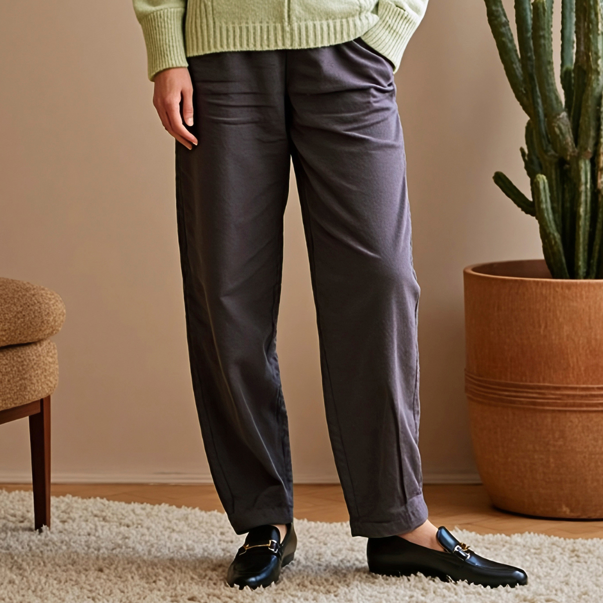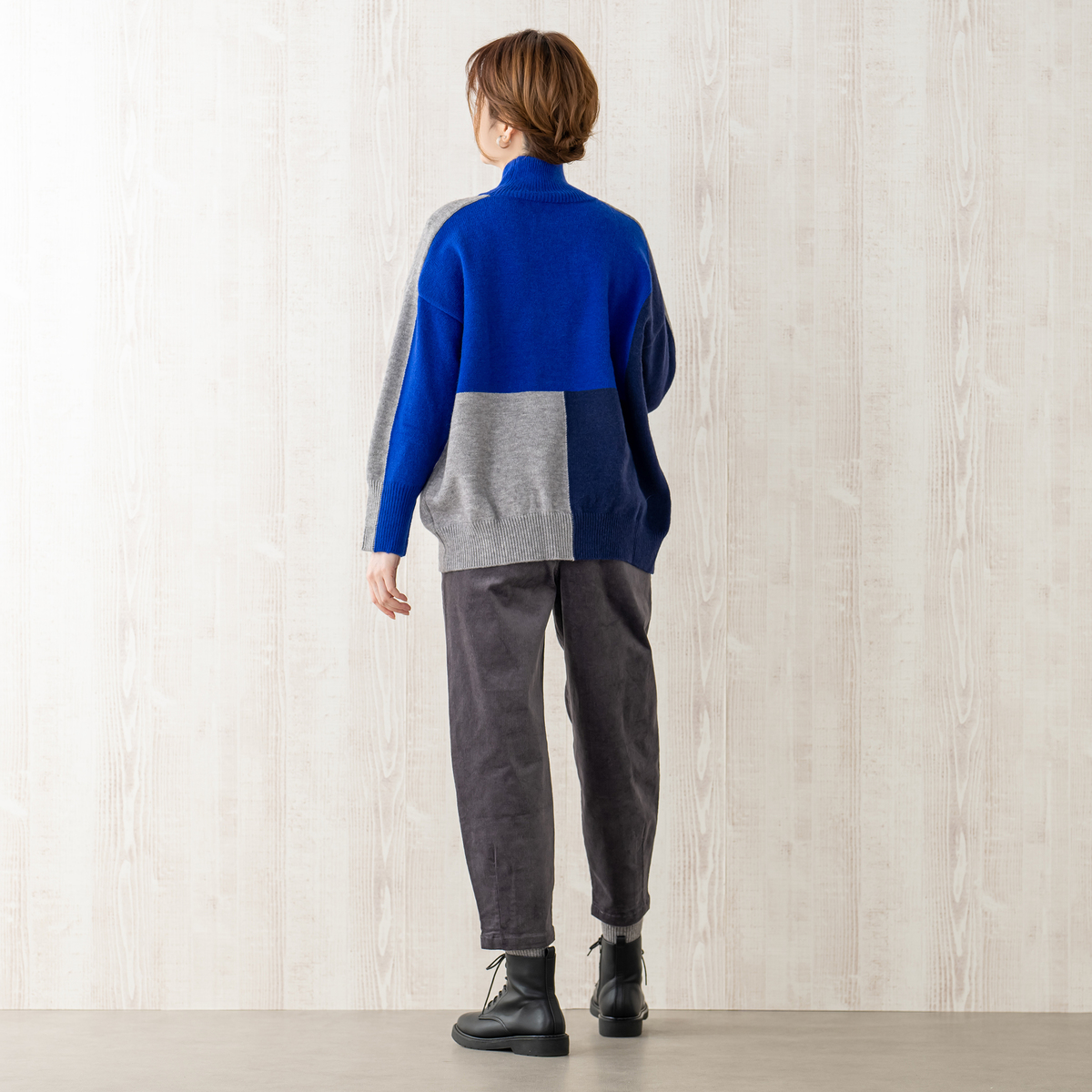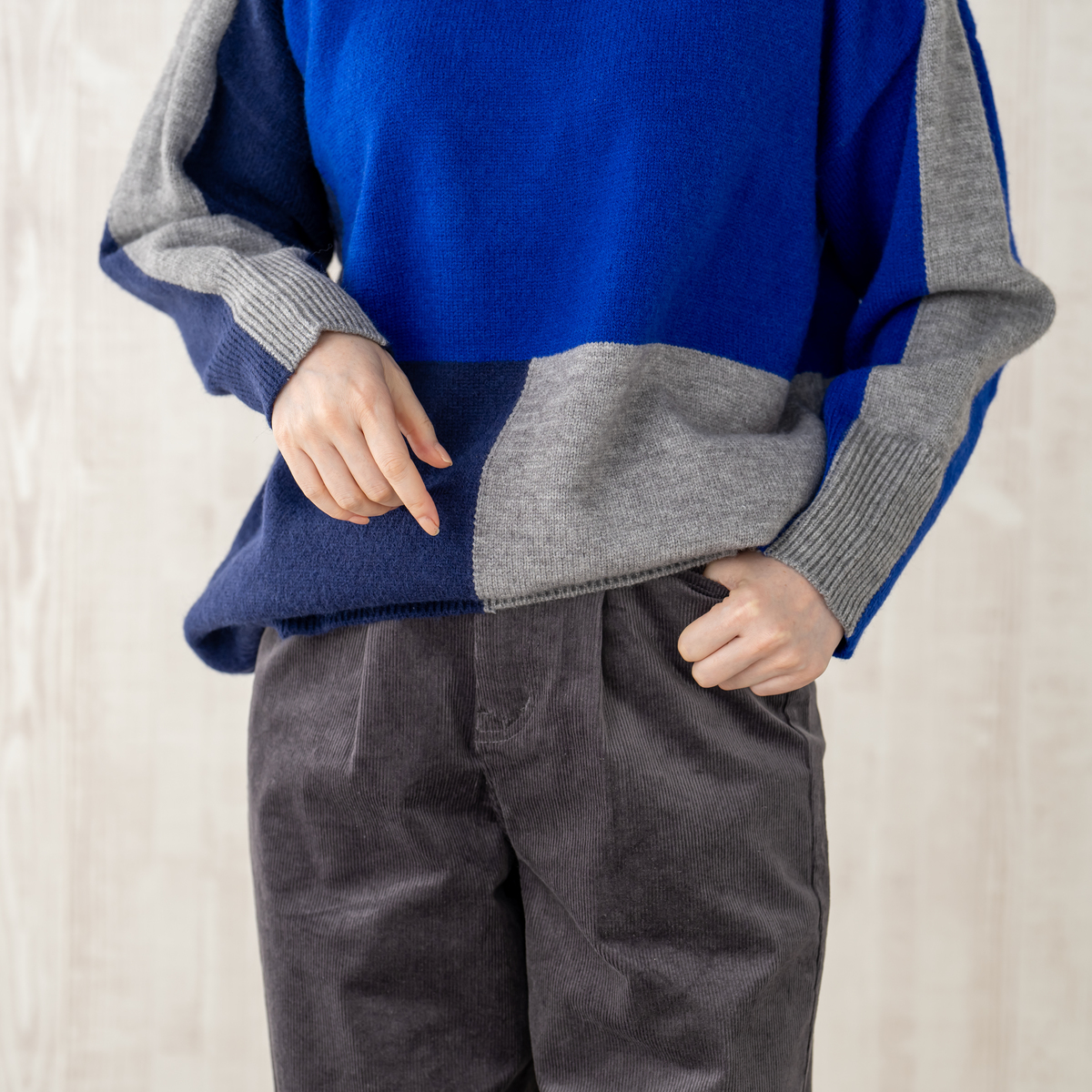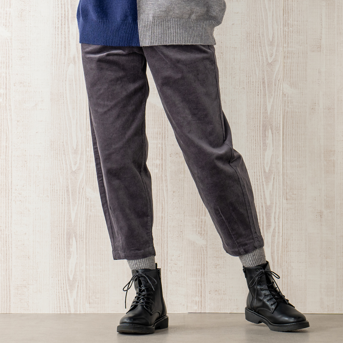 カジュアルになりがちなコーデュロイパンツを、ゆるやかなコクーンシルエットで、洗練された印象に。太ももにゆとりを持たせつつ、裾へ細くなるラインがヒップや太ももをふんわり包み込み、脚をすっきり見せます