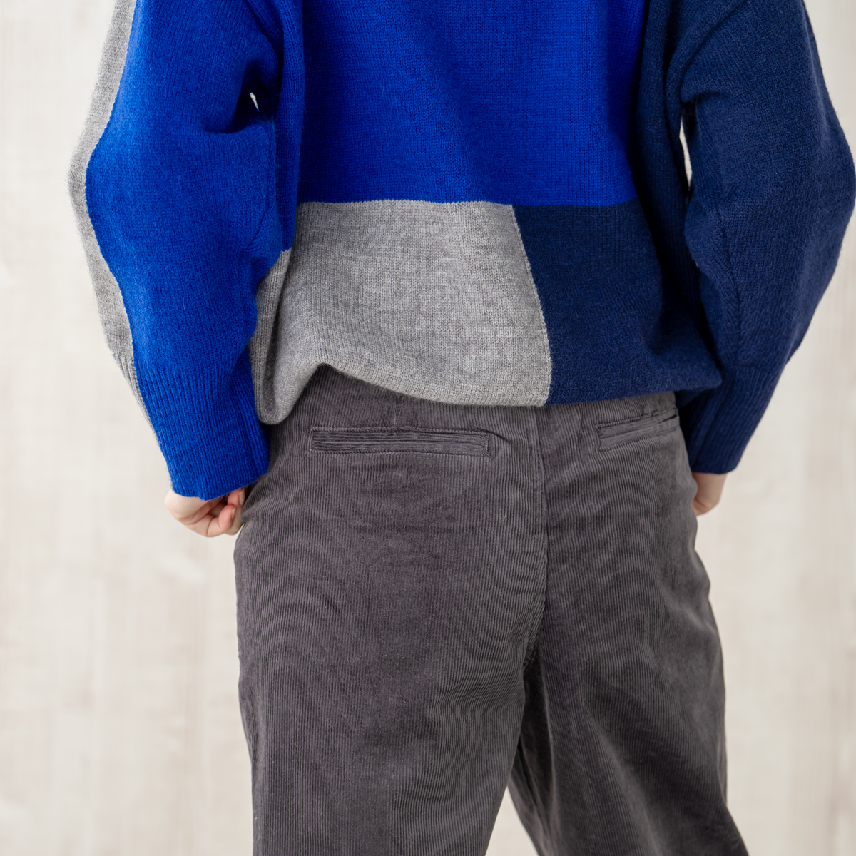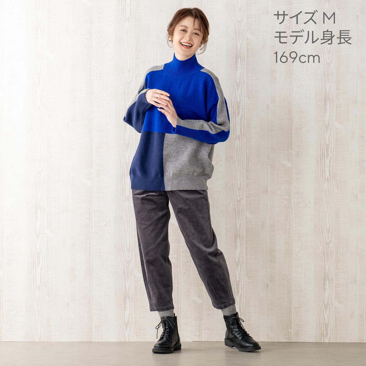 綿を中心に、レーヨンやポリウレタンをブレンドした上質なコーデュロイ素材を使用。ふんわり暖かい手触りで、寒い季節も快適です。ウエストは後ろゴム仕様で締め付け感が少なく、ずり落ちにくい設計。前ファスナー付きで着脱もスムーズです
