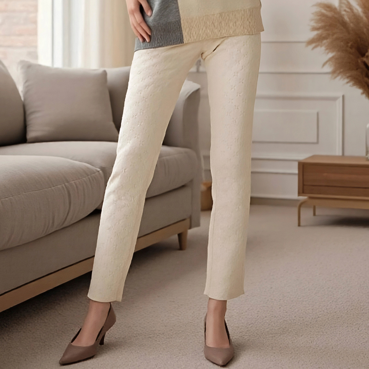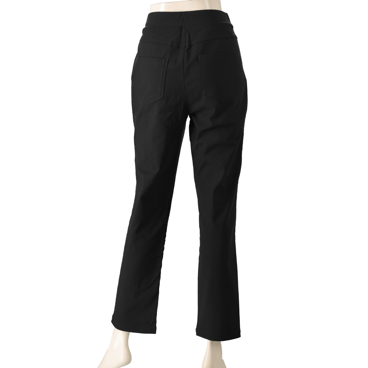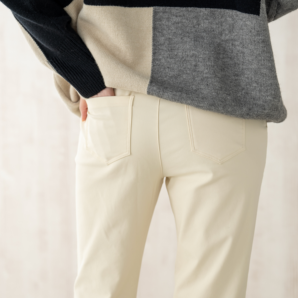 エンボス加工中わた入りパンツ。前面には光吸収保温性のある中わたを採用し、下半身を冷えから守ります。後ろ側はストレッチ性のある裏起毛素材で動きやすく、着ぶくれ感を抑えたスマートなシルエットに。寒さ対策もスタイルも、これ1本で