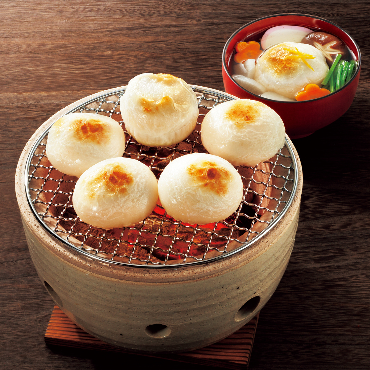 蒸したもち米を杵でつき、粘りとコシのあるお餅に。丸い形なので焼き餅や雑煮はもちろん、うどんやそばの具材としても活躍します